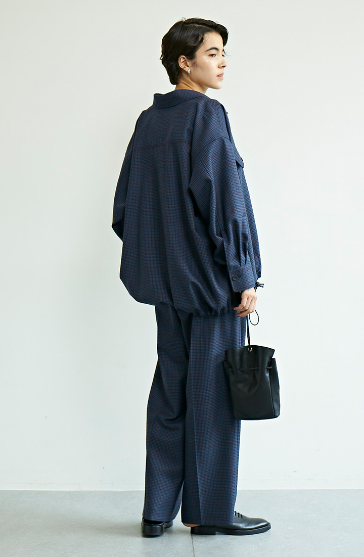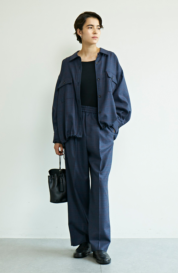 セットアップになる、共布のパンツが用意されています。上下でまとえば、かしこまらない「崩しスーツ」ライクな着映えに。原型は軍用ジャケットだけに、メンズ風のムードが漂います。あえてフェミニン寄りの巾着型バッグを携えて、ジェンダーレスに整えるさじ加減がこなれ感を引き出します。