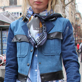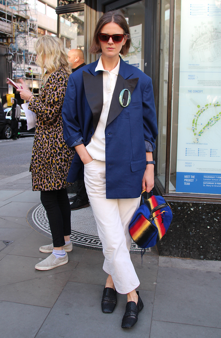 メンズ由来のポロシャツに、トラッド風ジャケットを羽織った、お手本的なジェンダーレスの装いです。白のパンツと合わせて、スポーティなムードをプラス。マニッシュな革靴も相乗効果を発揮。マルチカラーのボストンバッグが差し色を加えました。男っぽさをまといながらも、ジャケットの袖まくり、素足の足首見せと、ヌーディ感も盛り込んで、全体のバランスを整えるあたりがさすがのファッショニスタ技です。