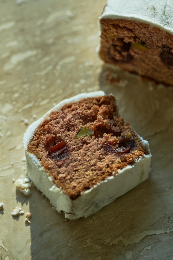 この冬、ガリャルダガランテ限定で薔薇、グリオット、ピスタチオのシュトーレソをお作りいただきました。口に含むと、薔薇、薔薇、薔薇……! ほろっとした食感に加えて薔薇の香りの長い余韻を楽しむことができます。既存のシュトーレンのイメージを覆す、華やかな香りが際立つシュトーレソ。ぜひ少しずつじっくりお楽しみください。