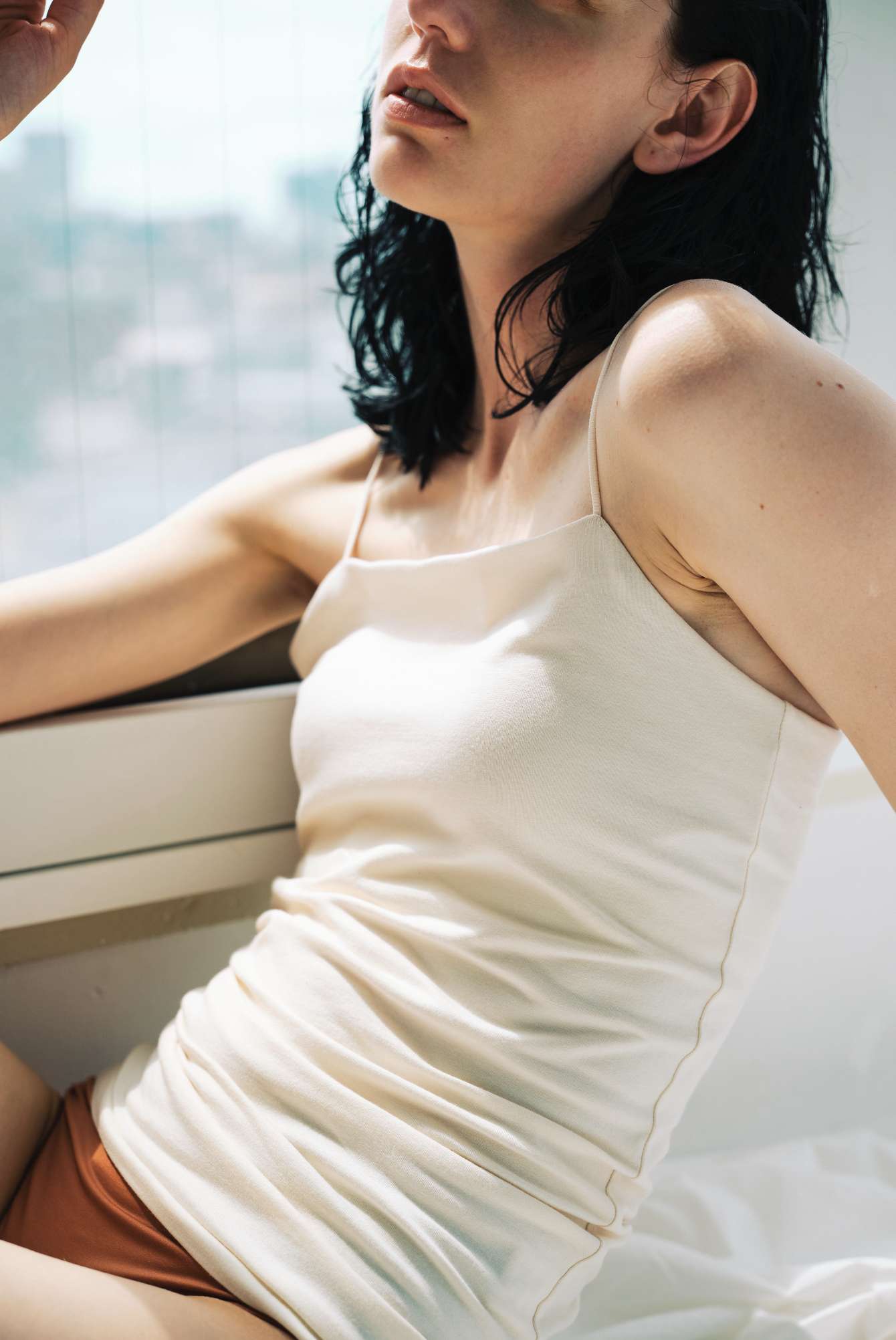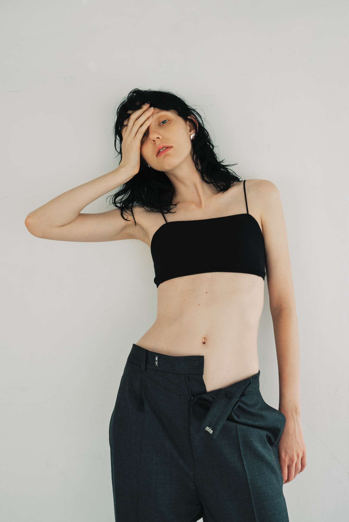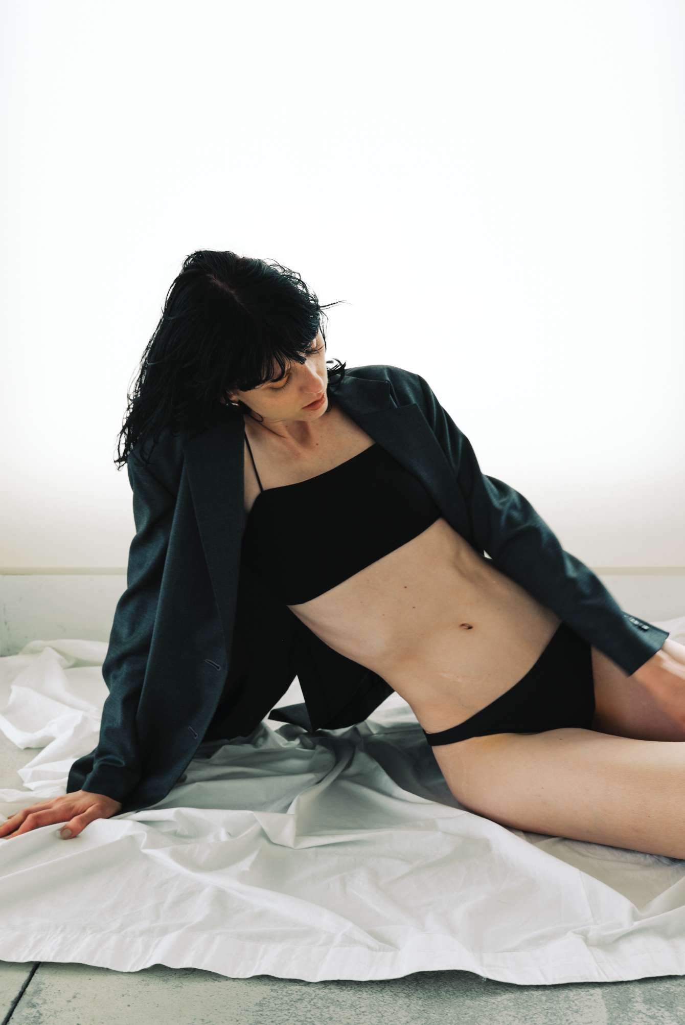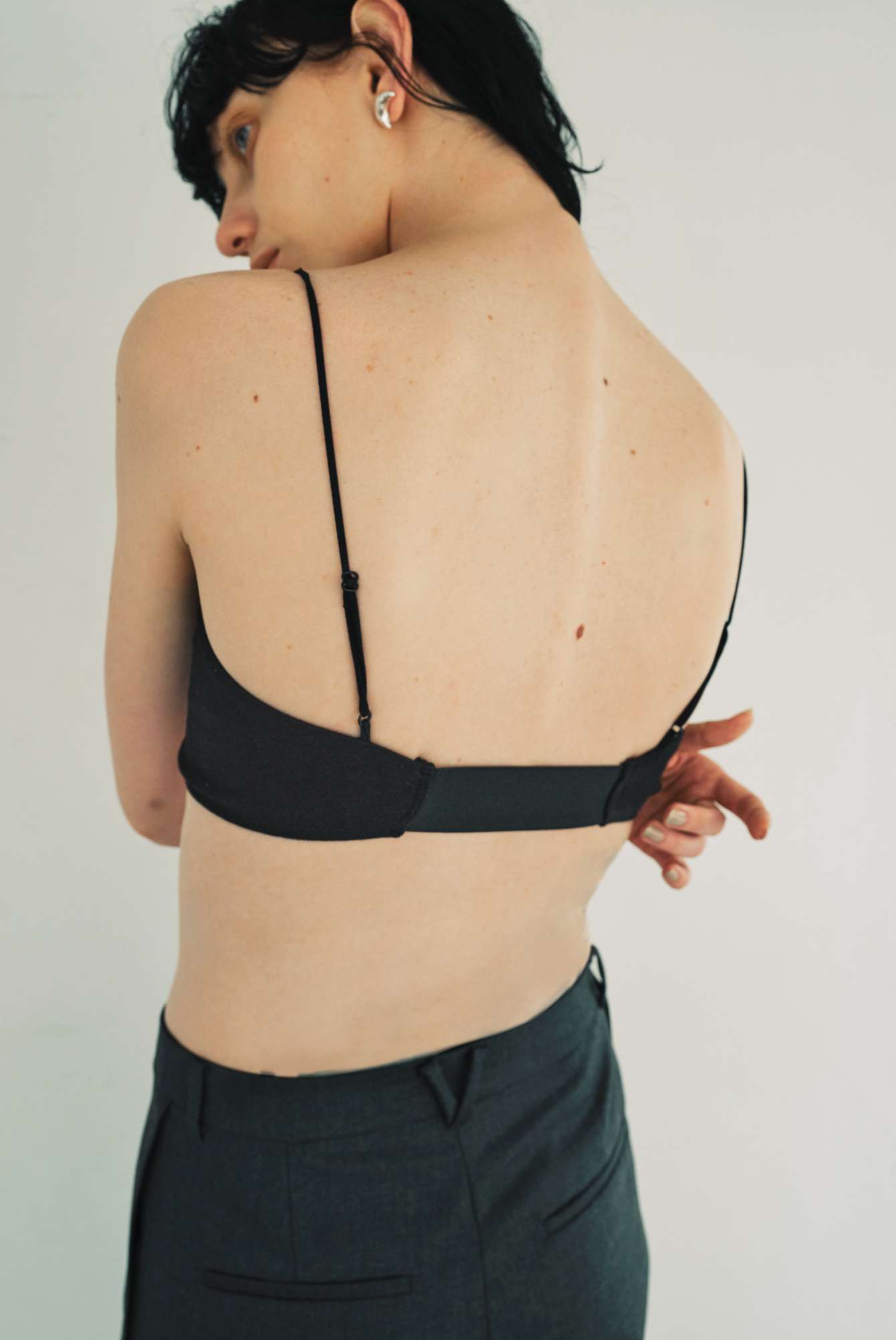 細くてスタイリッシュな肩紐や、クールでありながら女性らしい襟ぐりのカッティングなど、“ファッションの内側”であると同時に“ファッションの一部”であることを感じさせる、洗練されたデザイン。