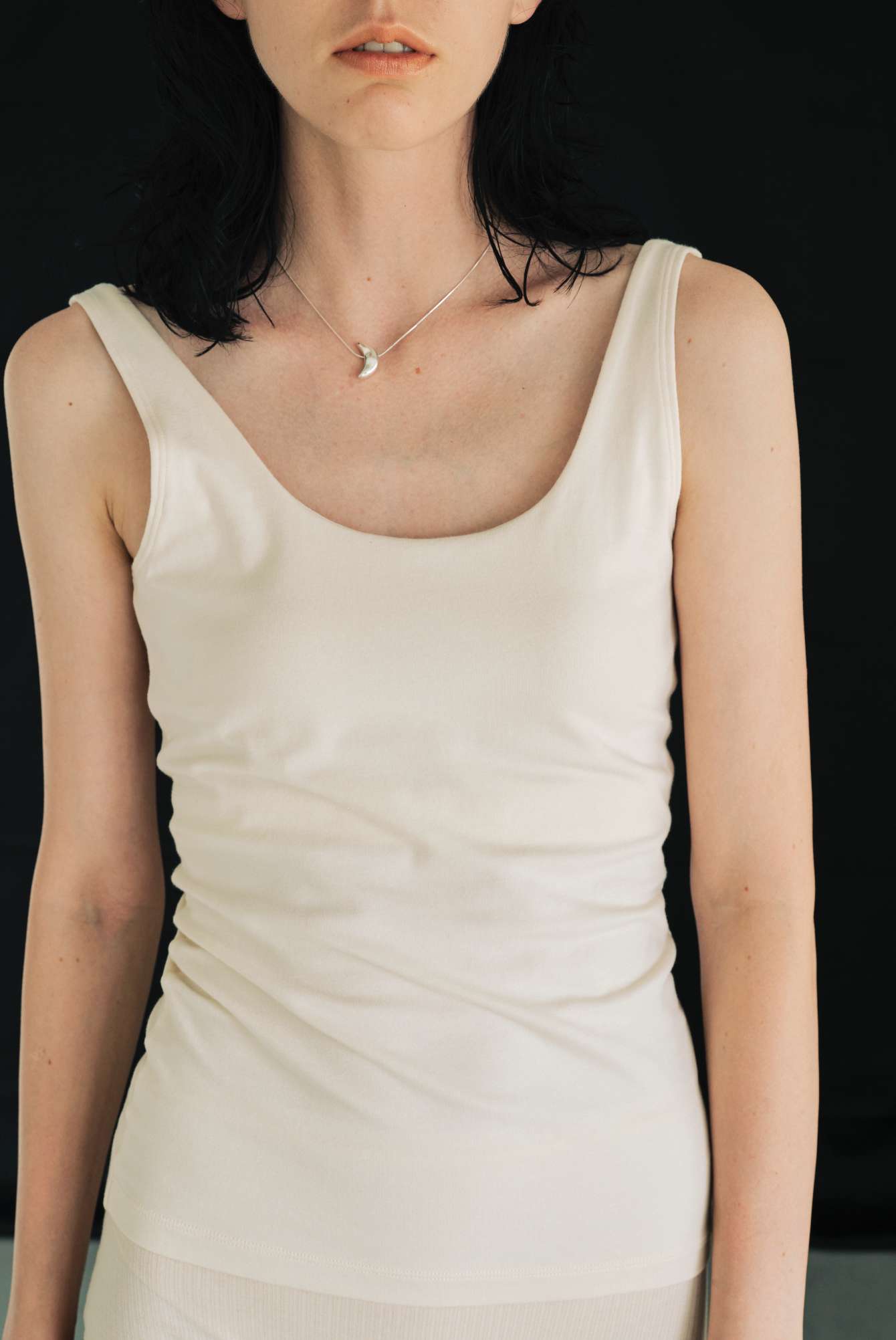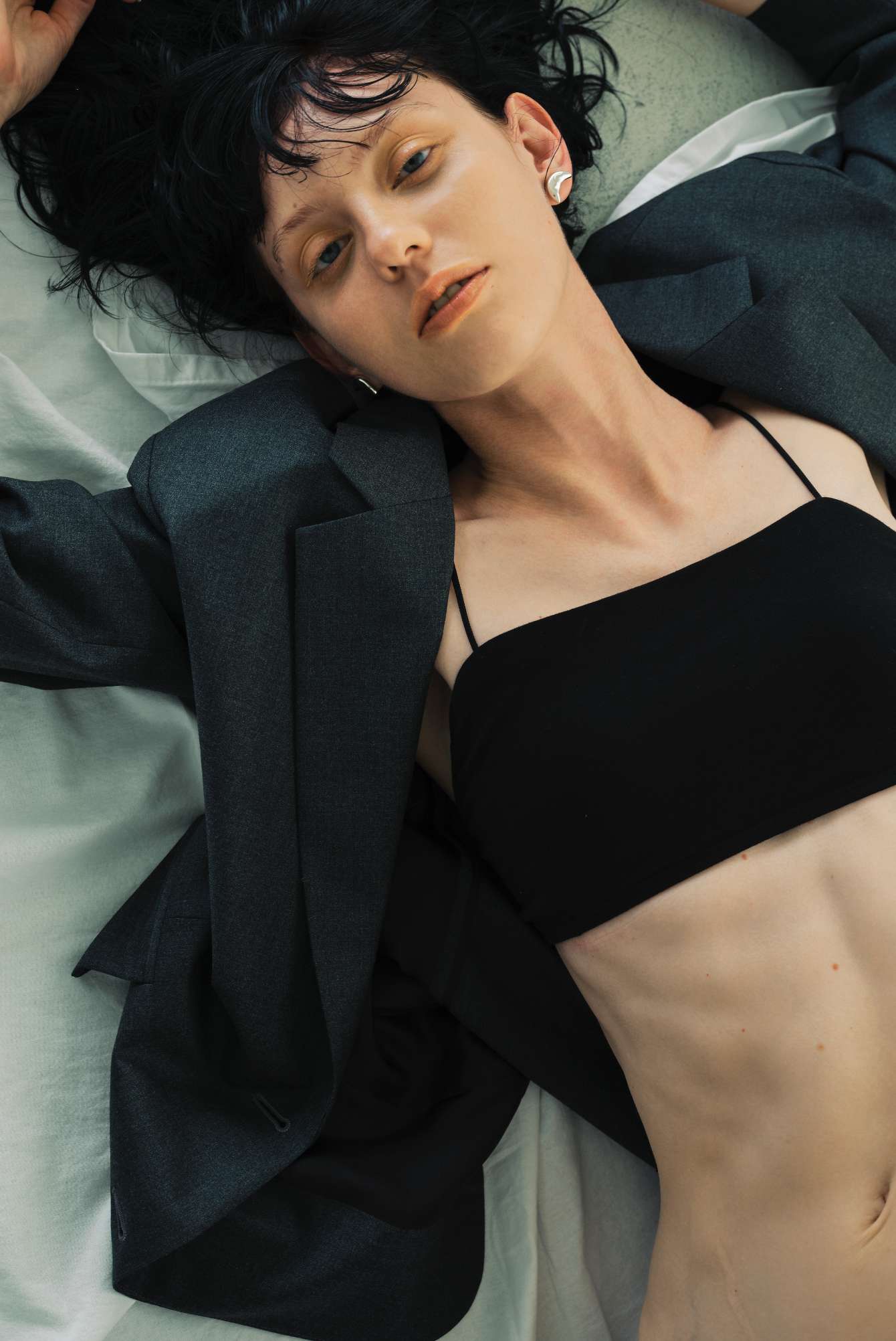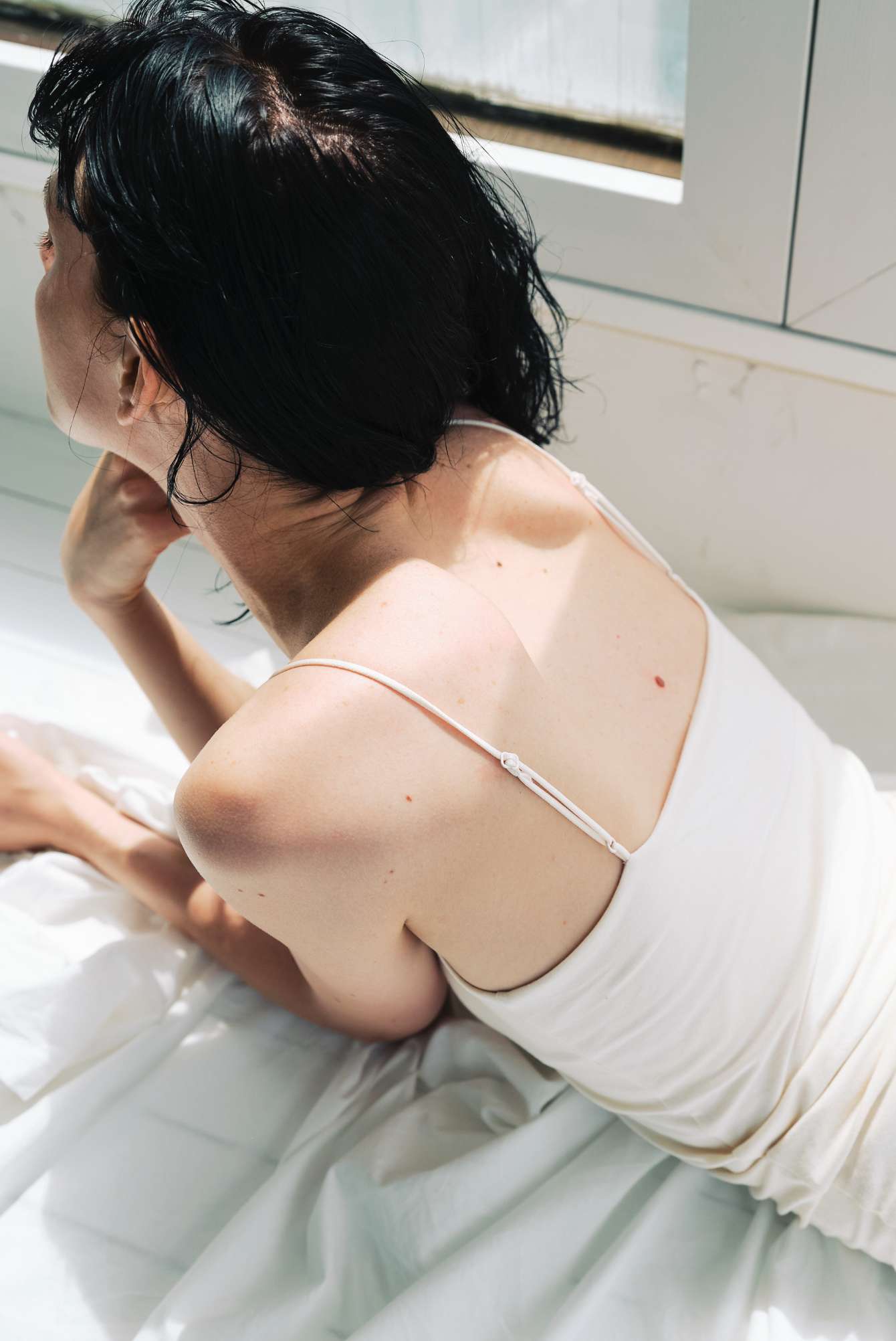 細くてスタイリッシュな肩紐や、クールでありながら女性らしい襟ぐりのカッティングなど、“ファッションの内側”であると同時に“ファッションの一部”であることを感じさせる、洗練されたデザイン。