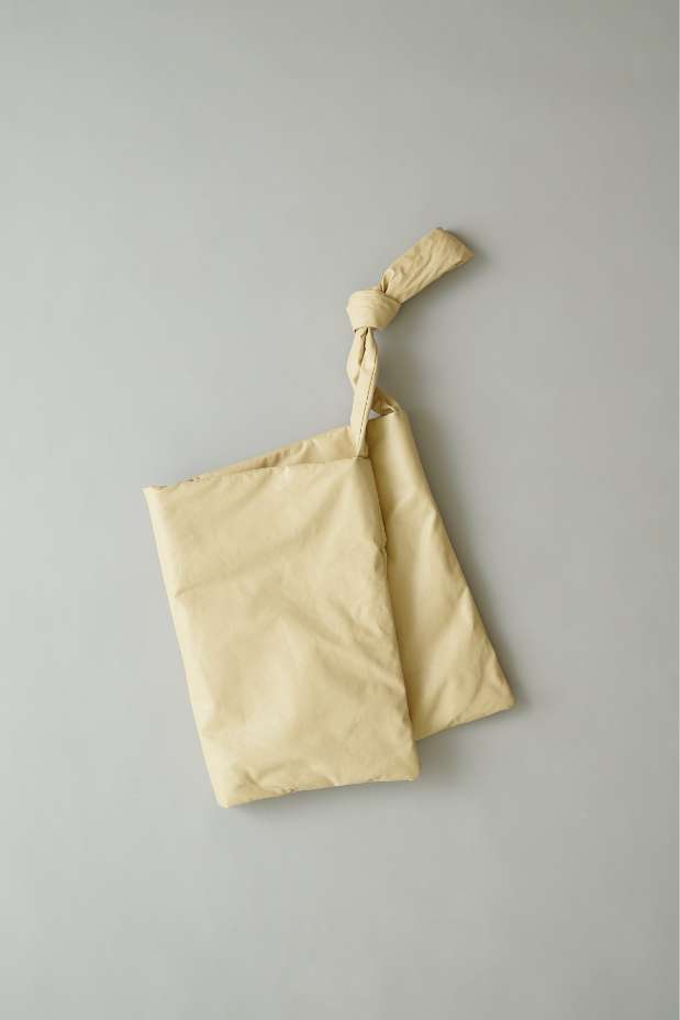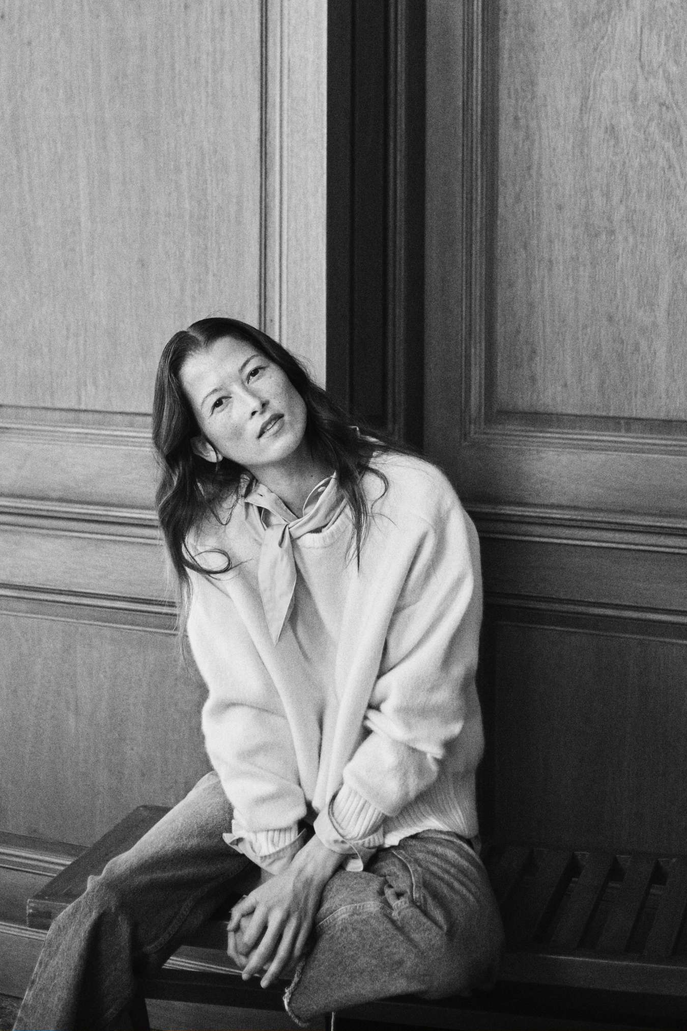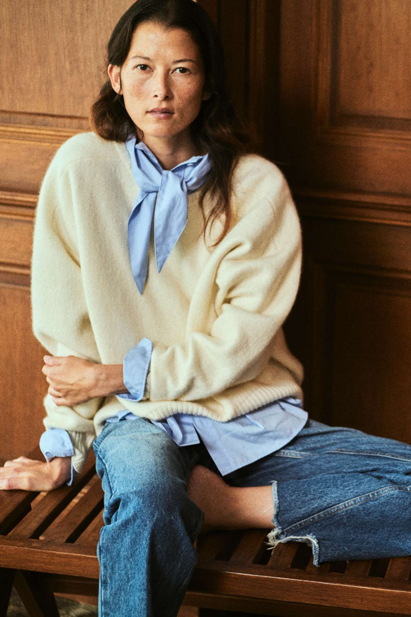 カシミヤの柔らかさ、美しさ、優しさが、決してマイナスされることなく、未来の自分へつないでいきたい。表はカシミヤ100%、ニットの裏に使ったのは、100%再生ポリエステル――という素材。型崩れを防ぎ、「少しふっくらとしたシルエット」をキープし、「私とニットの恋愛関係のようなリレーションシップ」を長続きさせるのは、このテクノロジーがあるから。