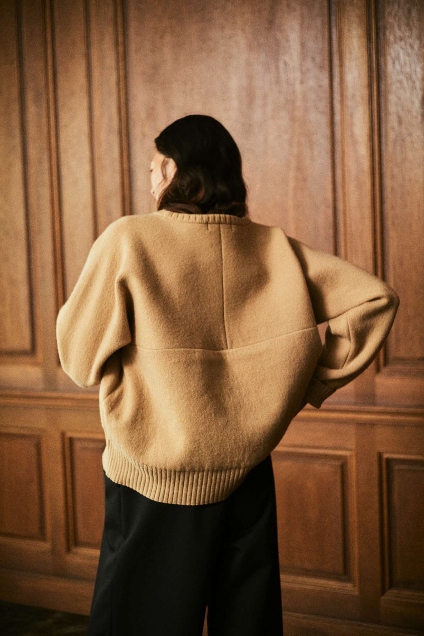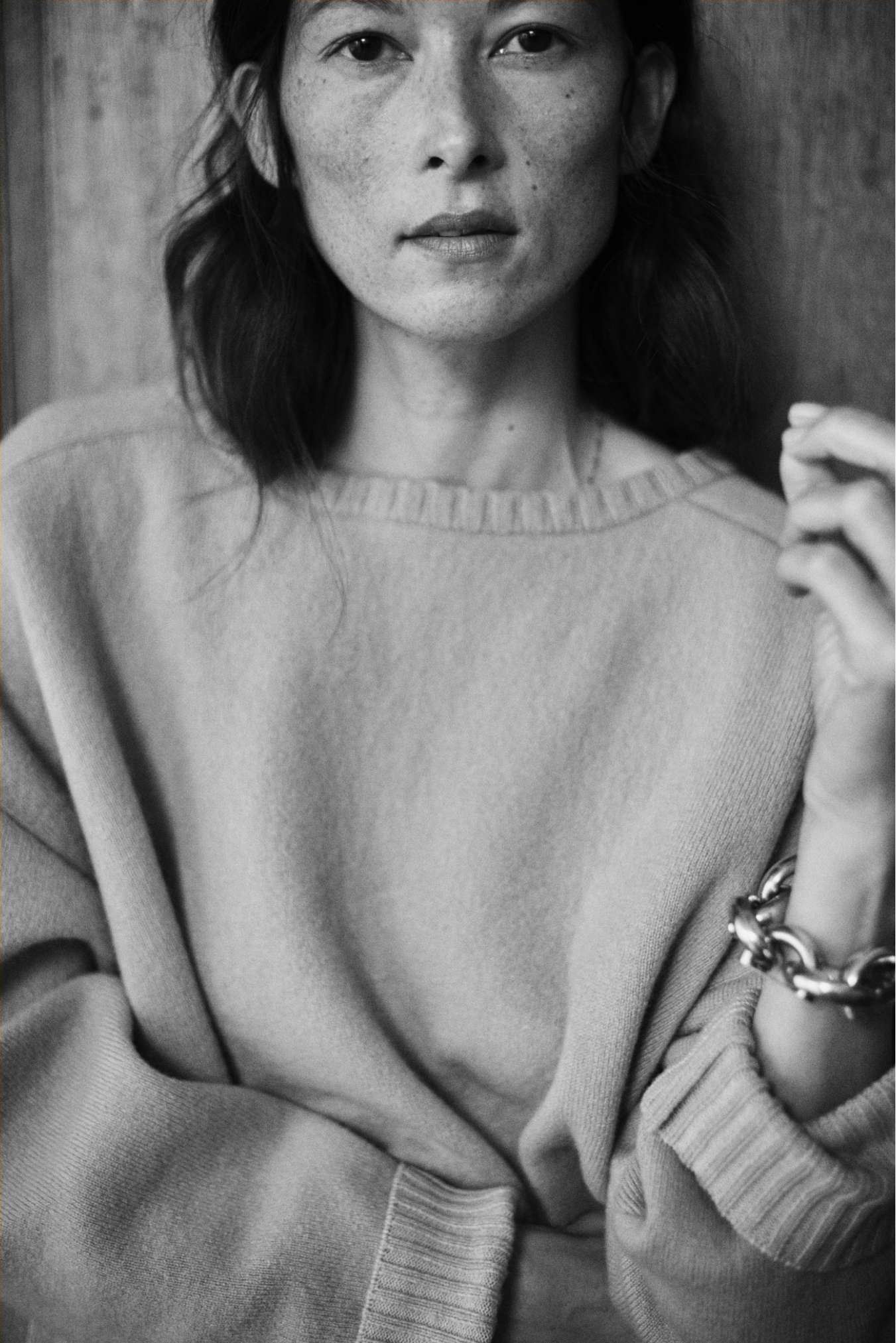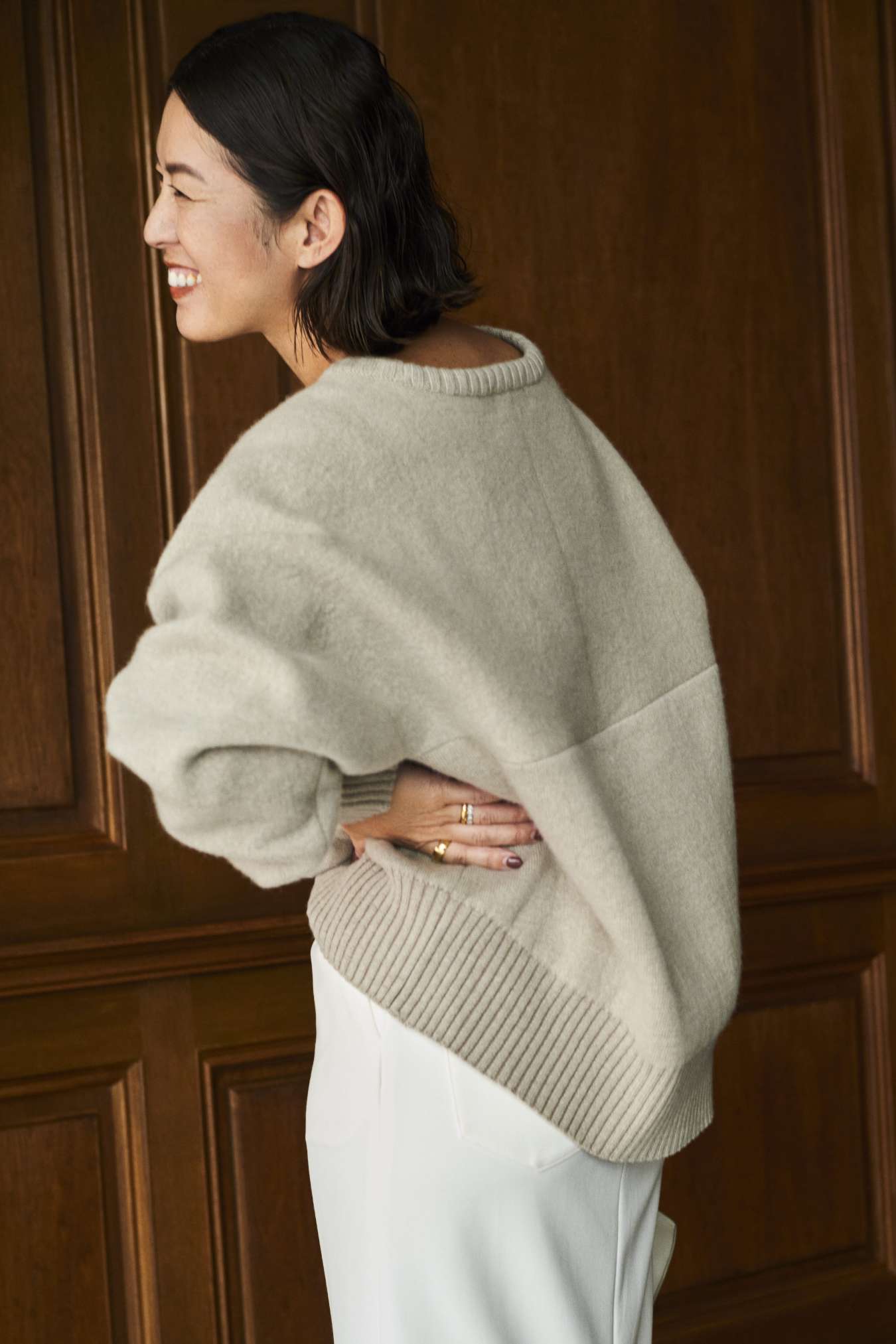 このニットのスタートは、今も10年後の私も受け入れてくれるエフォートレスなデザイン、そして、決して劣化することのない素材を探すことでした。 そうしていきついたのが、表、裏と異なる素材を使うこと、そして、身体のフォルムを限定しない、少しゆるみのあるシルエットでした。