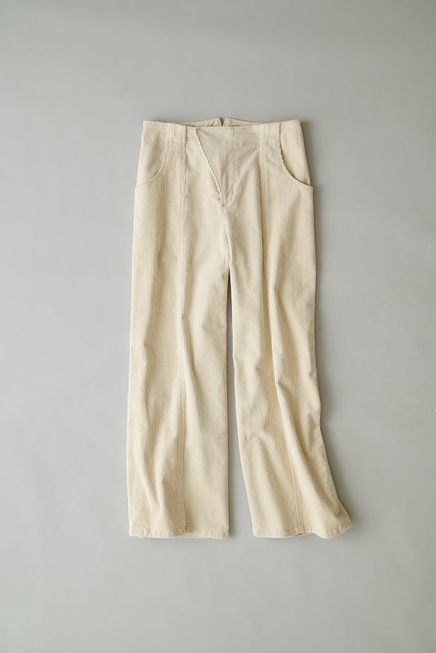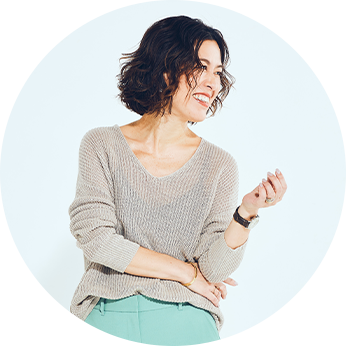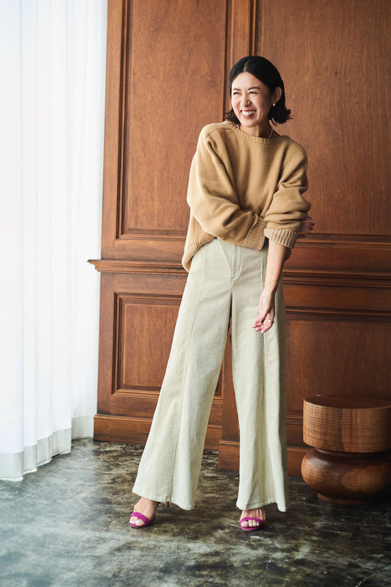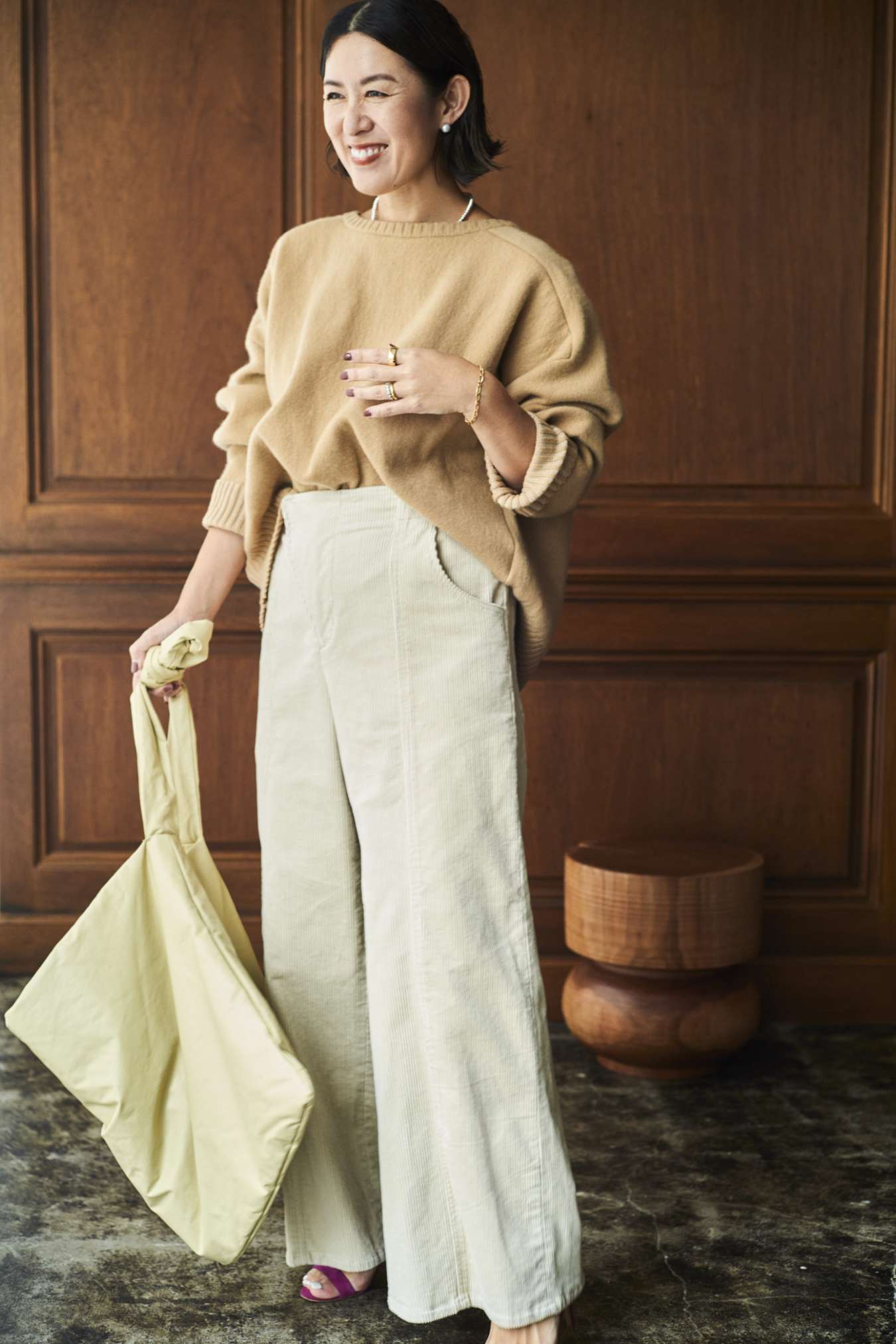 カシミヤの編み目をつぶさないよう、淡い色限定にしようと思った今回のニット。こんな、温かミルクティ色は、そのイメージ通り、着ている人を甘く、優しく見せてくれます。素肌になじみながら、明度を上げてくれる魔法の色。オフホワイトのパンツで、さらにミルクたっぷり――にコーディネートします。腕をまくって、足元はあえてサンダル。素肌を生かした着方をすると、この色の、着る人に寄り添ってくれる懐の広さを感じます。