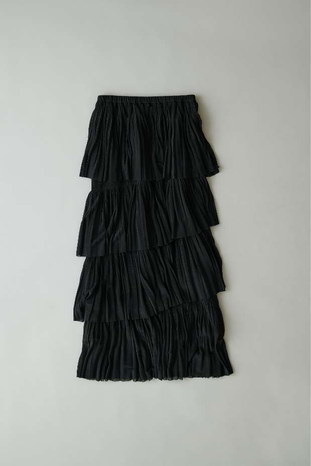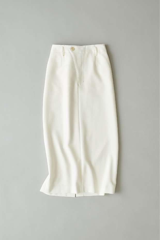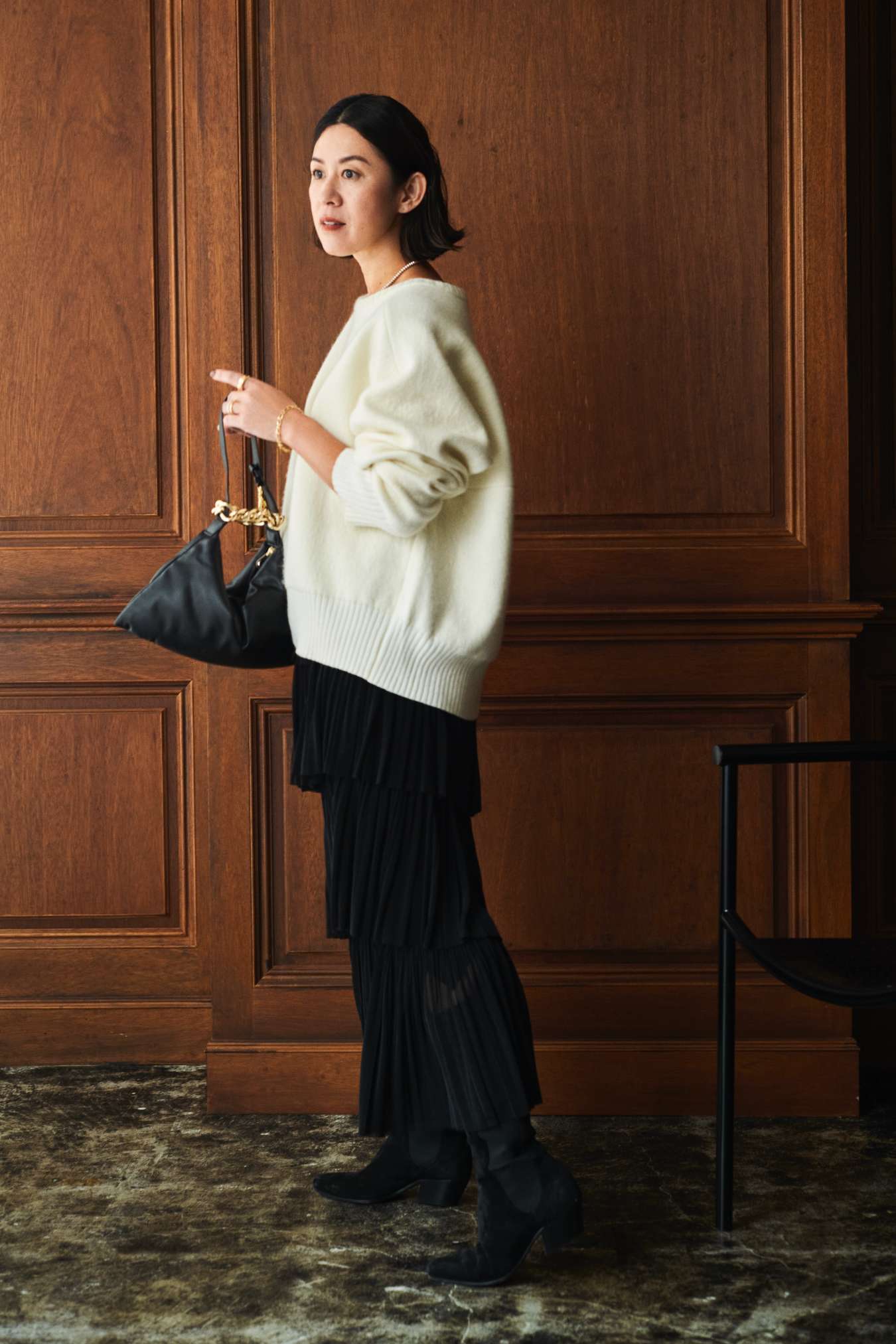 白、の中でもエッグシェルと言われる「卵の殻」を思わせる白。圧倒的に女性をドラマティックに見せてくれるカラーで、NYの高級アパートメントでは、壁の色によく使われるほど。もちろん、デニムとカジュアルにコーディネートしても、こんな、フリルをレイヤードしたスカートと合わせても。身体につかず離れずのシルエット、そして前後のレングスに差をつけたことで、ボトムスにアウトにして着ても、バランスよく着こなせます。