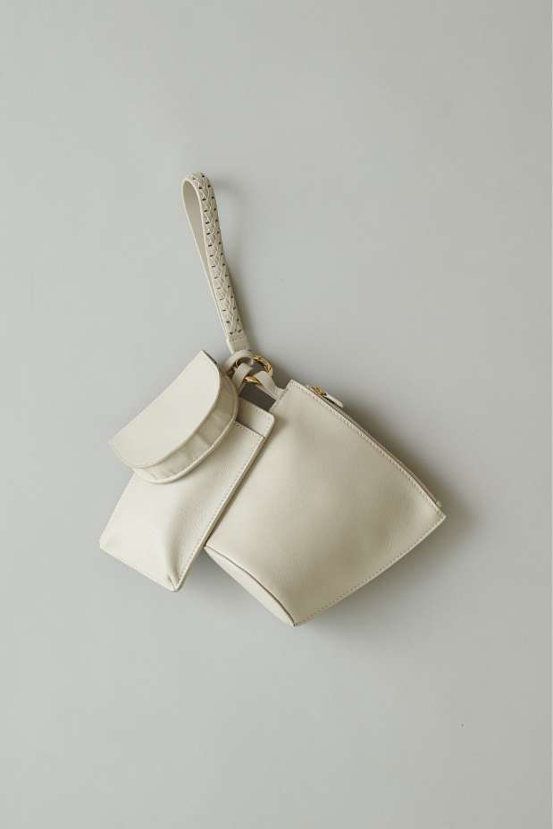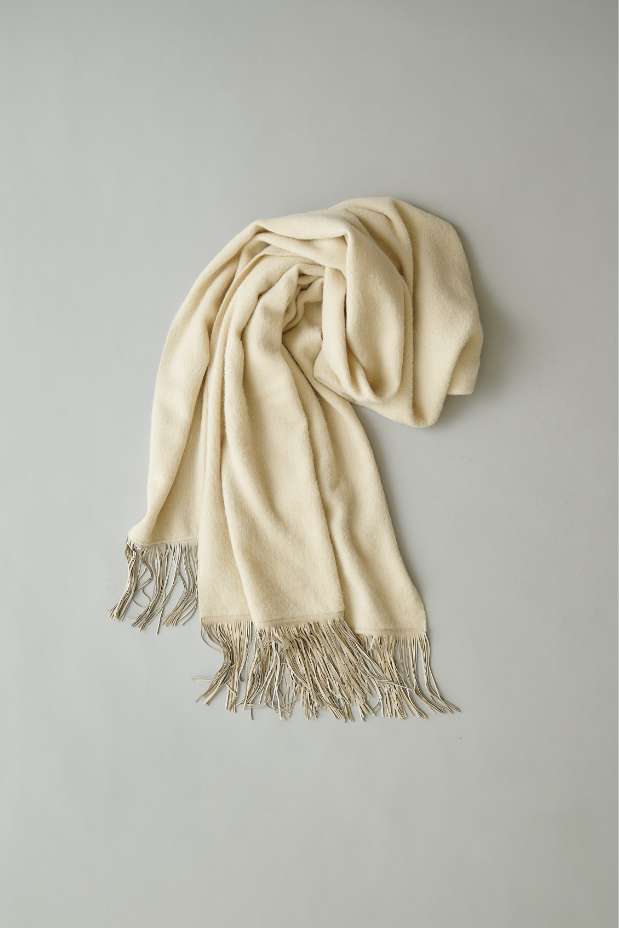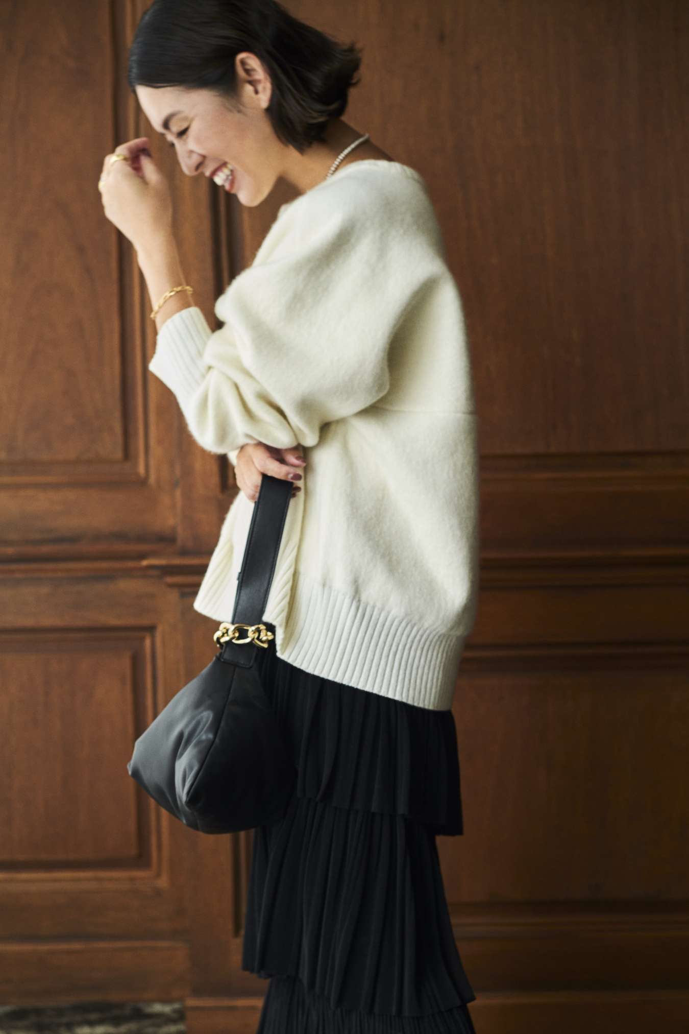 上質なカシミヤでないとなかなか出せないのが、こんなトープカラー。ベージュとグレーの中間、赤みを排除したクールな色は、元々のカシミヤ糸がクリーンでないと出せないのです。この透明感を生かしたいから、全体的にトーンを揃えた、白度の高いコーディネートに。あえて黒やダークカラーを入れないことで、カシミヤのもつきめ細やかさ、そして印象的なフォルムが消されずに、一層際立ちます。