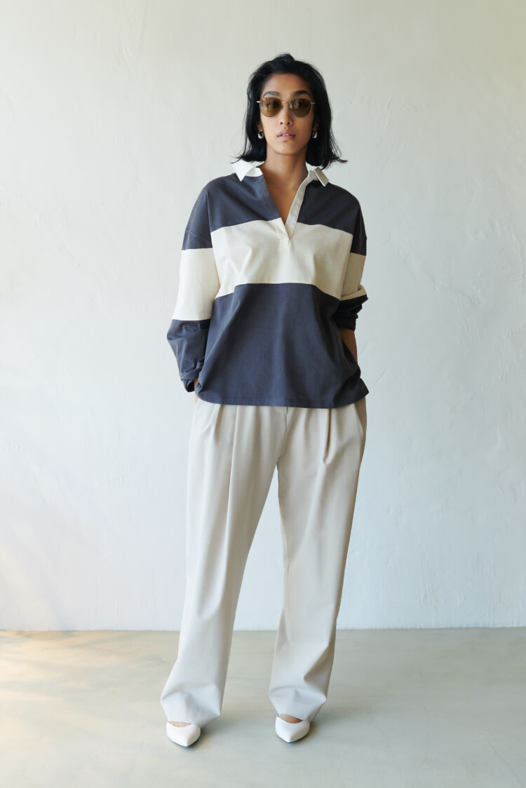 「この上なくメンズっぽいけれど、洗練されたシルエットが大人向き。コーディネイトはラガーシャツというアイテムならではのプレッピーなボーイズ感を生かすように、太めのタックパンツとシンプルに。とくにフェミニンさを意識しなくてもワントーンの上品さと相まって、女性らしい大人カジュアルマジックがかかります」。