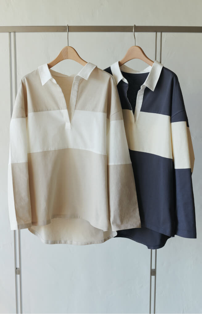 ラガーシャツはチャコールグレーとニュアンスベージュの2色展開。さらっとした肌触りで、適度な厚みのあるコットンが着心地の良さも叶えて。前後差のあるデザインは襟を抜き、立体感のあるバックフォルムを楽しむことも。着方によって色気まで感じさせてくれる。