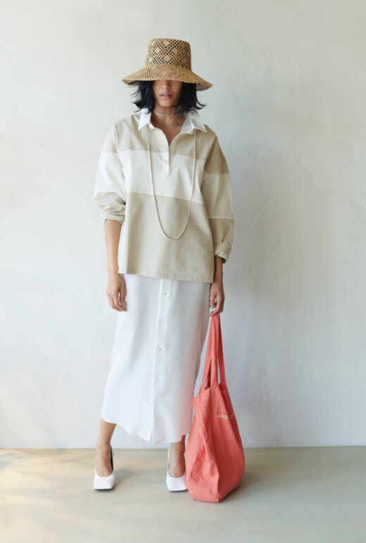 「ニュアンスベージュはシルクのワンピースにレイヤード。ラガーシャツとは対極にあるようなアイテムとのミックスコーディネイトを。ボトムを選ばず、ゆるっとアウトで着てもバランスを取りやすいのも魅力です。ロングネックレスやスクエアトゥのパンプスで次のムードをつかんで」。