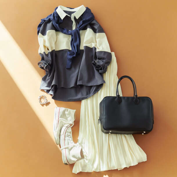 「ラガーシャツと女性らしいプリーツスカート。これはカジュアルが苦手なきれいめ派の人も取り入れやすい選択だと思います。私の場合、バッグはきちんとしたものを、足元は履き慣れたスニーカーでバランスを取り、大人っぽさをキープ。スポーティミックスをリアルに、無理なく楽しむための、ひとつの目安にしてください」。(村山佳世子)