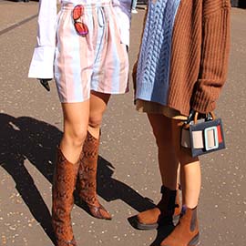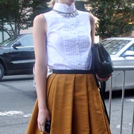 2枚目のストリートスナップのように、赤を主役にした着こなしは、黒をパートナーカラーに迎えると、全体が引き締まるうえ、あでやかさも備わります。フレアスカートに引き合わせたブラックトップスが、上半身をタイトな印象を際立たせてくれる仕掛けです。