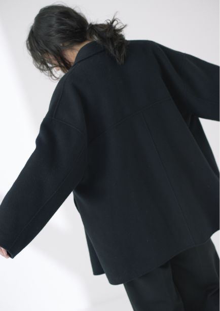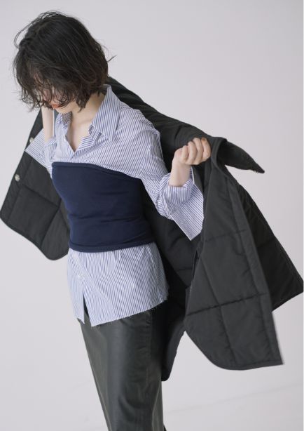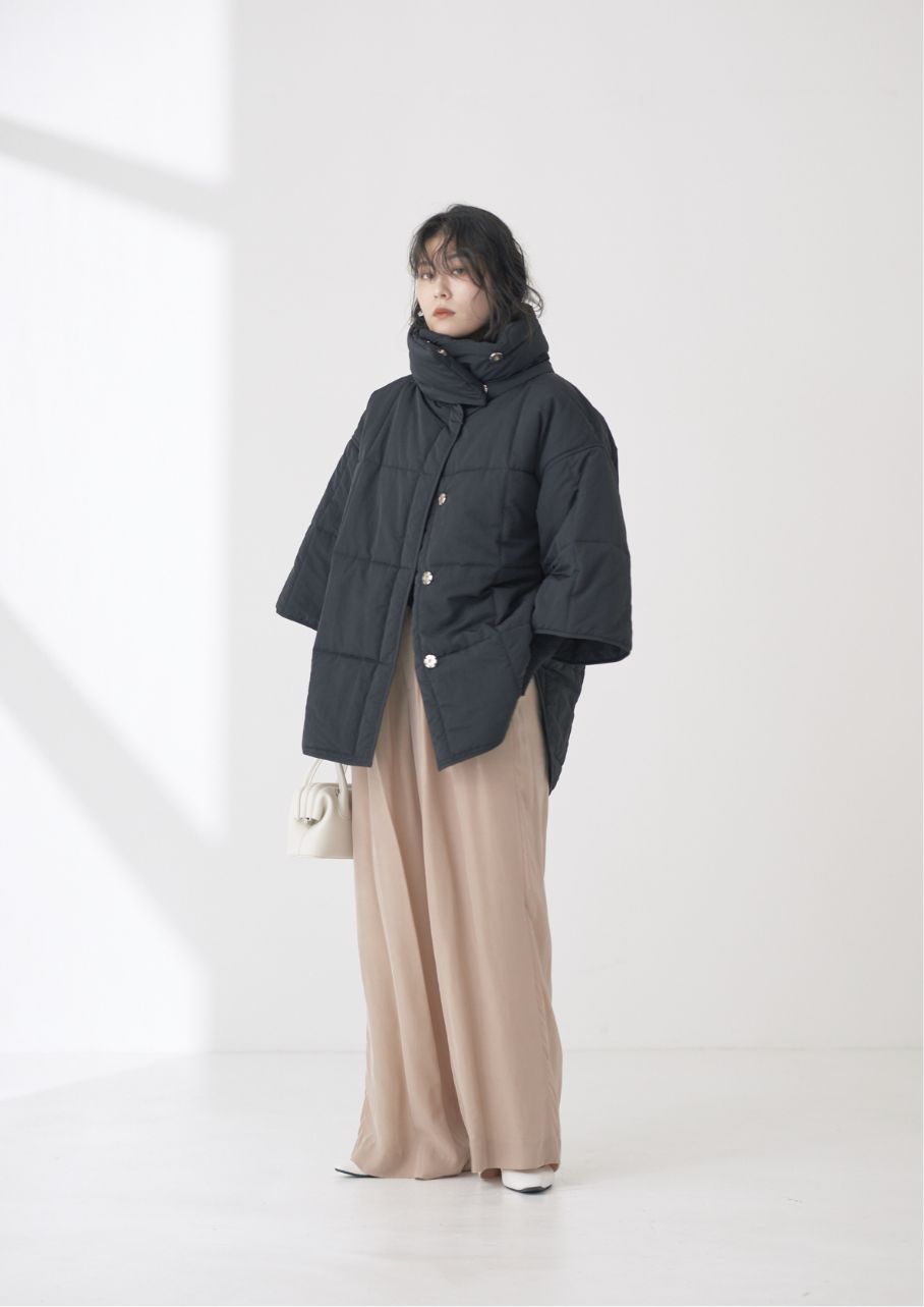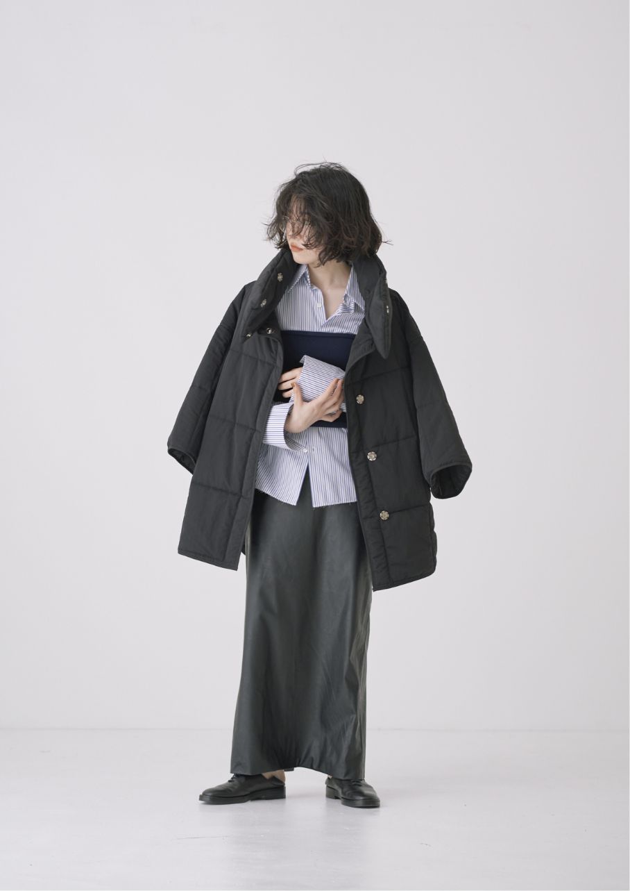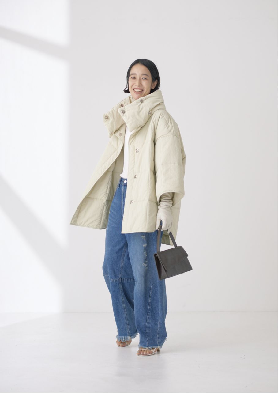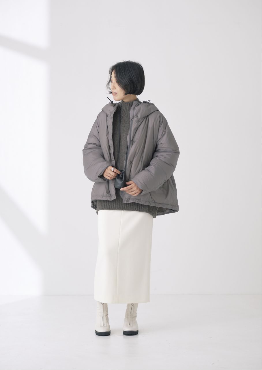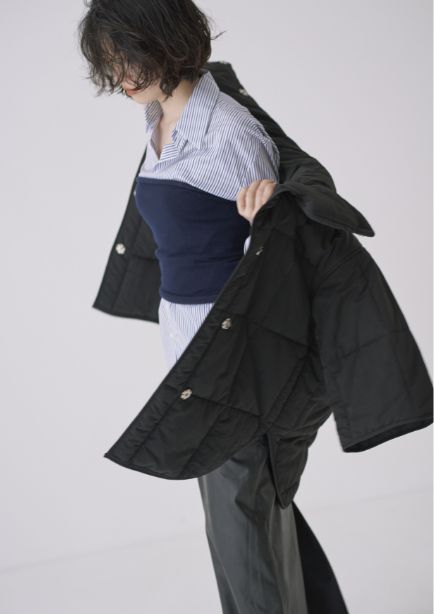 マットな質感にゆとりのあるほどよいシルエットが一枚で存在感のある印象に。