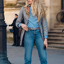 ワントーン・ルックでは選ぶ色次第で、装い全体のムードが決まります。やさしげ、知的、ポジティブなど、まずは狙うキャラクターイメージを決めて、コーディネートに取りかかりましょう。たとえば、ブルー系はクールで理知的な雰囲気が強まる色です。