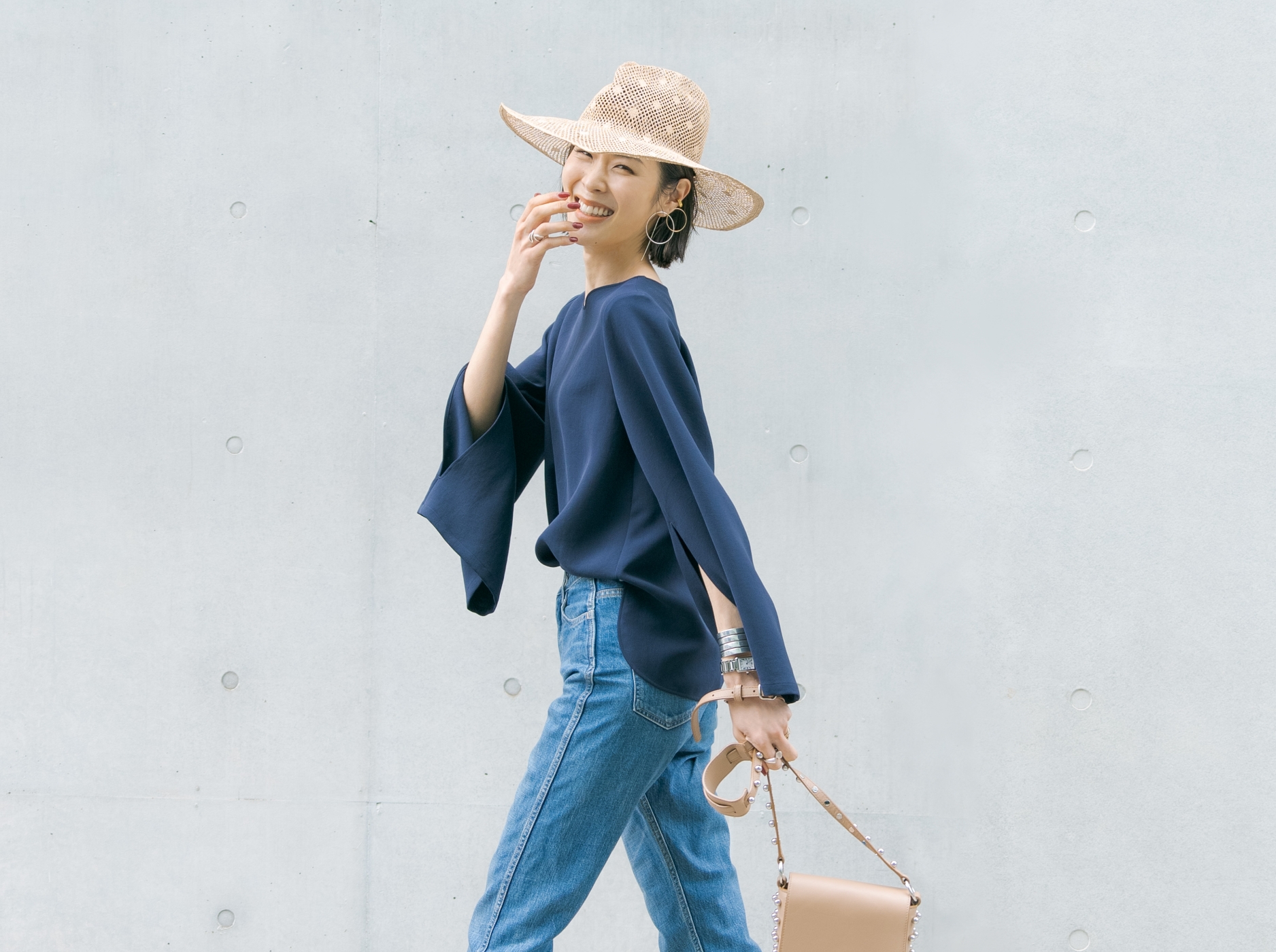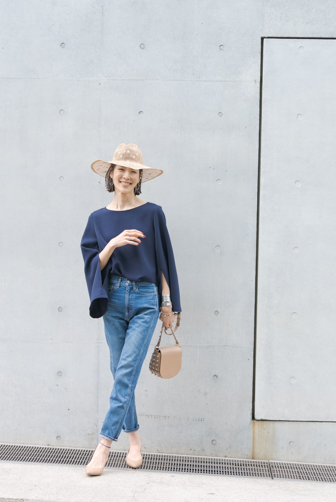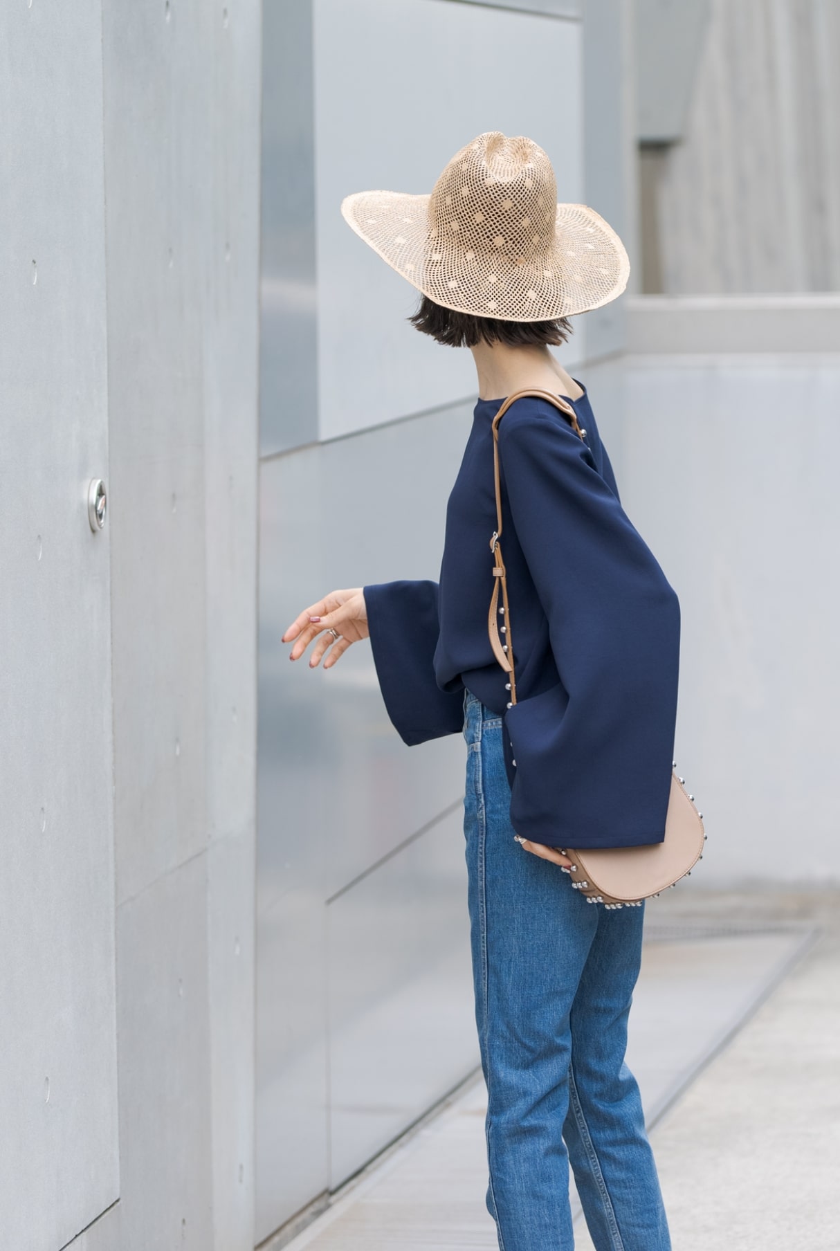 今回はネイビーのブラウスを選ばせて頂いたので、ボトムスは同じブルー系のデニムで統一感を出しました。また、足元にはポインテッド、ツバ広めのハットも取り入れてカジュアルな中にも女性らしさをプラスしてみました!ベージュ×ネイビーで全体をまとめたのもキレイ目カジュアルのポイントです。