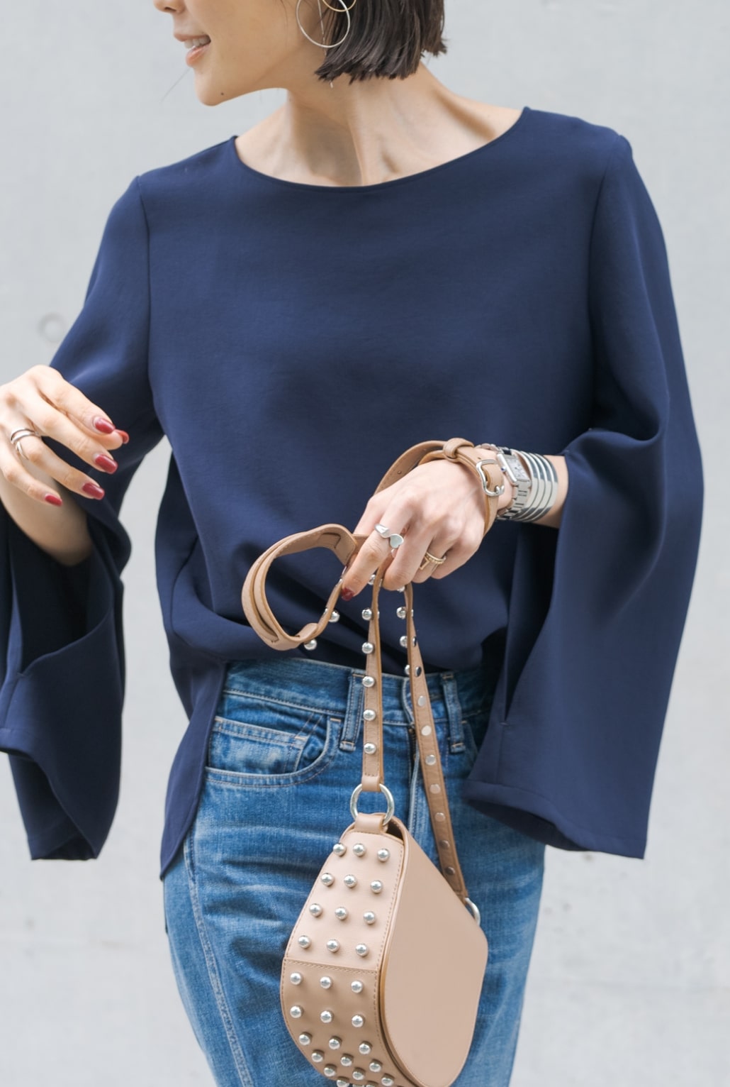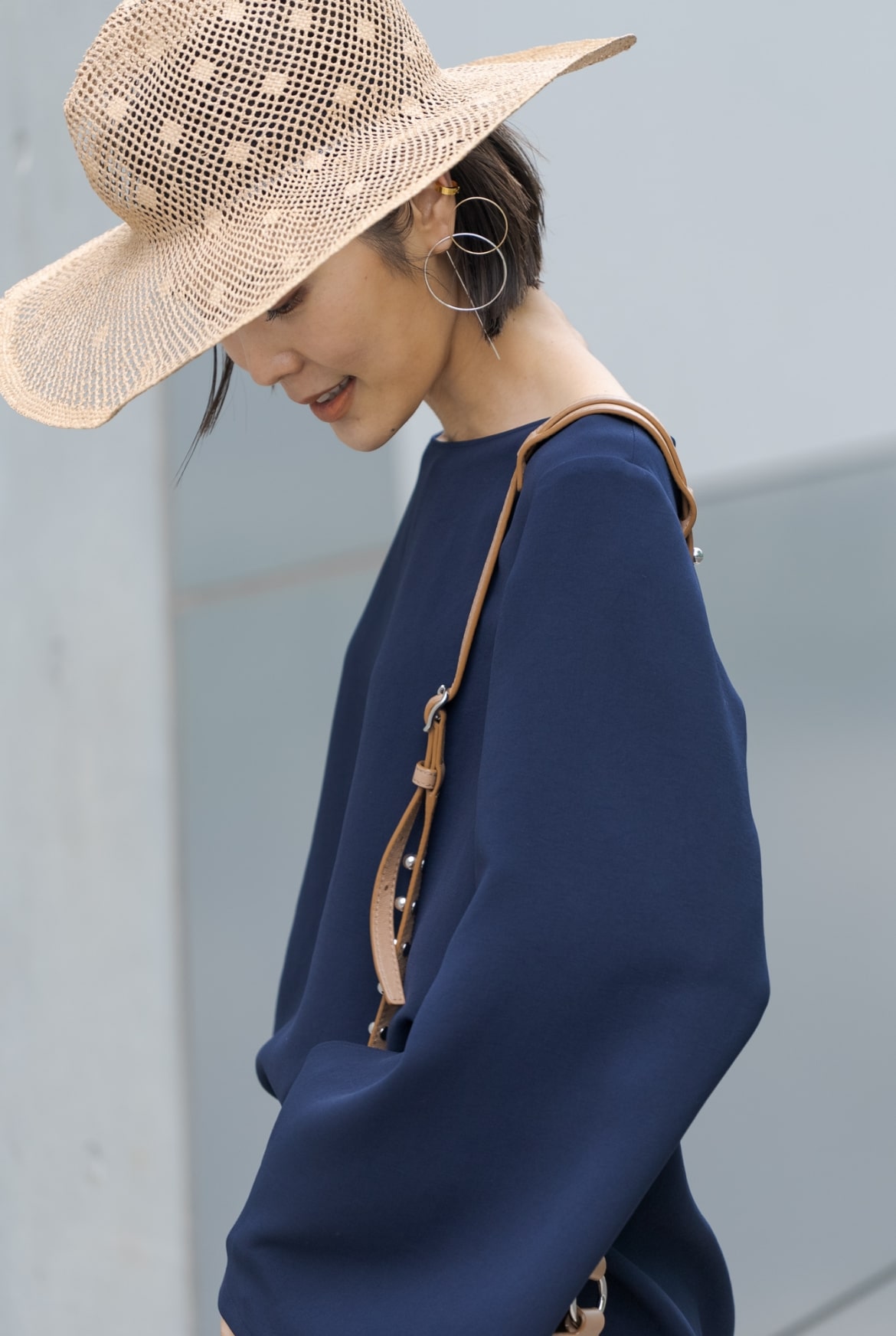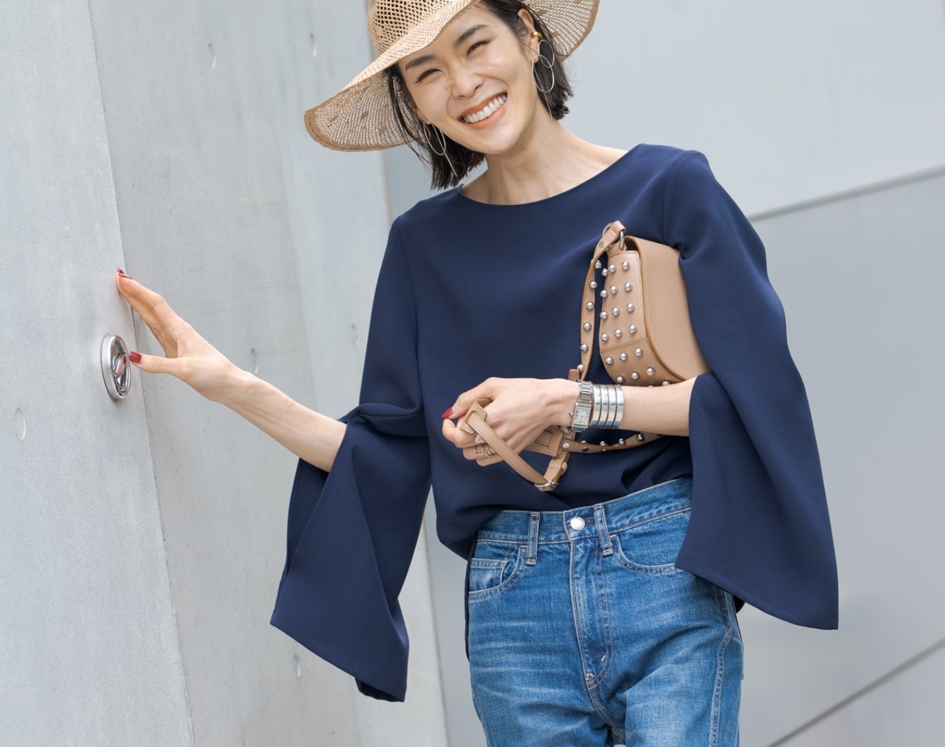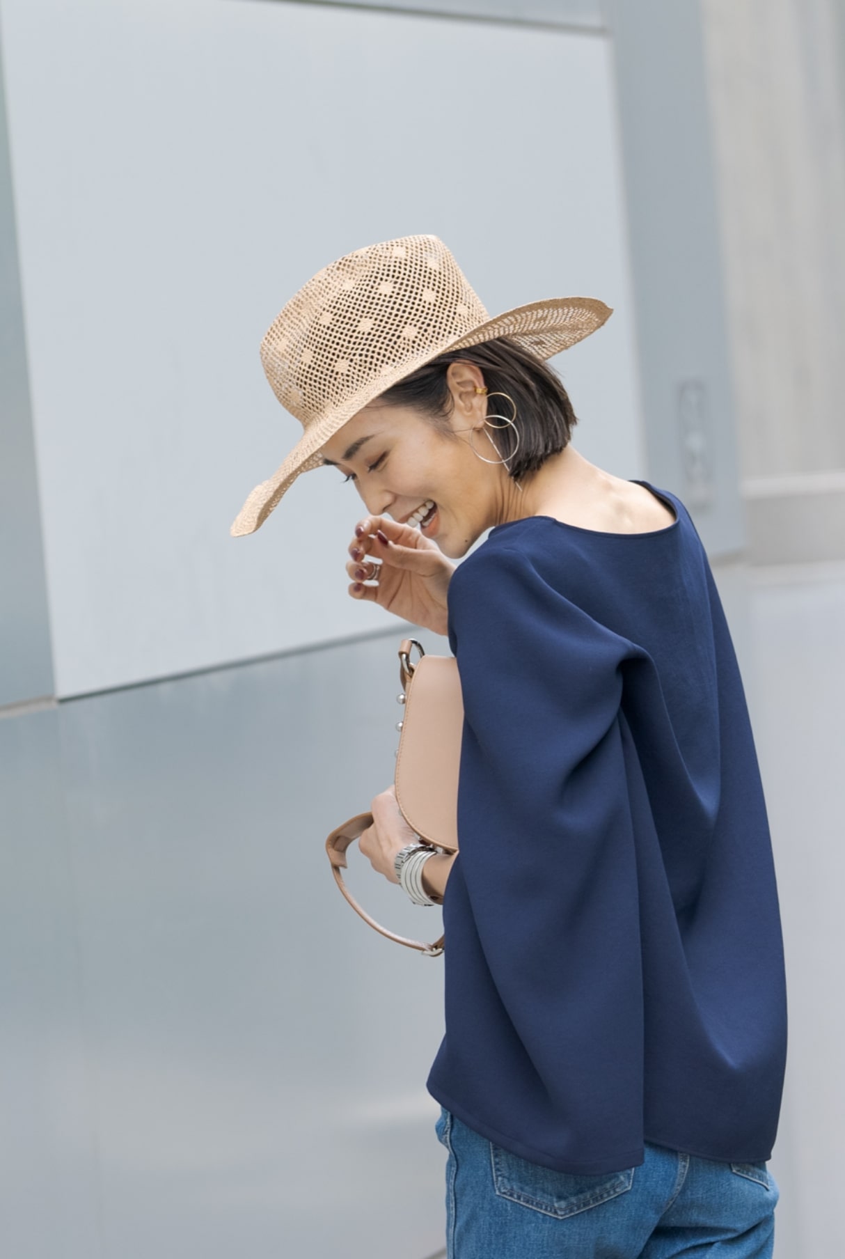 今回はネイビーのブラウスを選ばせて頂いたので、ボトムスは同じブルー系のデニムで統一感を出しました。また、足元にはポインテッド、ツバ広めのハットも取り入れてカジュアルな中にも女性らしさをプラスしてみました!ベージュ×ネイビーで全体をまとめたのもキレイ目カジュアルのポイントです。