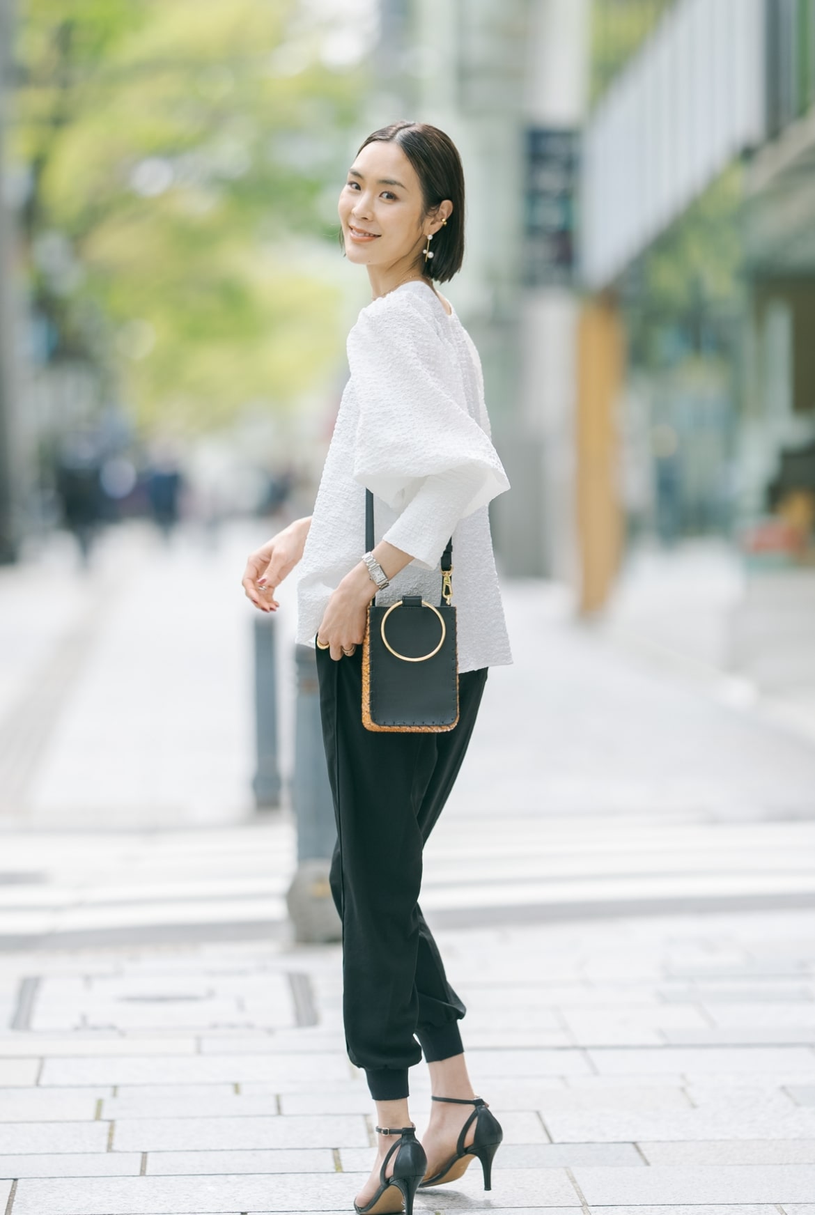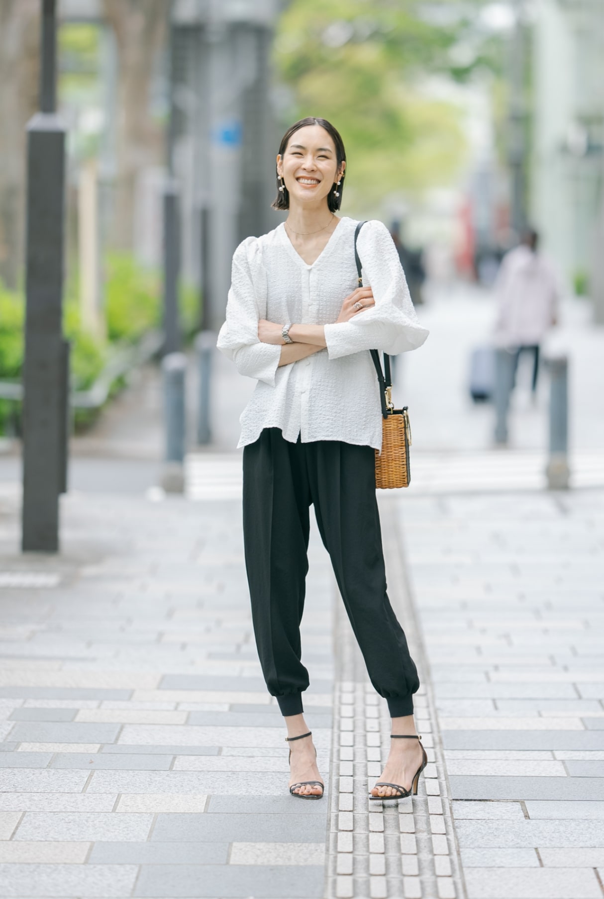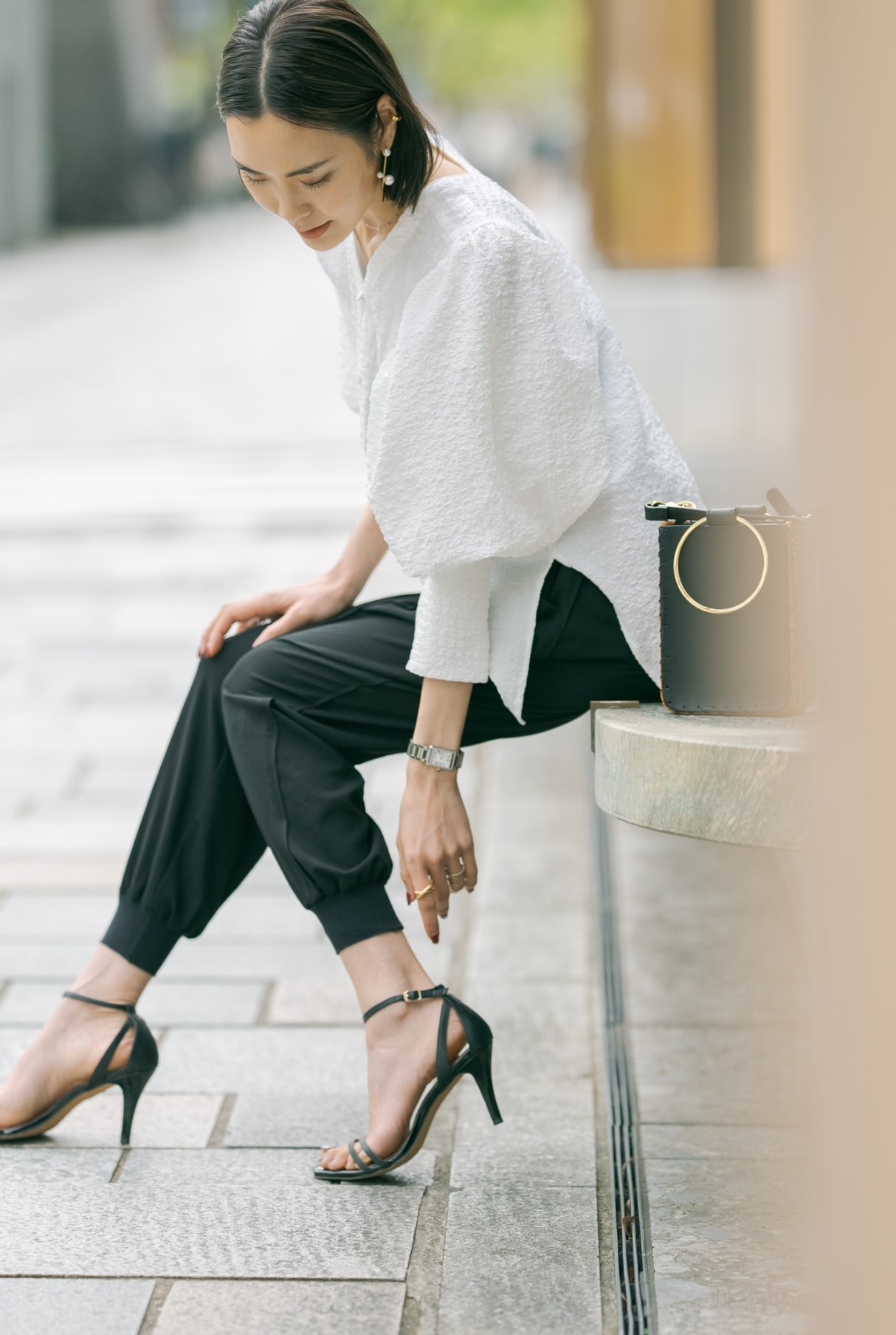 ジョガーパンツはカジュアルな印象だったので、袖にボリュームのある甘めのブラウスを組み合わせました。またジャージーの柔らかさとブラウスのハリのある素材感を合わせてシルエットにメリハリをつけたのもポイントです。足元は華奢なヒールに、バッグは小振りのもの、仕上げにパールのピアスを付けておめかし仕様にしました。