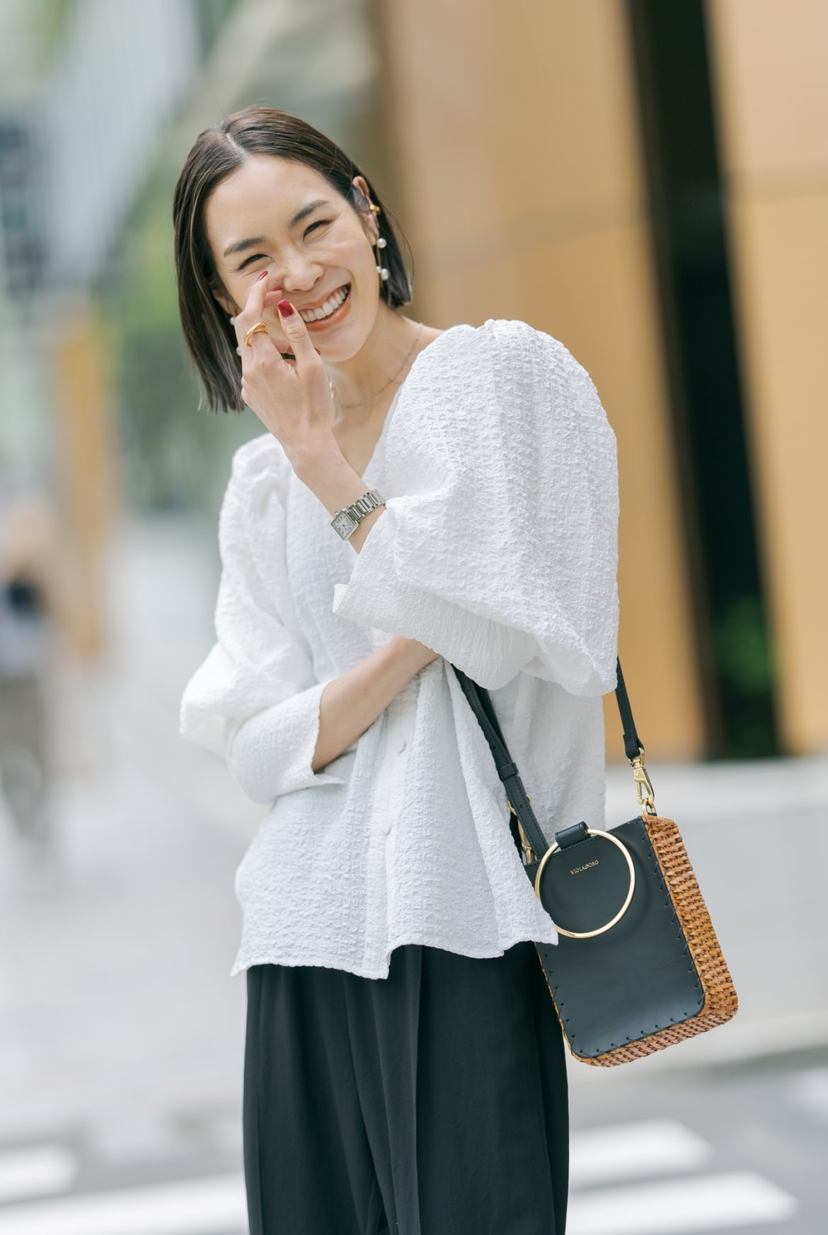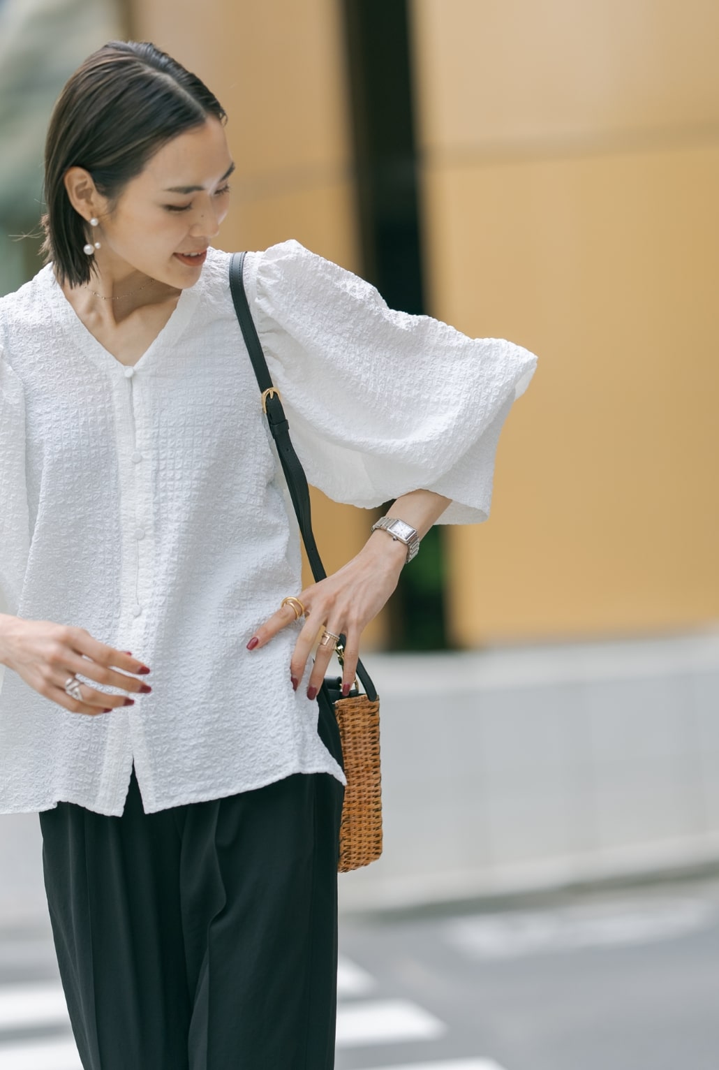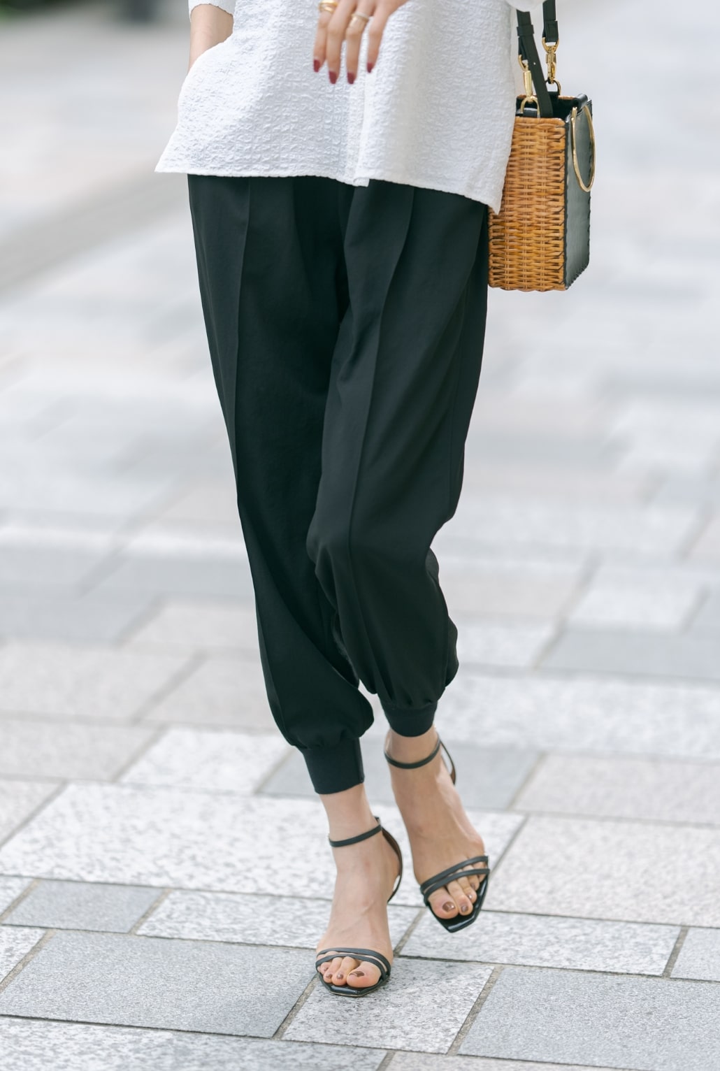 ジョガーパンツはカジュアルな印象だったので、袖にボリュームのある甘めのブラウスを組み合わせました。またジャージーの柔らかさとブラウスのハリのある素材感を合わせてシルエットにメリハリをつけたのもポイントです。足元は華奢なヒールに、バッグは小振りのもの、仕上げにパールのピアスを付けておめかし仕様にしました。