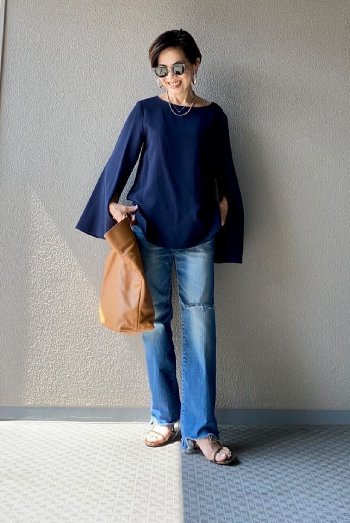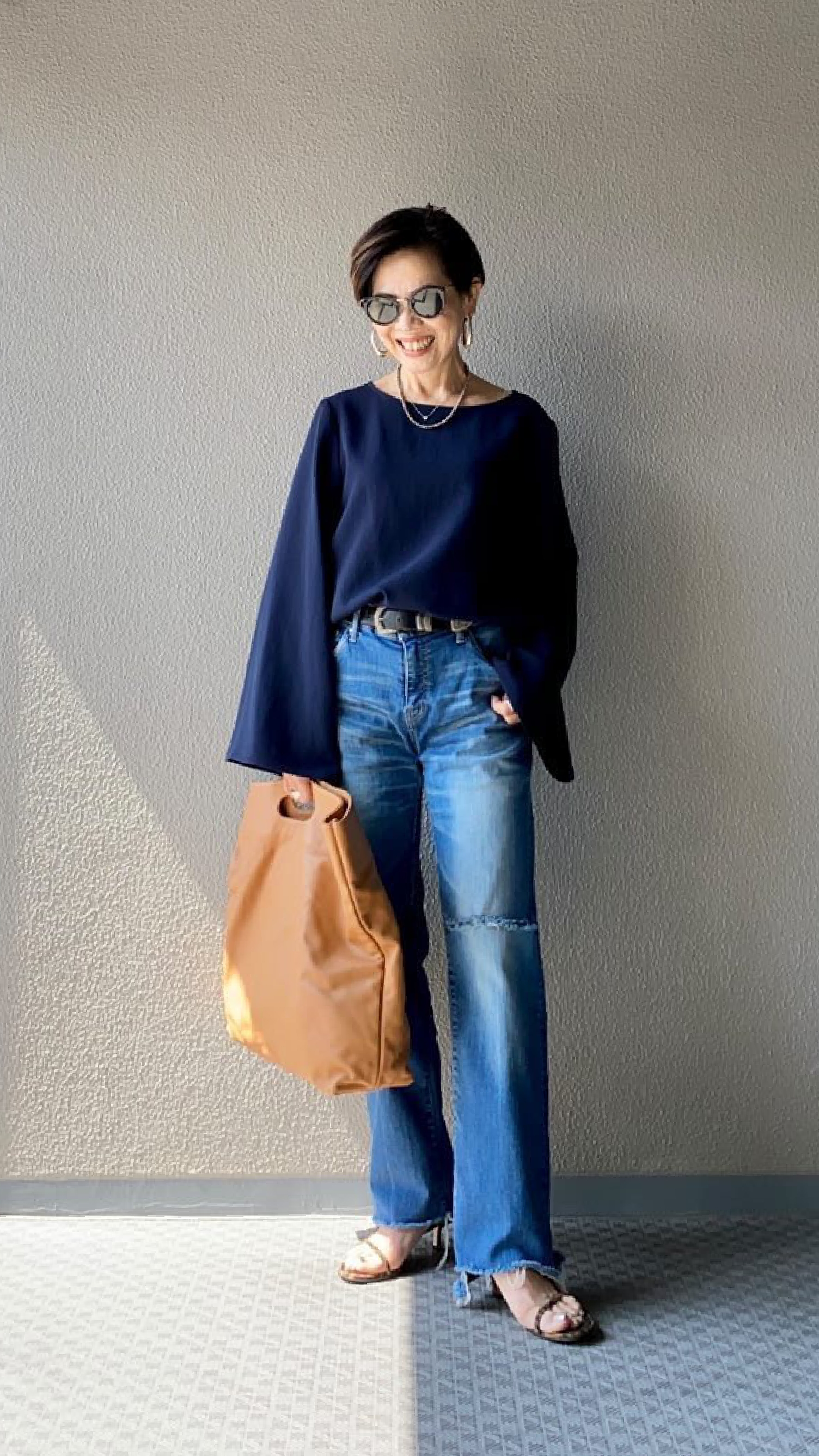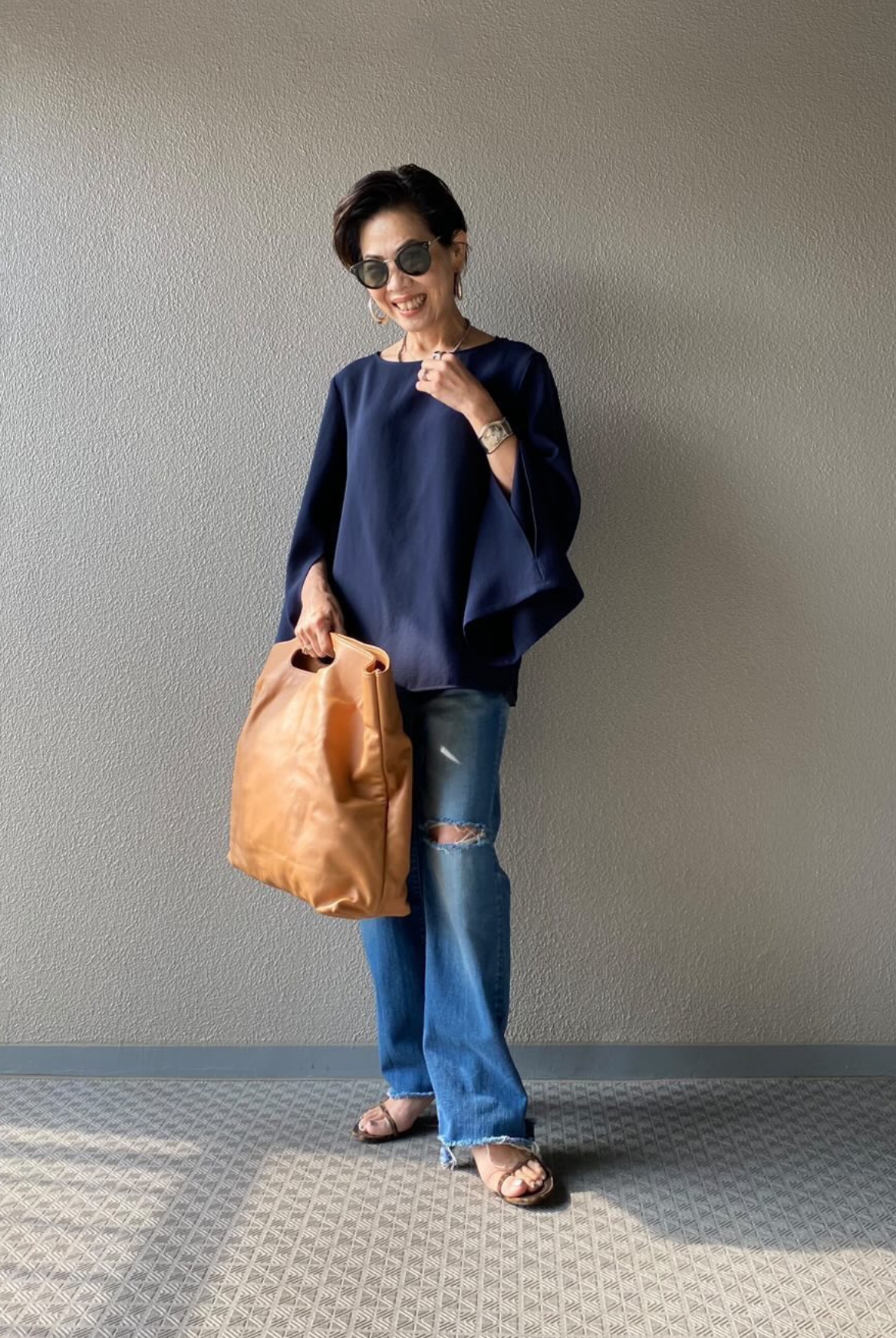 綺麗目なブラウスなので、あえてデニム合わせで。足元は華奢サンダルで大人のきれいめカジュアルに仕上げました。