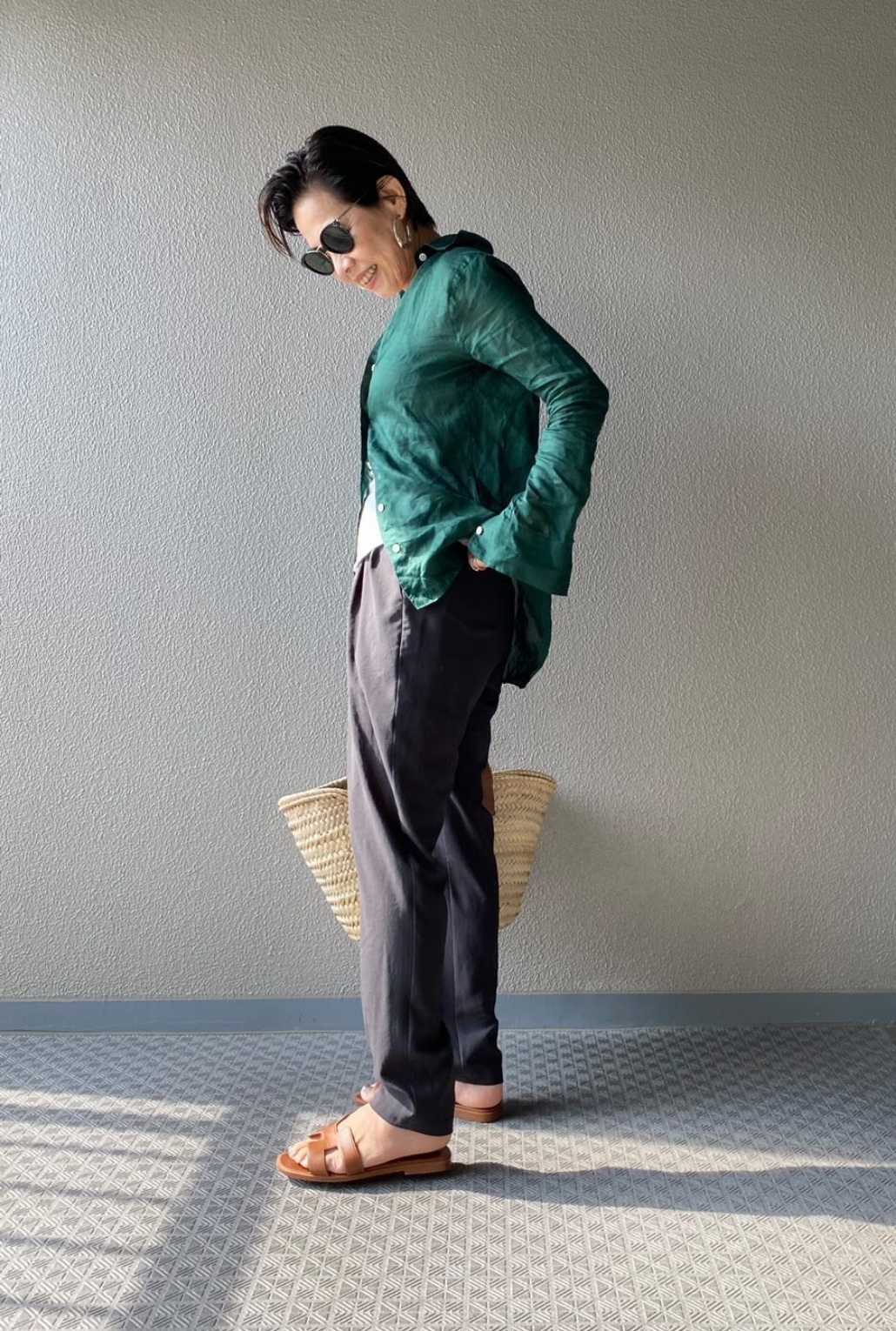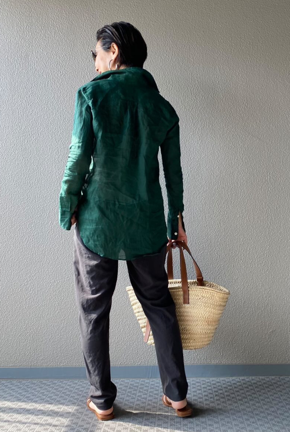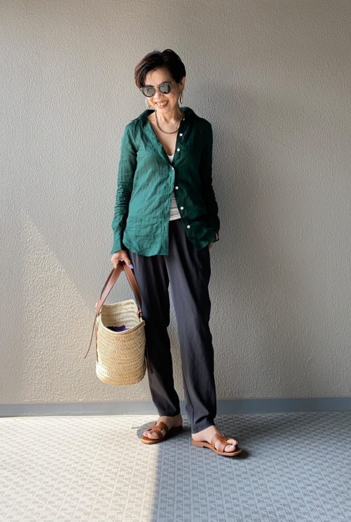 ダークグレーなので暗くならないよう、インナーのホワイト×グリーンのリネンシャツで合わせてみました。かごバッグで抜け感もプラスしました。