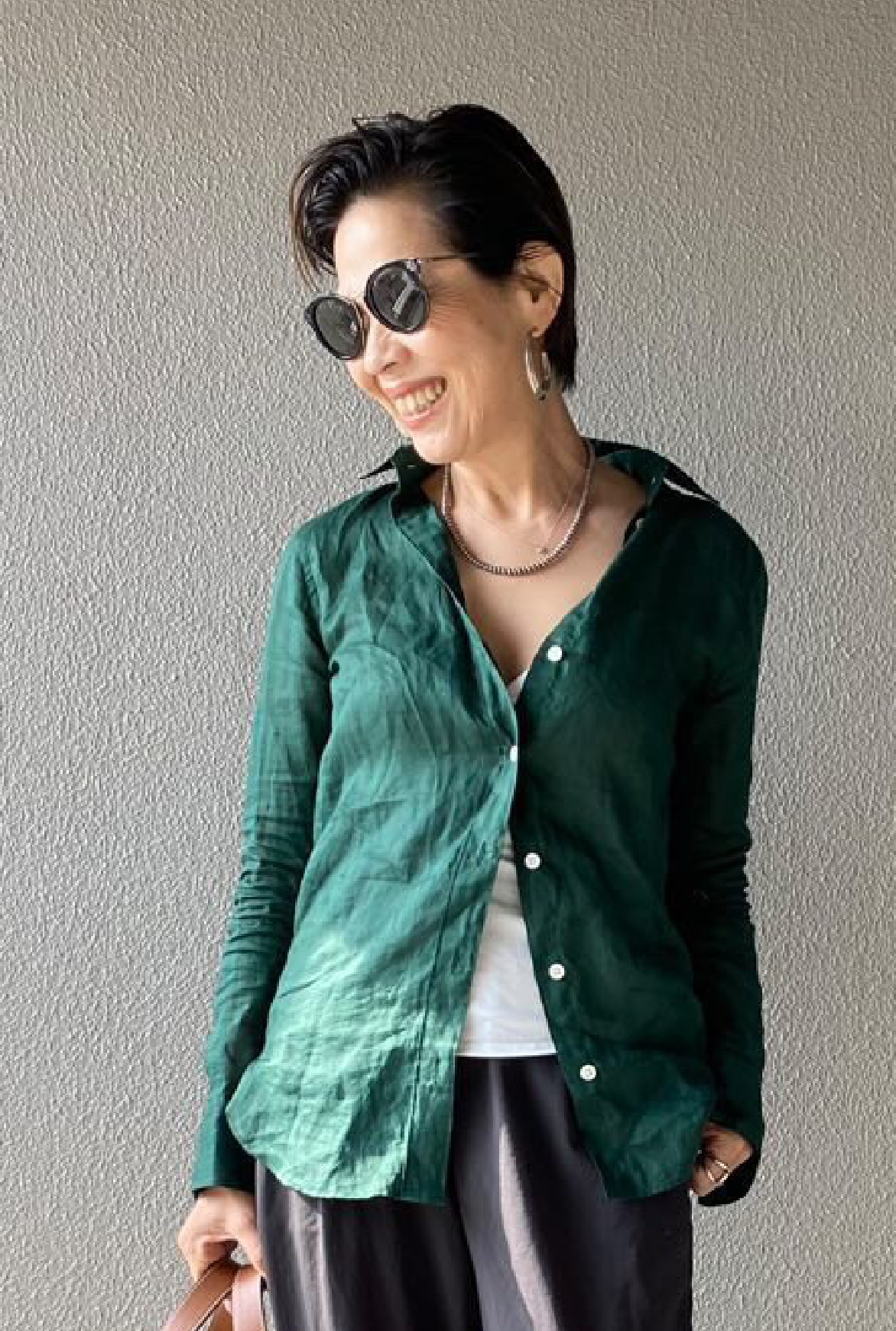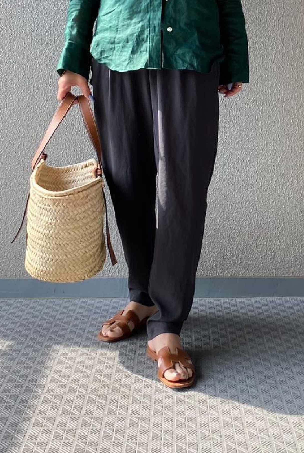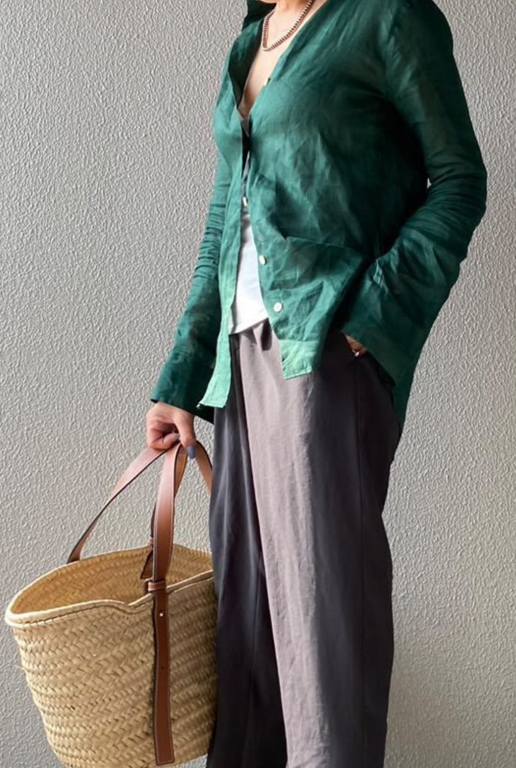 ダークグレーなので暗くならないよう、インナーのホワイト×グリーンのリネンシャツで合わせてみました。かごバッグで抜け感もプラスしました。