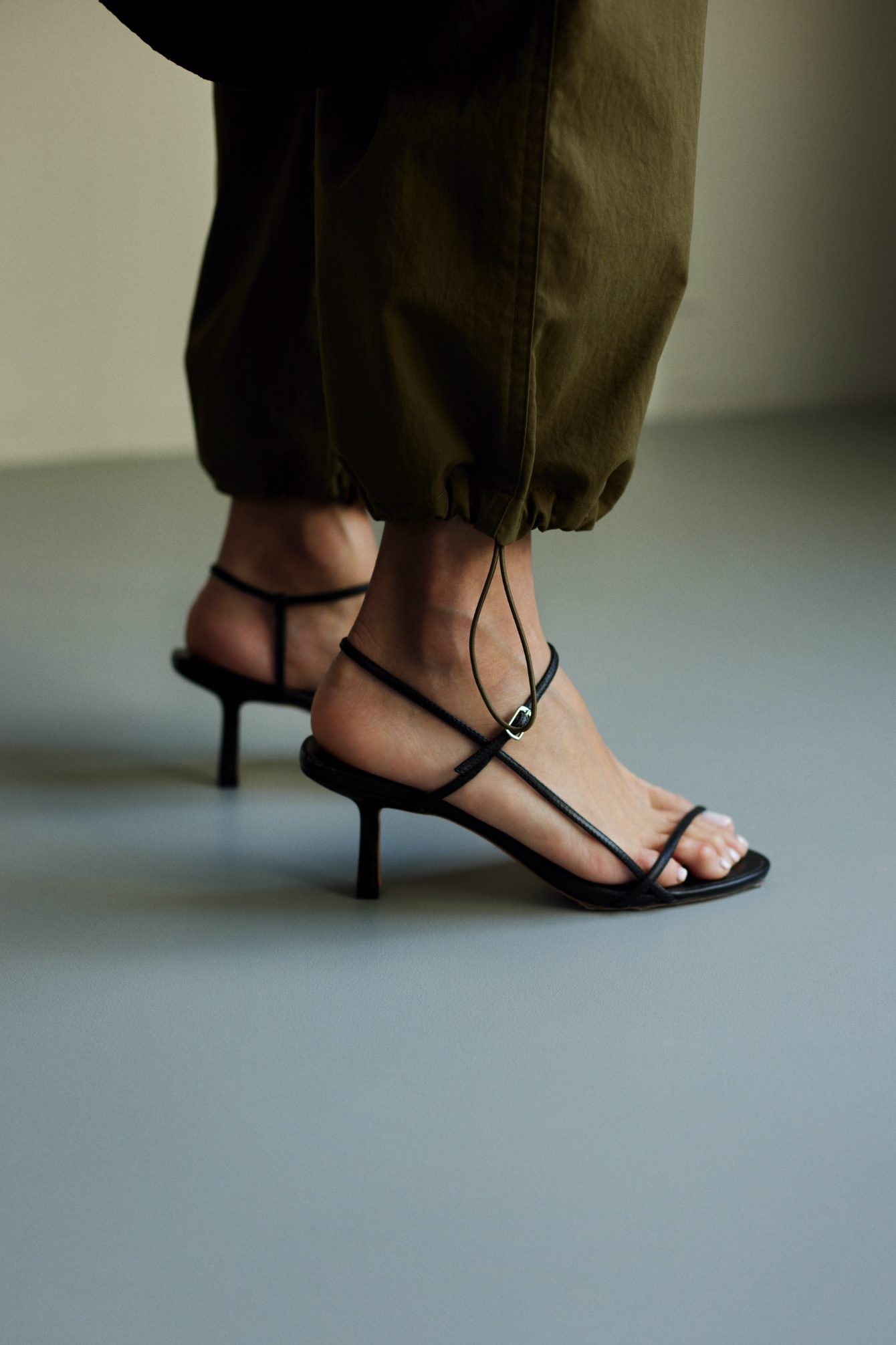 「足元はヌーディサンダルを。フラットシューズではなく、華奢なストラップとヒールでどきっとするようなセンシュアリティを引き出して。裾を絞るカーゴパンツとの相性もよく、ヘルシーな中に都会的な洗練を秘めたムードに」。