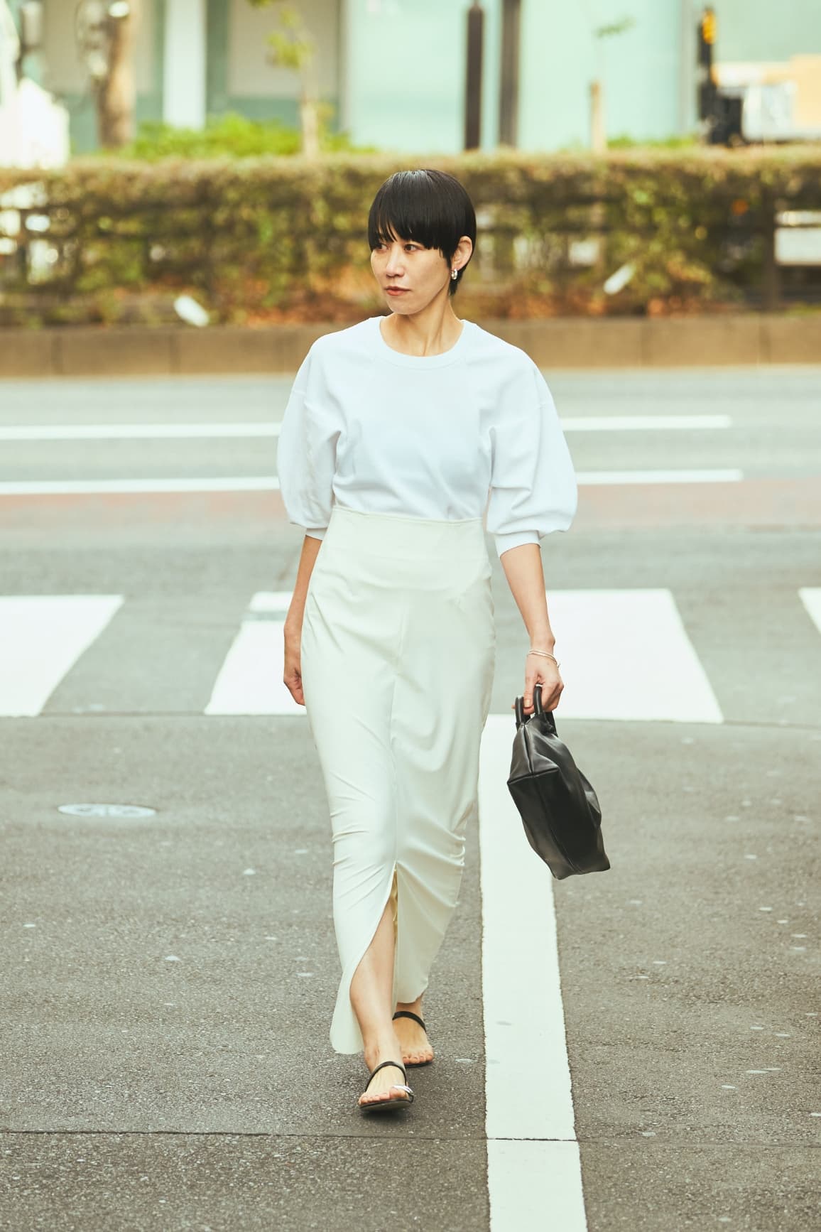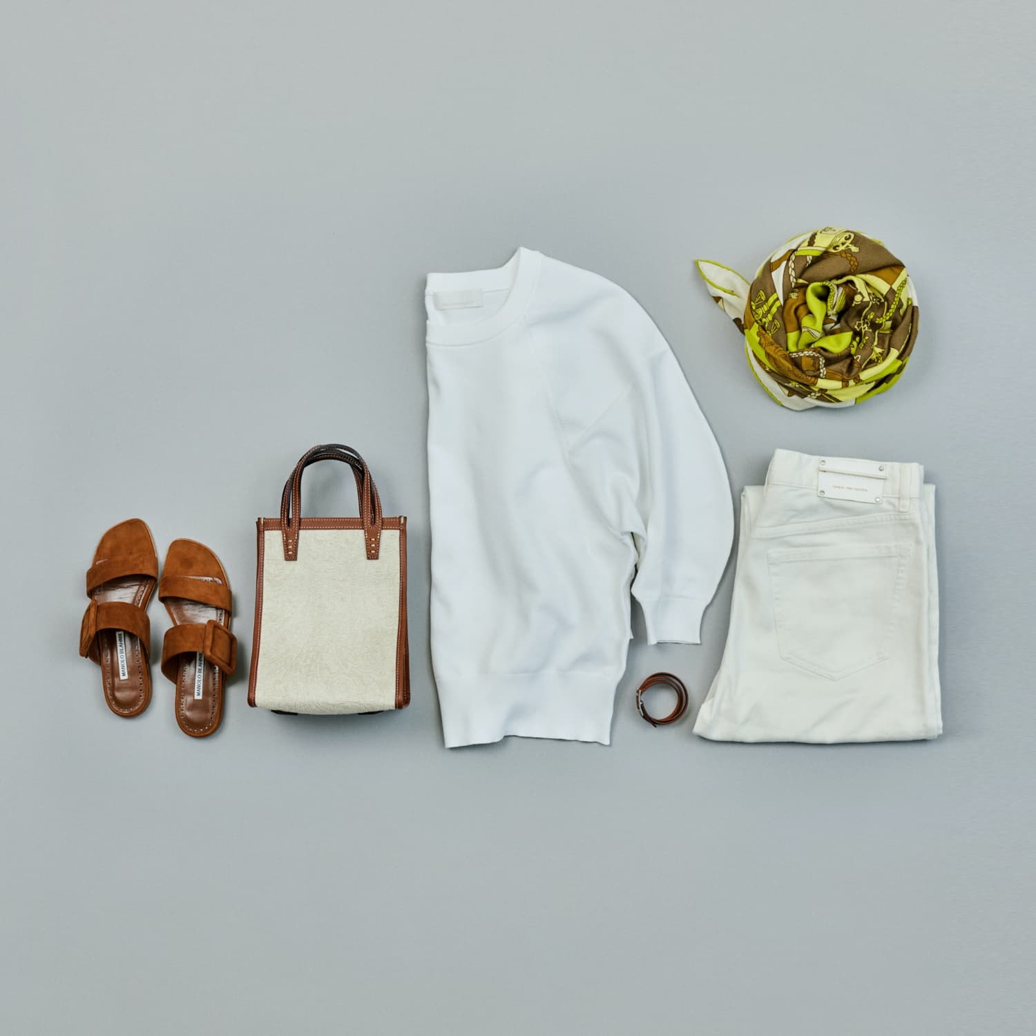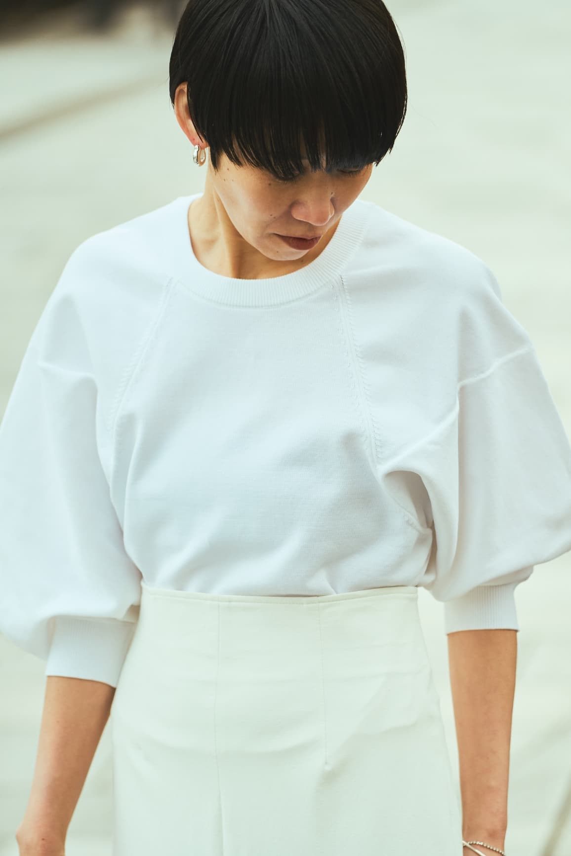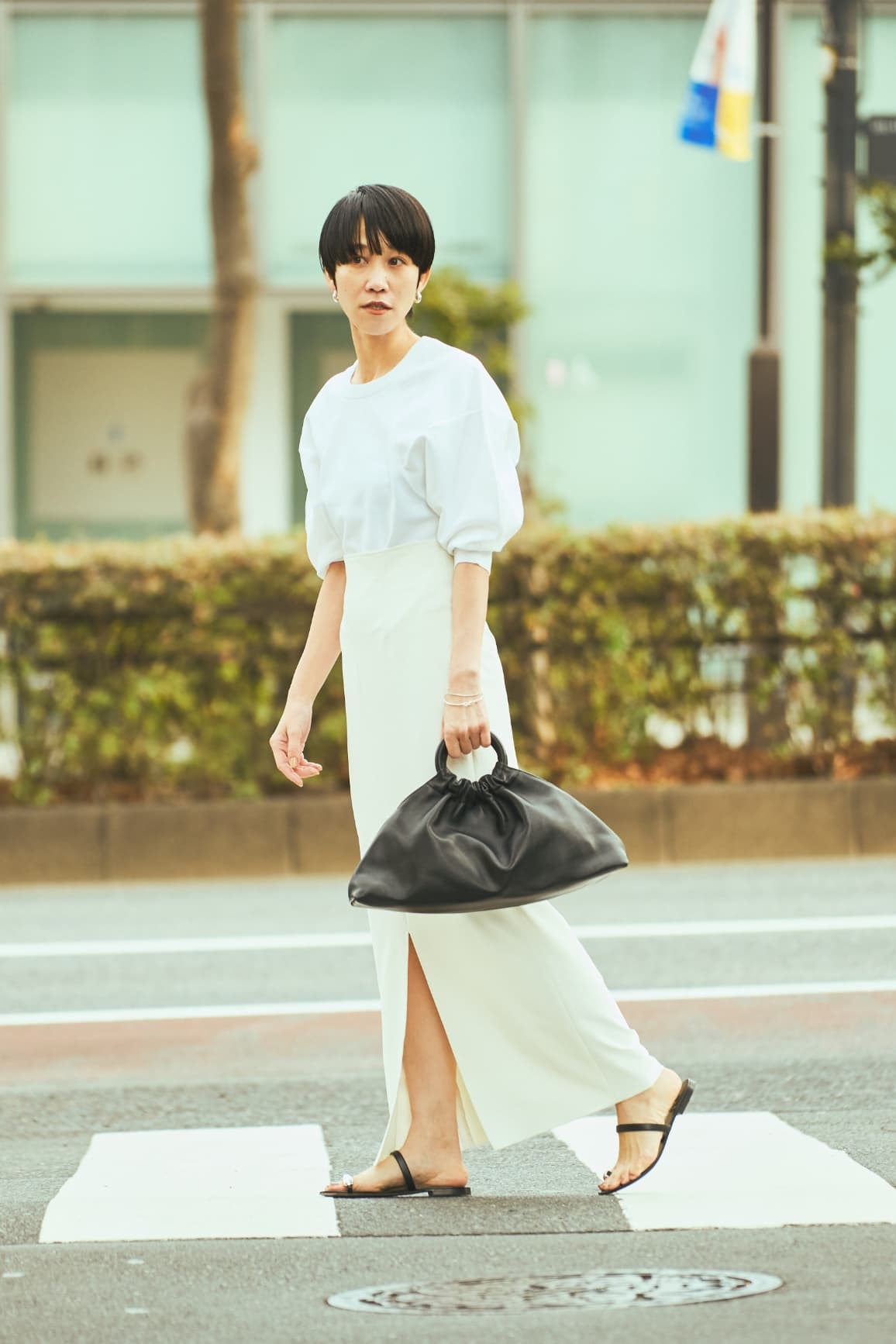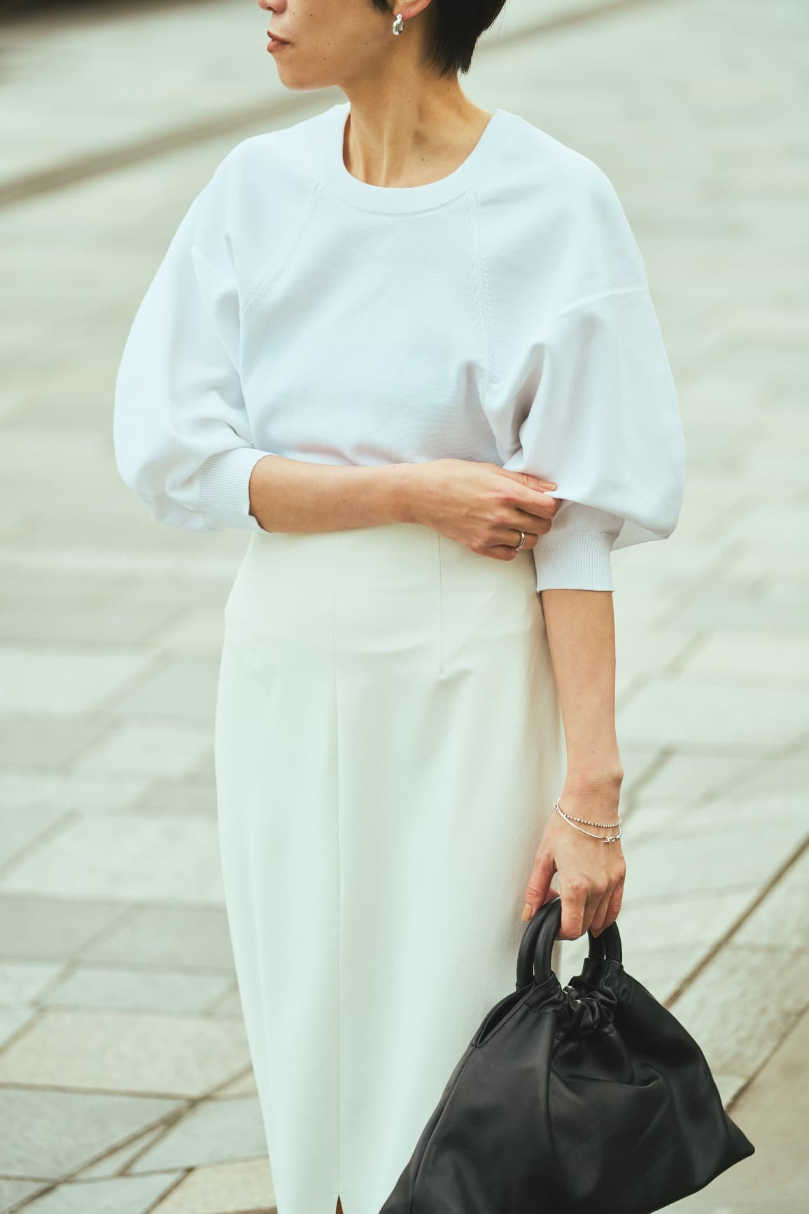 「ニットは黒のほかに、白とブルーの色展開があり、澄んだ白も惹かれました。白ベースにキャメルの小物を差すスタイルは、ヘルシーな人が似合う王道パターン。お気に入りの小物とともに、私自身もフレッシュな女性像を意識してコーディネイト。日に焼けた肌にも似合いますよね」。(村山佳世子)