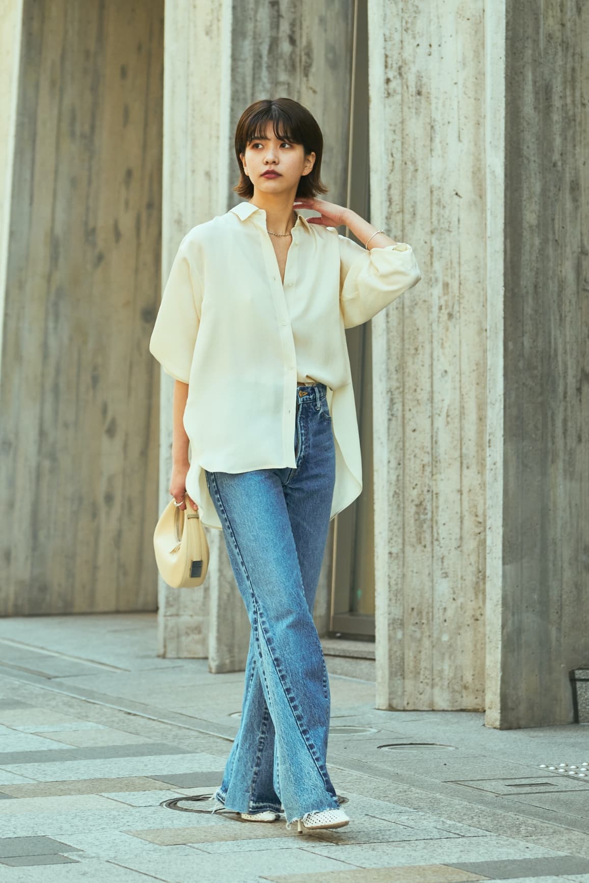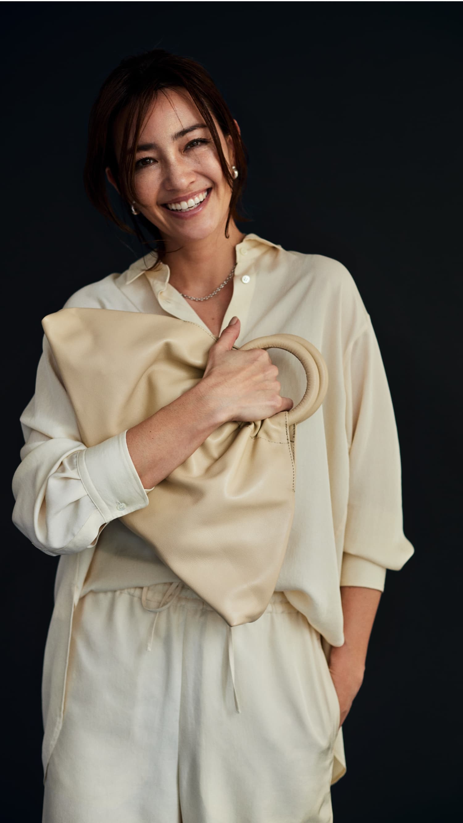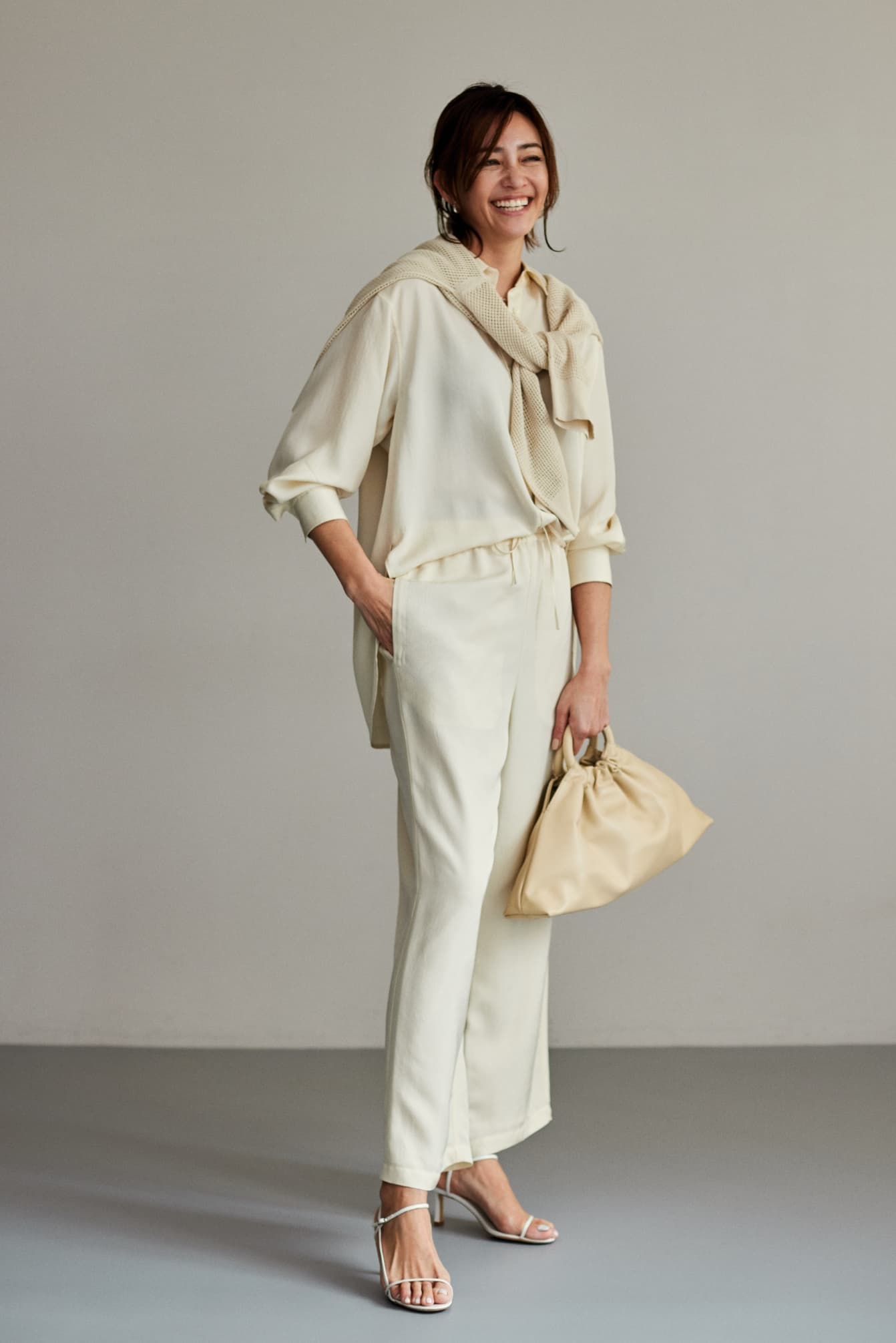 「シャツは前だけインして、腰回りをすっきりと。バッグまで色をつなげたワントーンに。あいまいな配色でいて、くすまないベージュがフレッシュさを。まさにヘルシー美人を体現してくれます」。