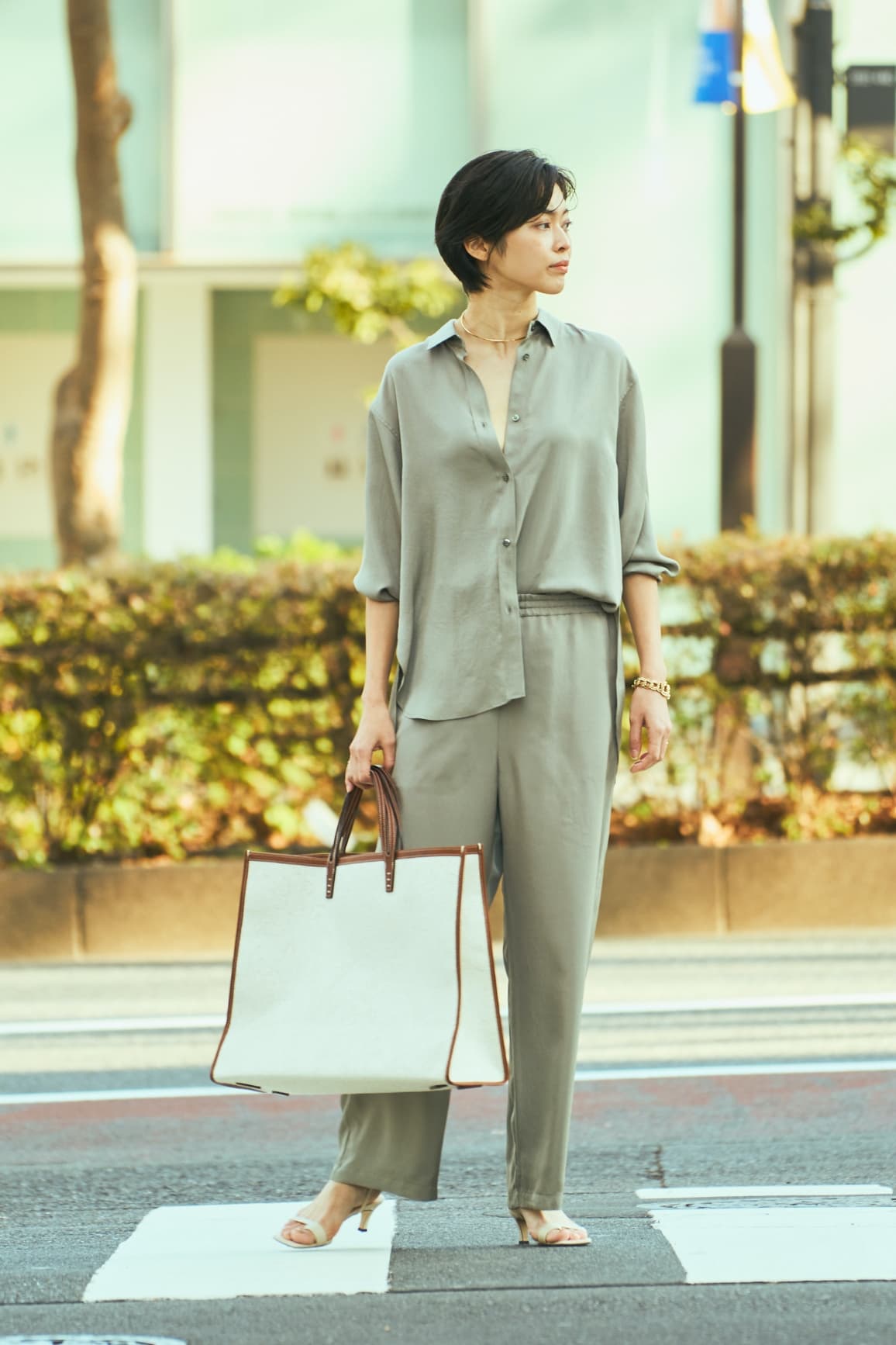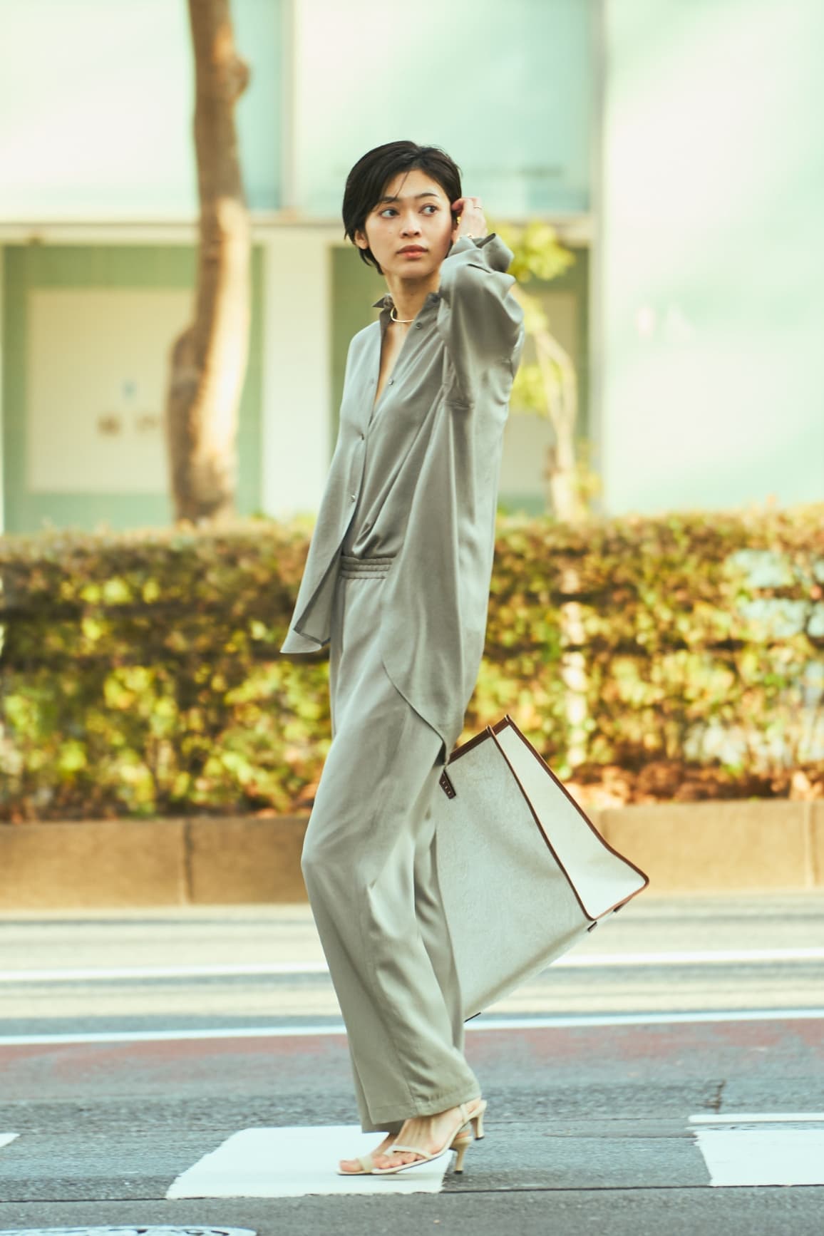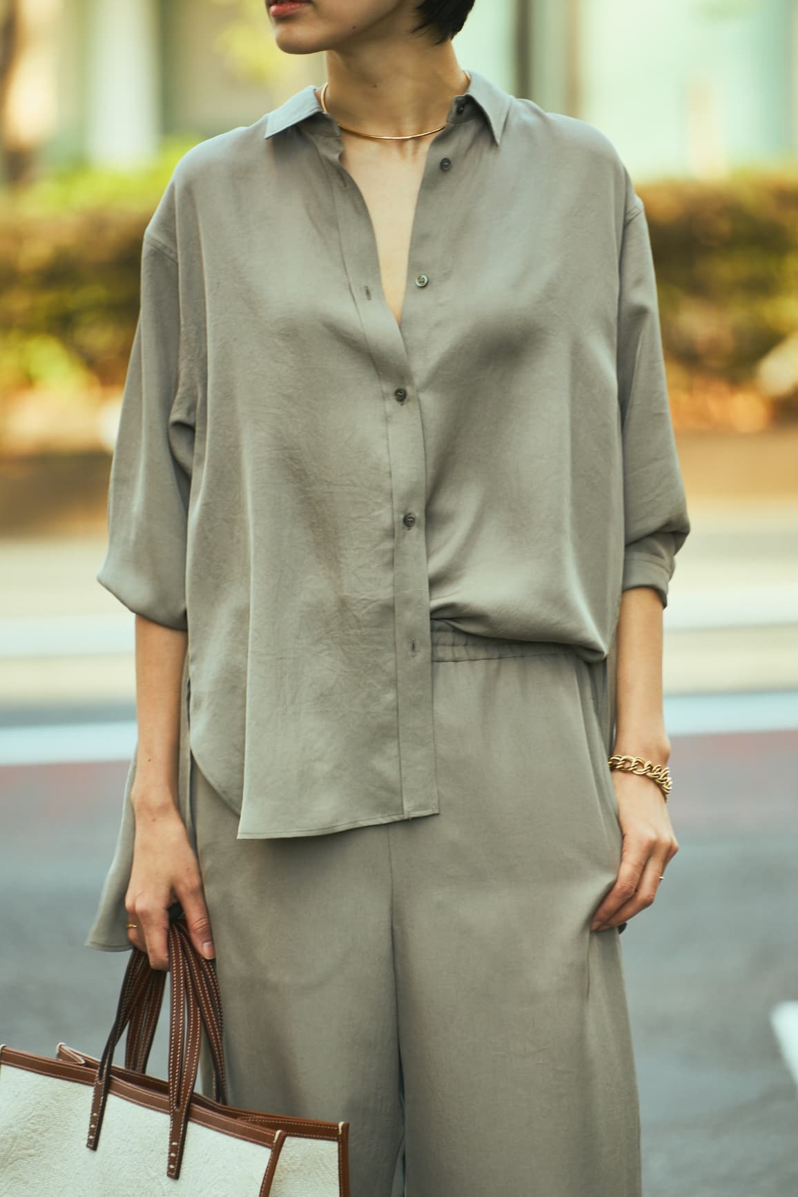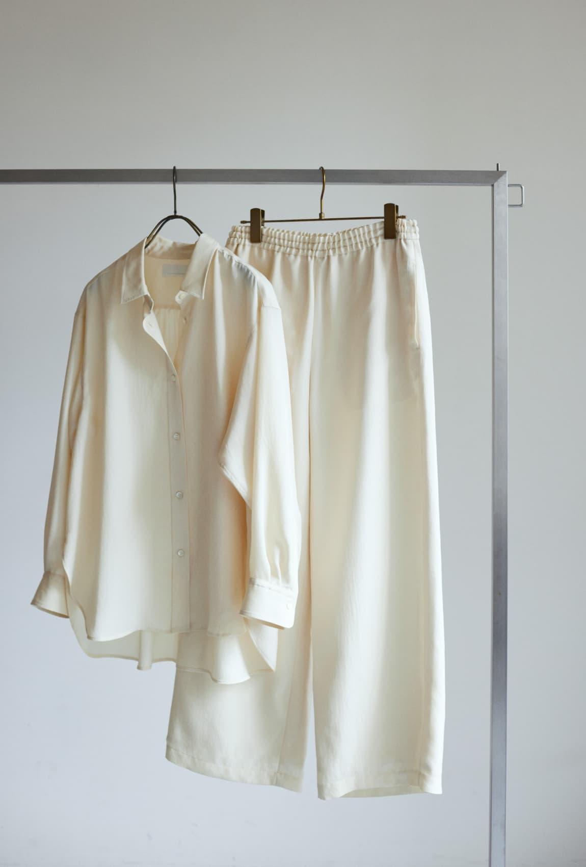 「こなれ感もリッチ感も叶う、イージーなシャツとワイドパンツ。セットアップに抱くかっちりとしたイメージが変わり、新鮮な風を運んでくれます。少し光沢のあるドライタッチな風合いとしなやかなドレープ感が着こなしの表情を豊かに、生き生きと。気負いなくまとうことで大人の余裕を。オンもオフもシーンレスに楽しめます」。