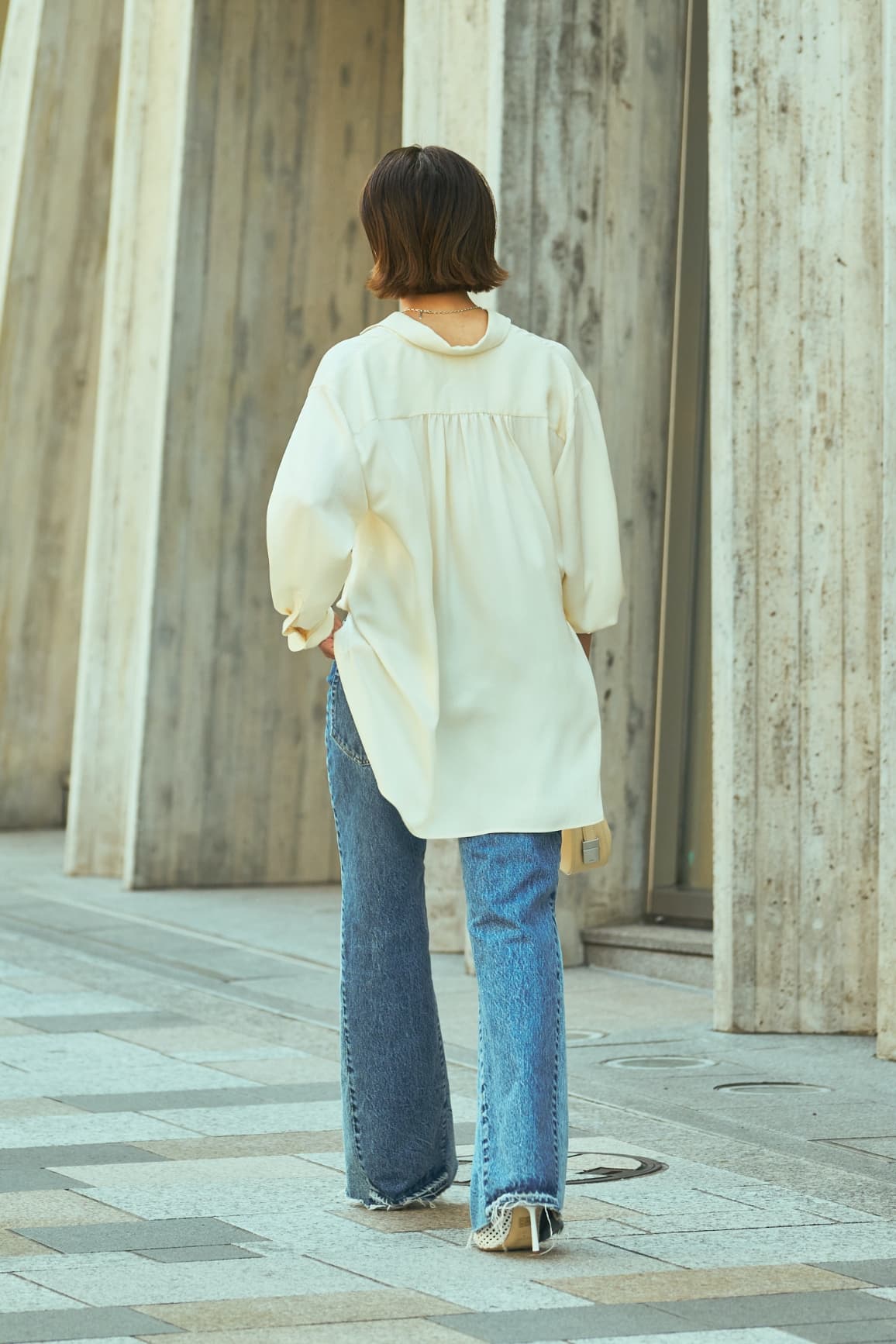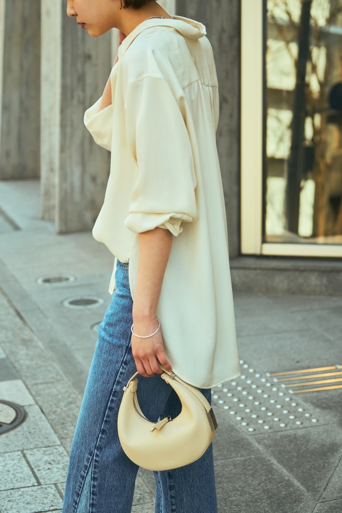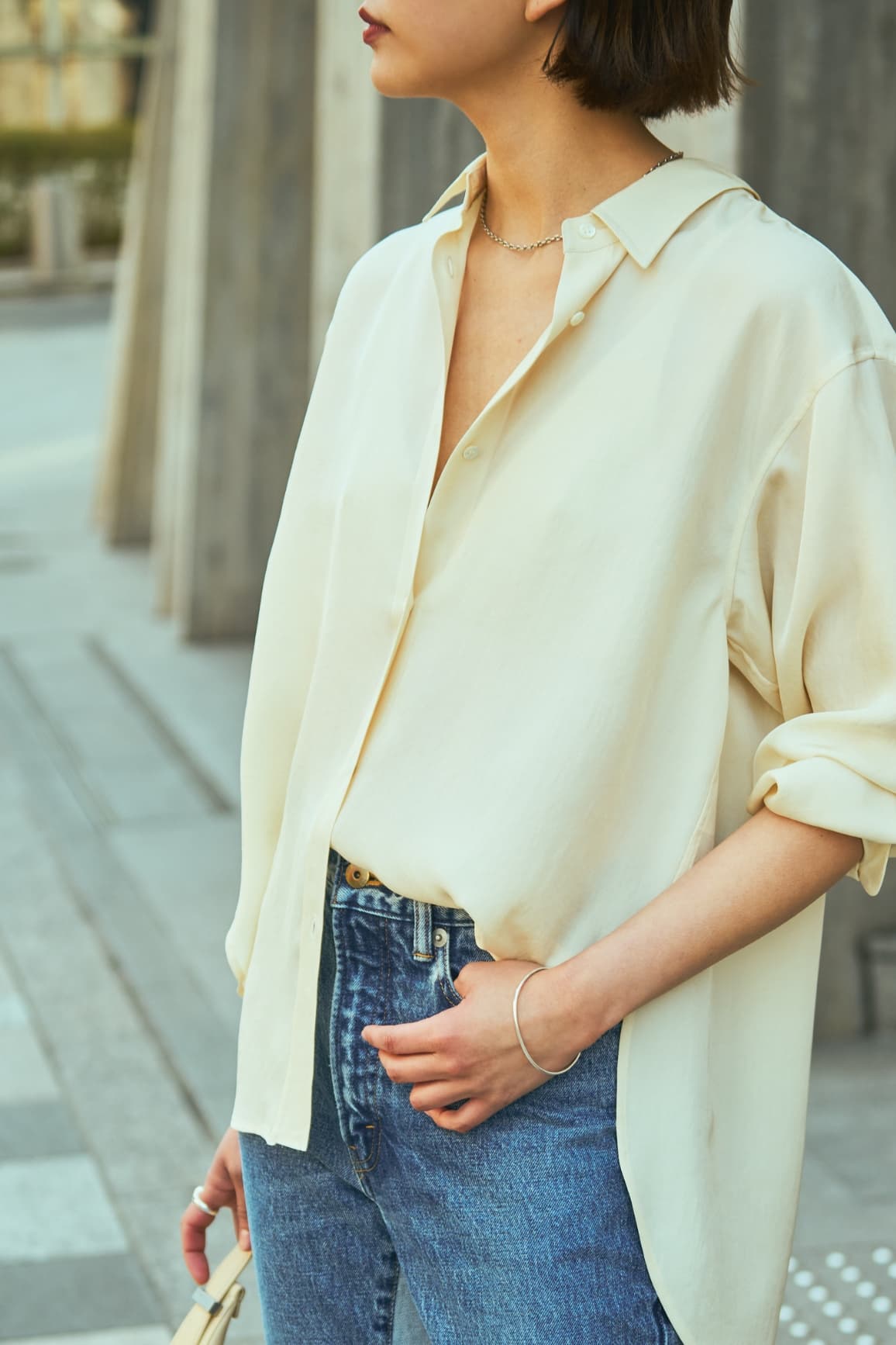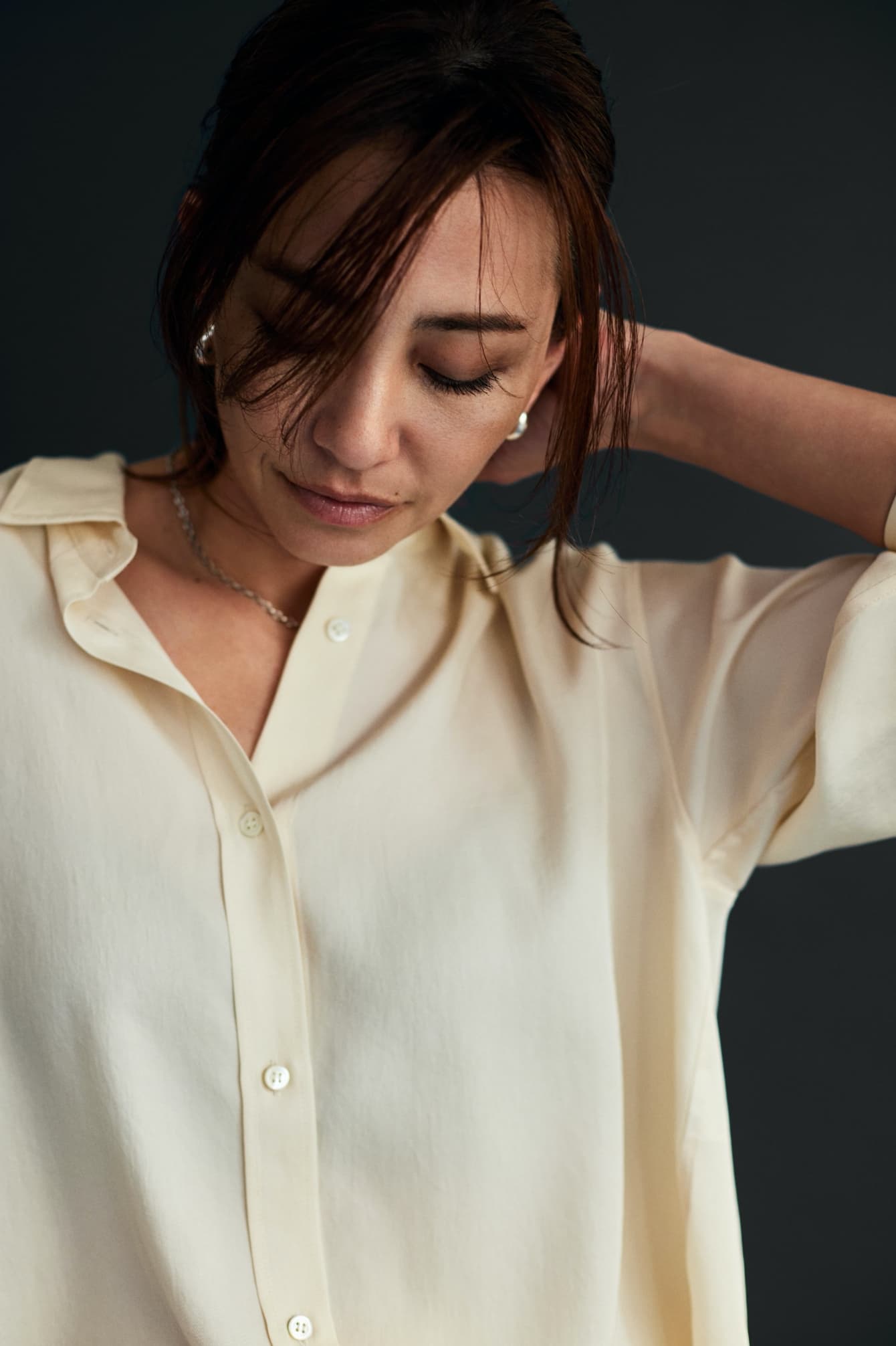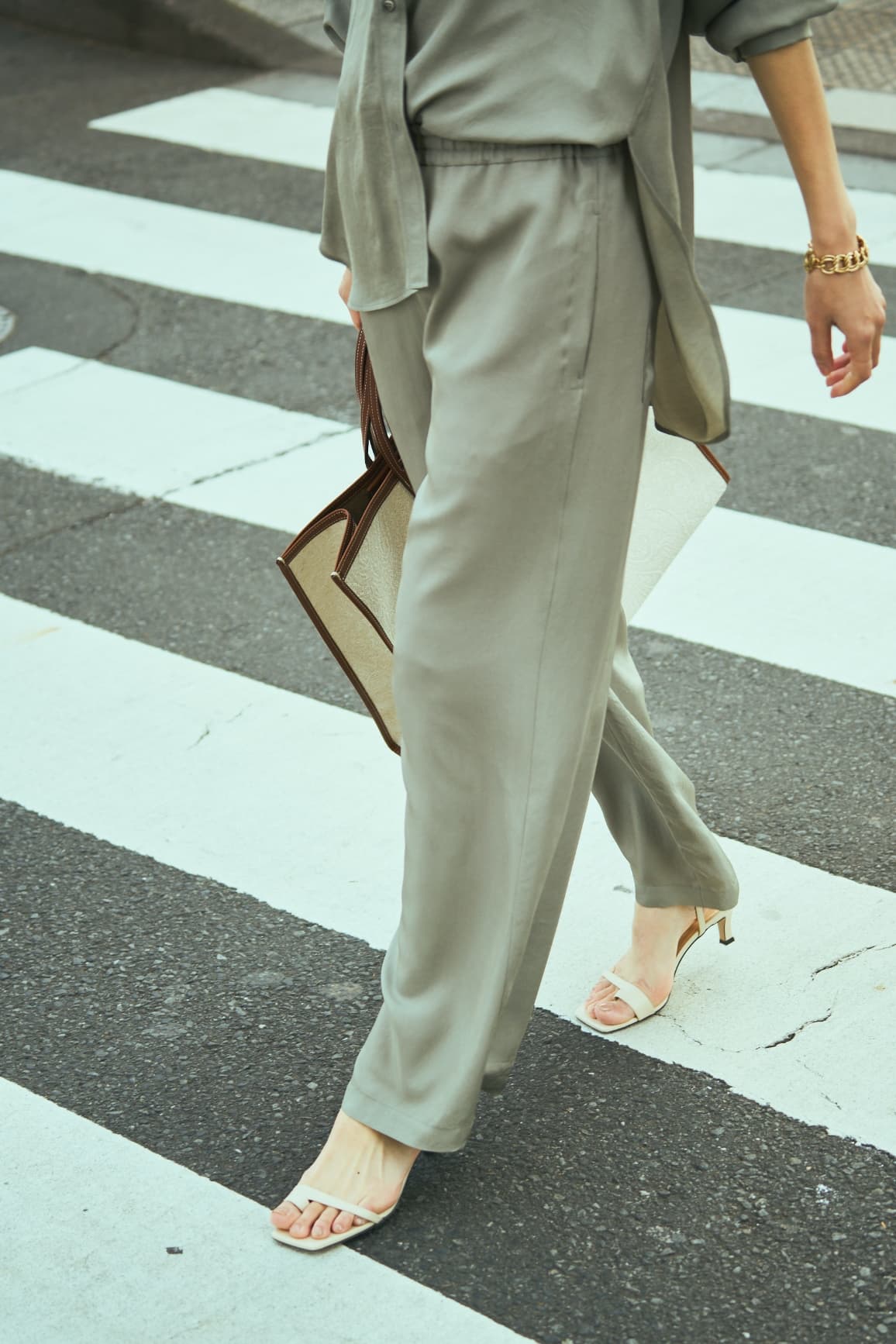 「こなれ感もリッチ感も叶う、イージーなシャツとワイドパンツ。セットアップに抱くかっちりとしたイメージが変わり、新鮮な風を運んでくれます。少し光沢のあるドライタッチな風合いとしなやかなドレープ感が着こなしの表情を豊かに、生き生きと。気負いなくまとうことで大人の余裕を。オンもオフもシーンレスに楽しめます」。