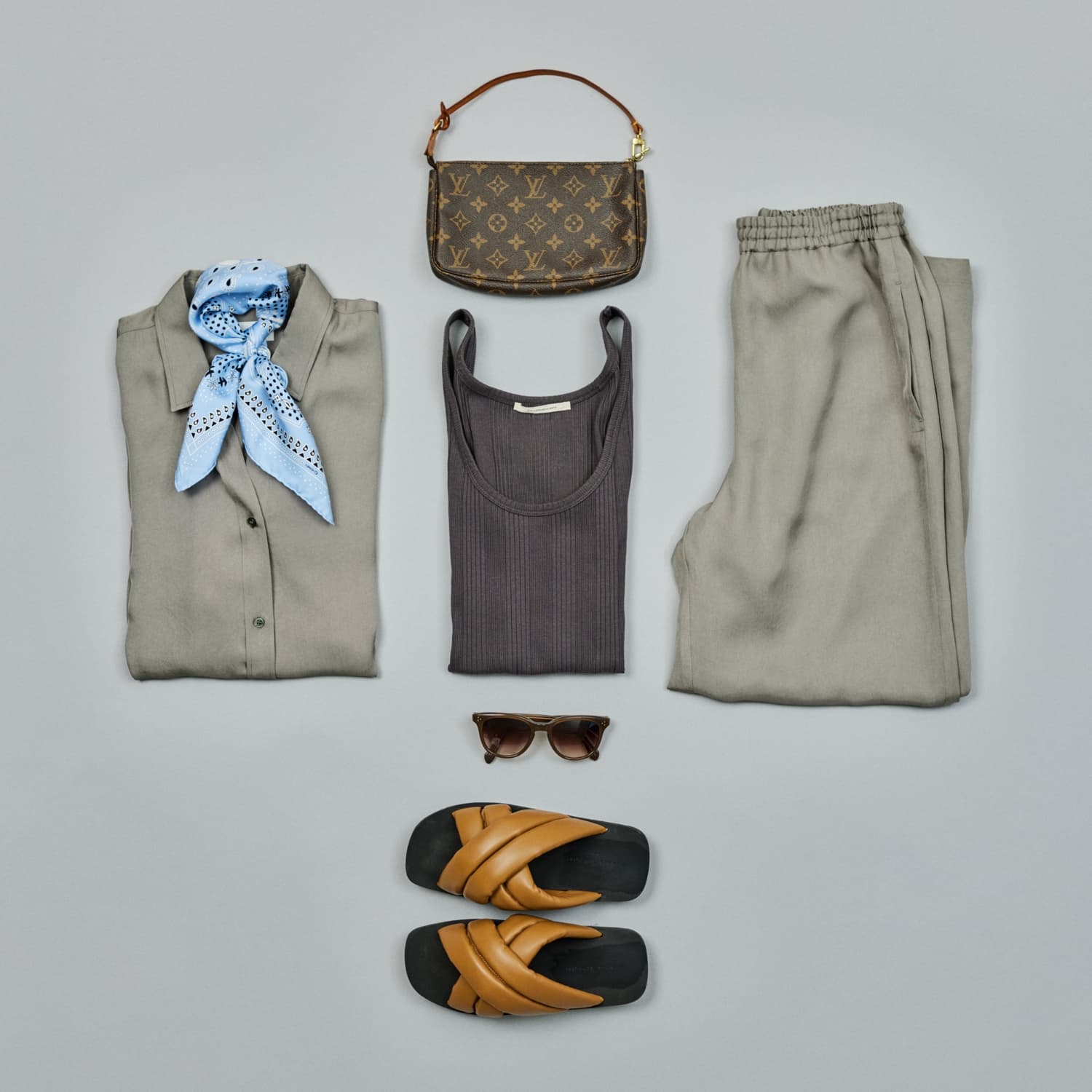 「シャツはタンクトップにゆったりとメンズっぽく羽織るイメージ。グレーがぼんやり見えないように、パワーのある色柄小物で自分らしい遊びを。当初スカーフはつけていなかったのですが、渋めの色合わせがちょっと地味かなと悩み、最後に加えました」。(村山佳世子)