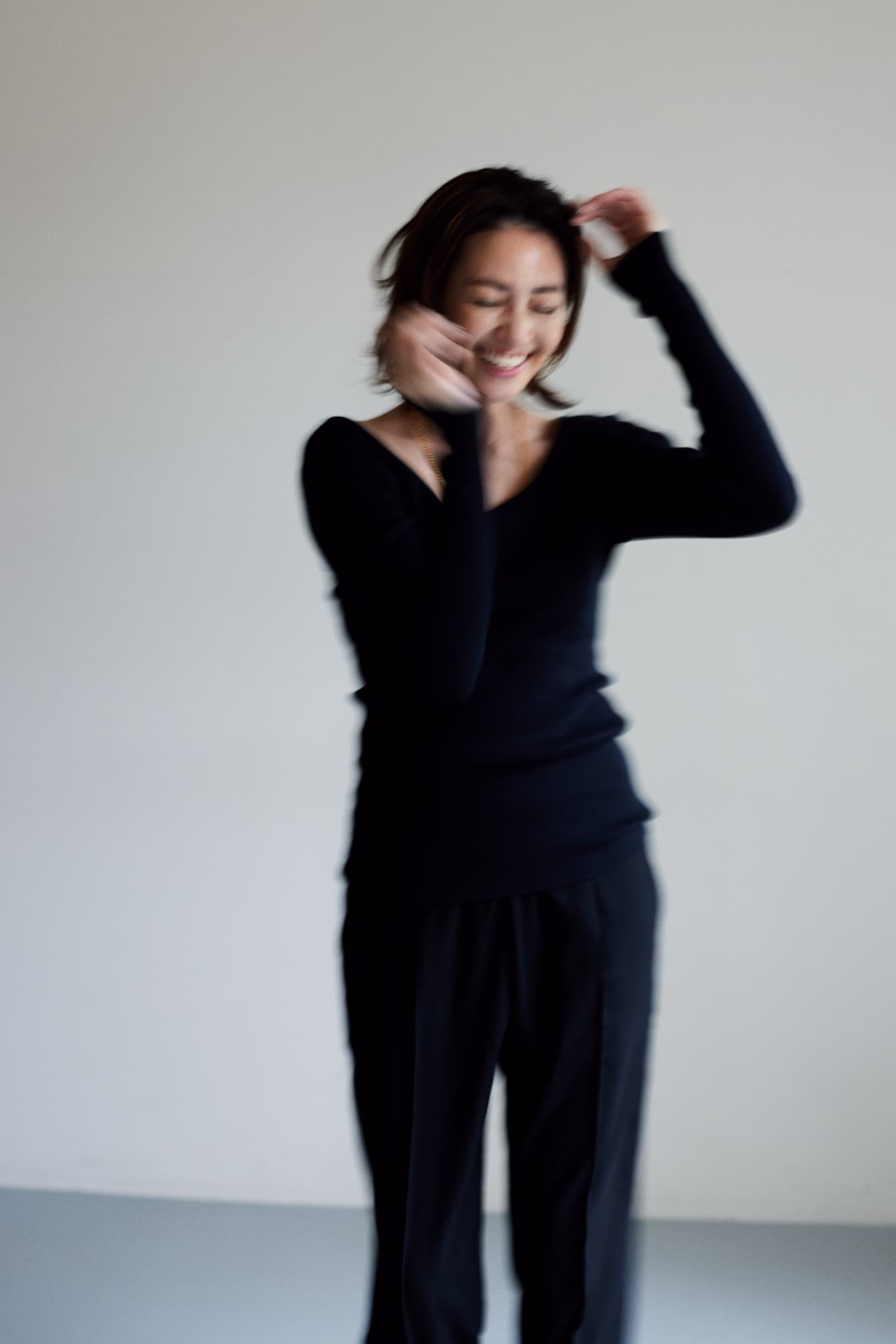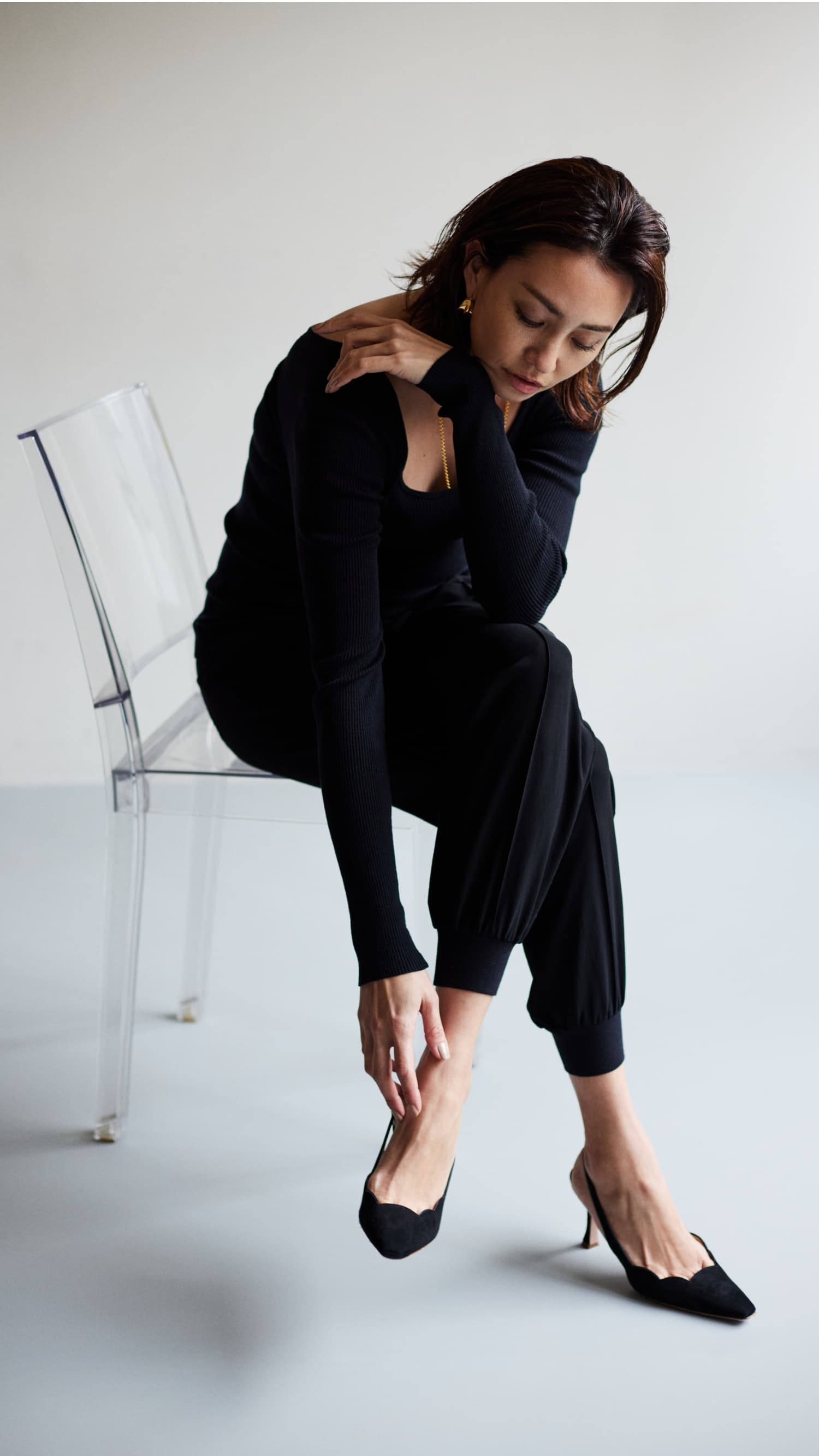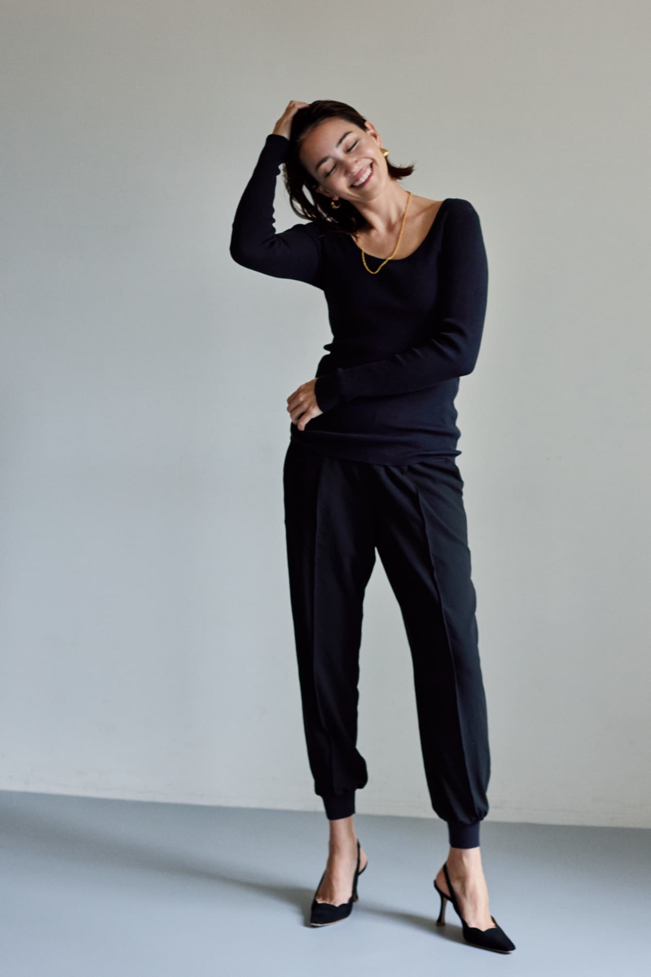 「迫力が出てしまいがちなオールブラックも、素肌を効果的に見せすることで女性らしく。リブニットは胸元の開きは深く、袖が長めなのもポイント。上半身をすっきりと見せて、デコルテを際立たせてくれます」。