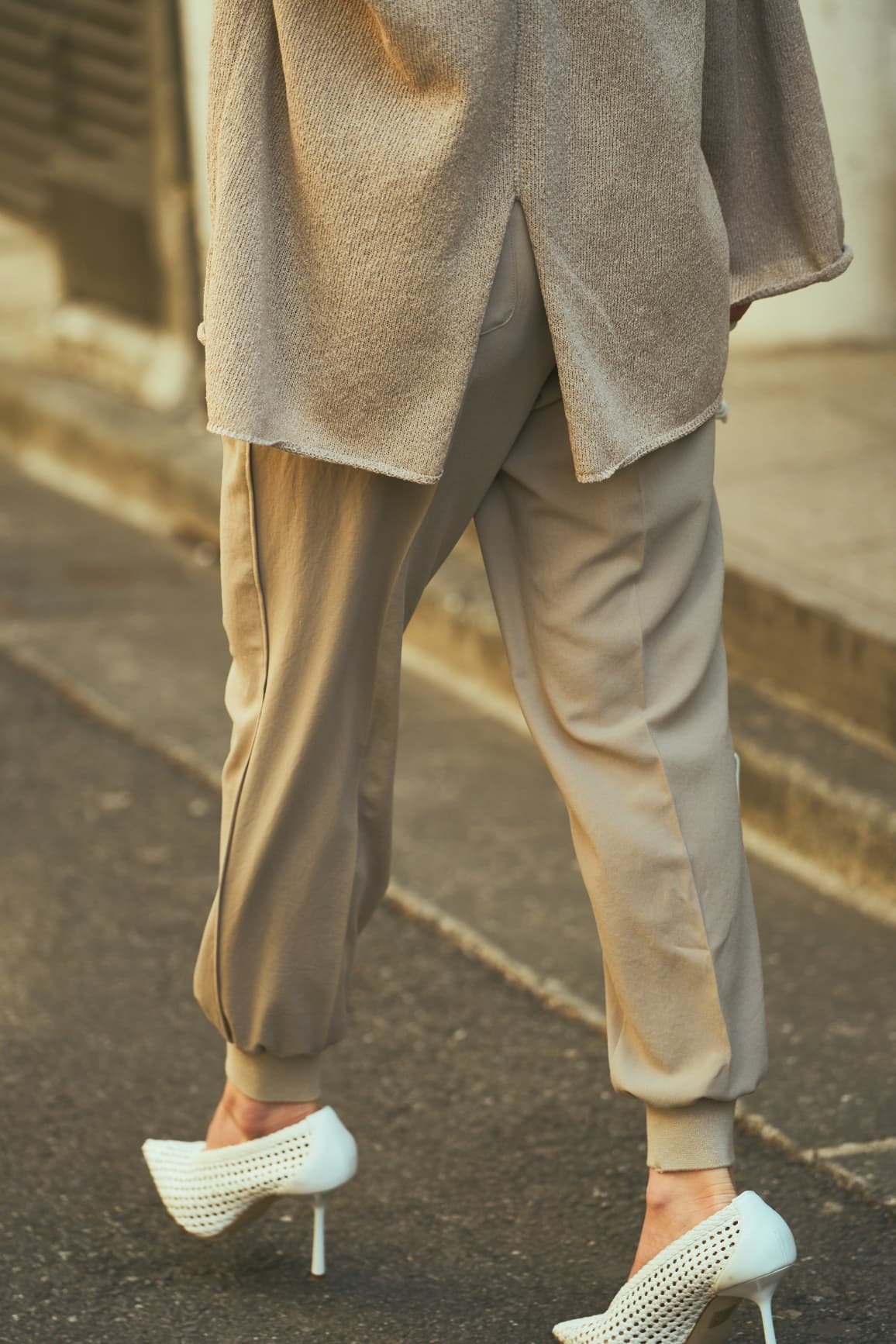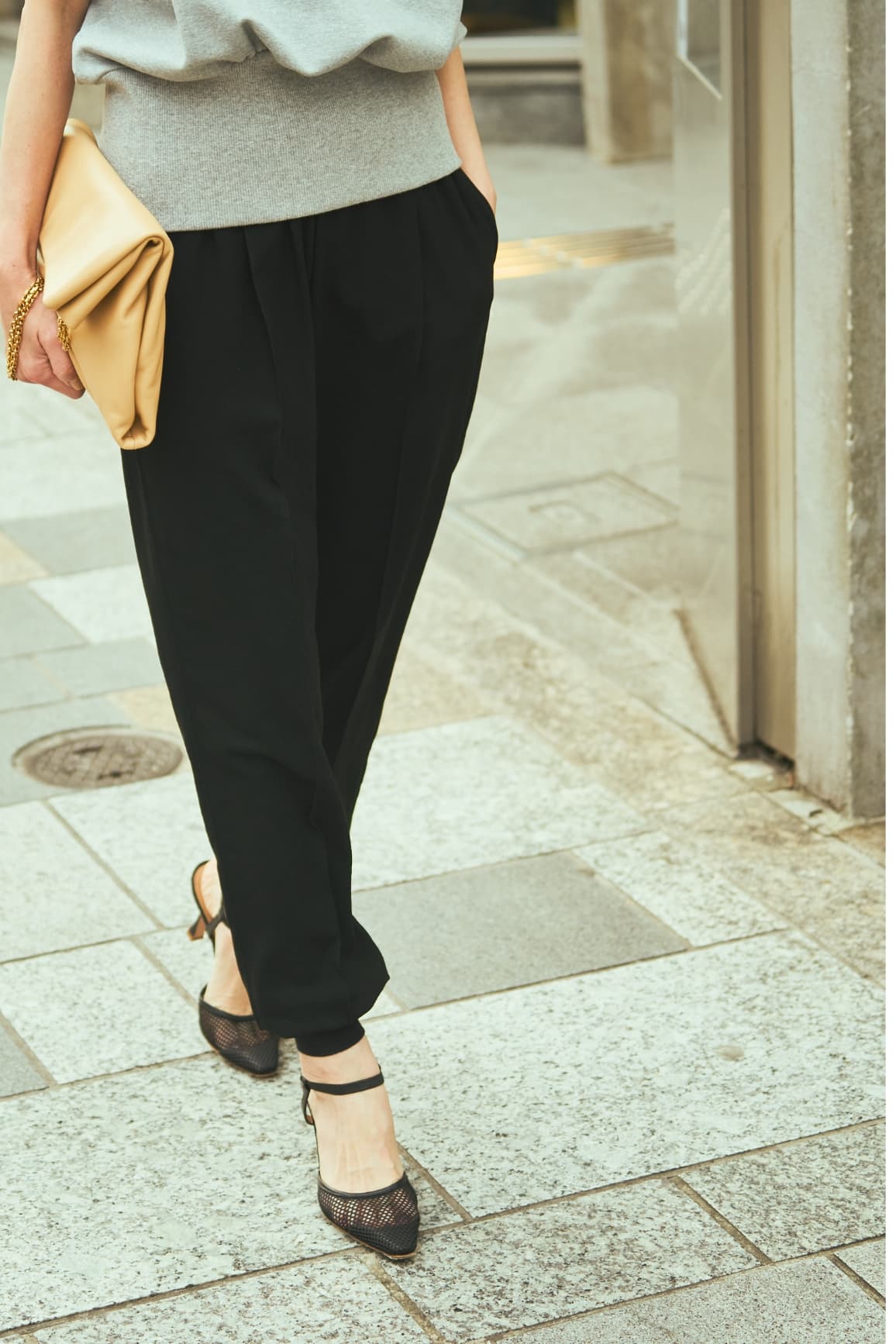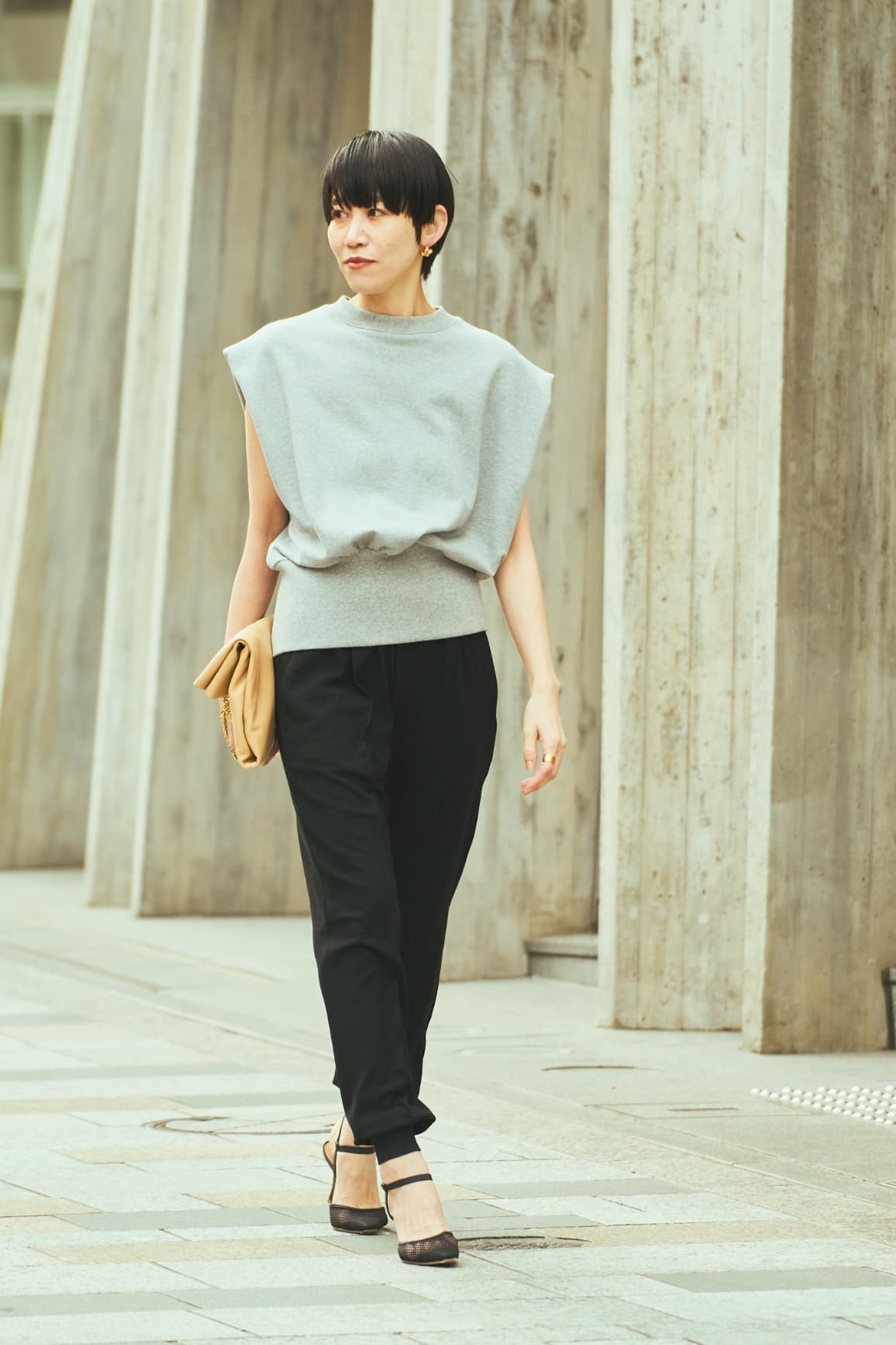 「改良を重ねているというジョガーパンツは肉感を拾わず、脚をすらりと美しく見せてくれます。通気性が良く、清涼感のある素材も魅力。何度も言うようですが、パンツ一本でヘルシー美人が叶います」。