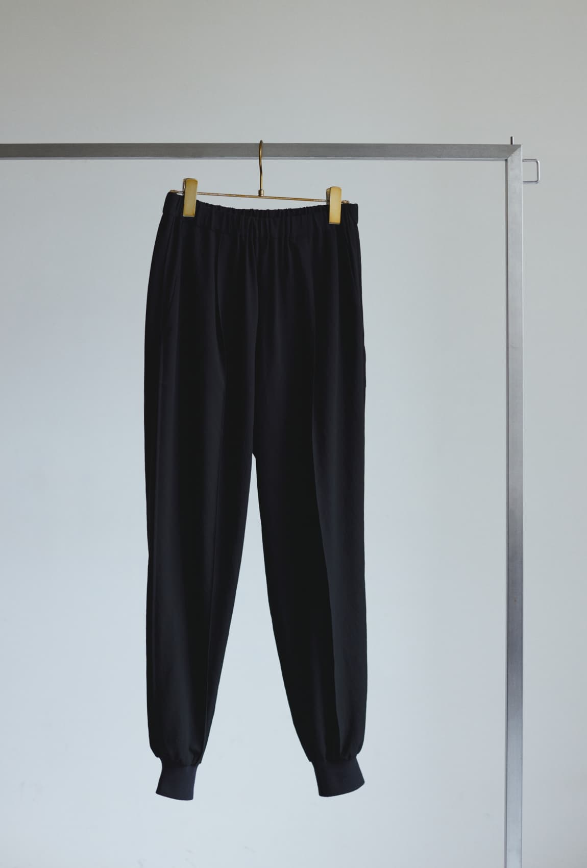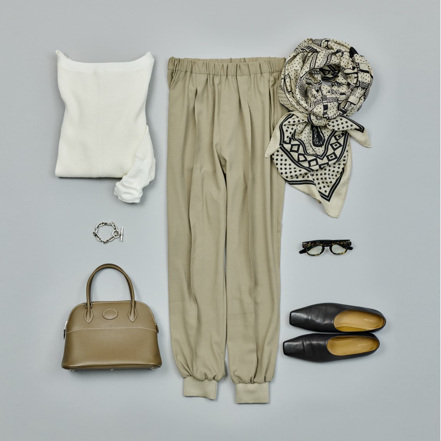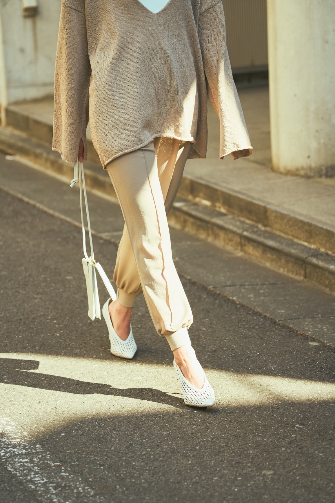 「改良を重ねているというジョガーパンツは肉感を拾わず、脚をすらりと美しく見せてくれます。通気性が良く、清涼感のある素材も魅力。何度も言うようですが、パンツ一本でヘルシー美人が叶います」。