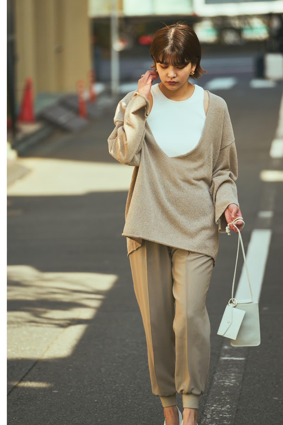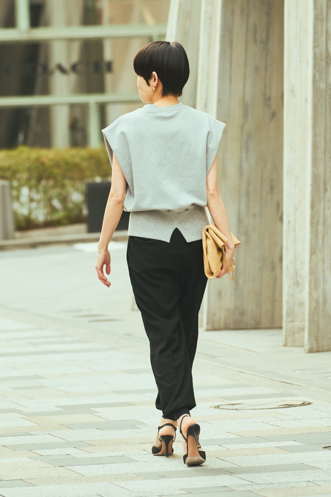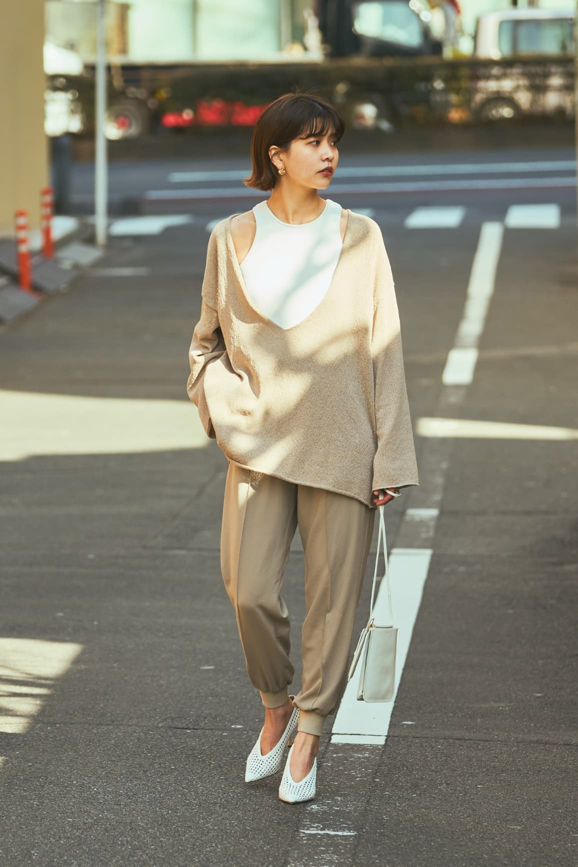 「デコルテや背中を広く露出するとき、足首がきゅっと締まったアンクル丈のジョガーパンツがヘルシーに導くバランサーに。肌見せする分量は、体型やキャラクターにもよるかと思いますが、これくらいを目安に。スポーティなアイテムやラフなムードでバランスを取るなどして、露骨なのは避けましょう」。