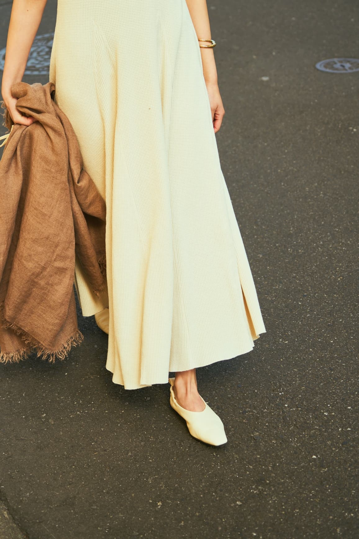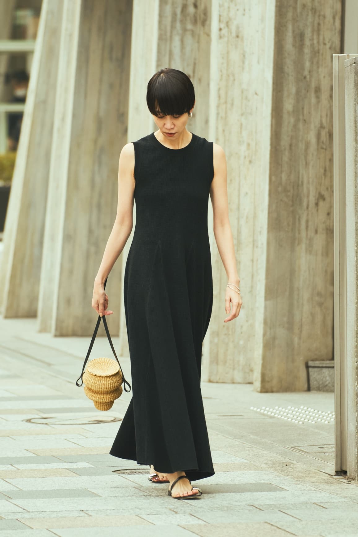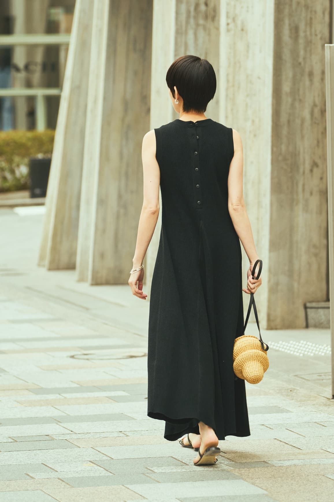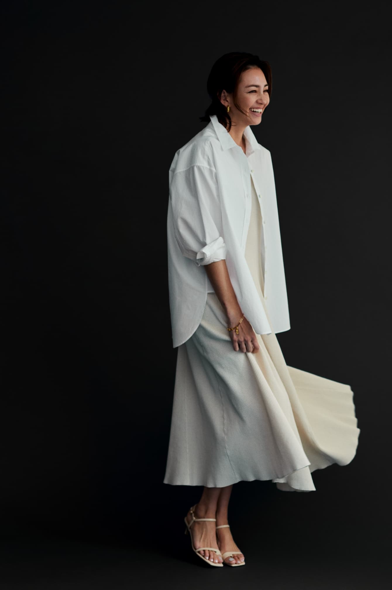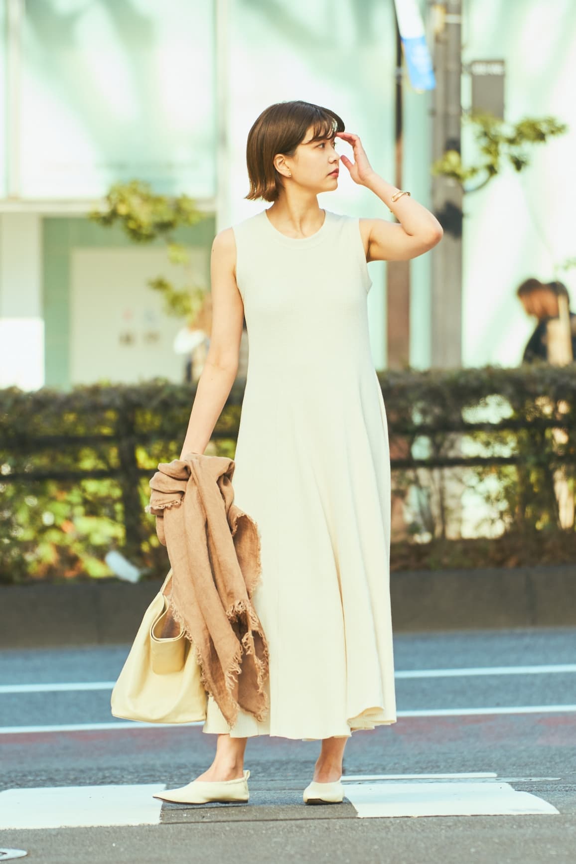 「スリーブレスなので、シャツやGジャンなどを重ね着すると、季節を問わず活躍。夏の始まりにはコットンシャツを羽織って、トーンの異なる白を集めたコーディネイトを。きれい見えする方向でまとめてみてください」。