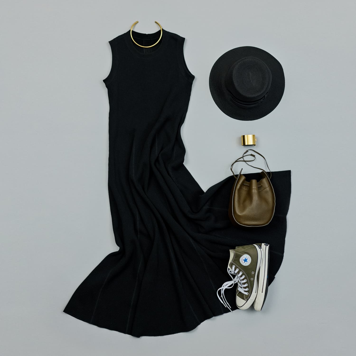 「サーマルワンピースは身構えず着られるのも嬉しい利点。私はいつも通り、履き慣れたスニーカーと。存在感のあるゴールドのアクセサリーやハットを加えて、カジュアルになり過ぎない工夫を」。(村山佳世子)