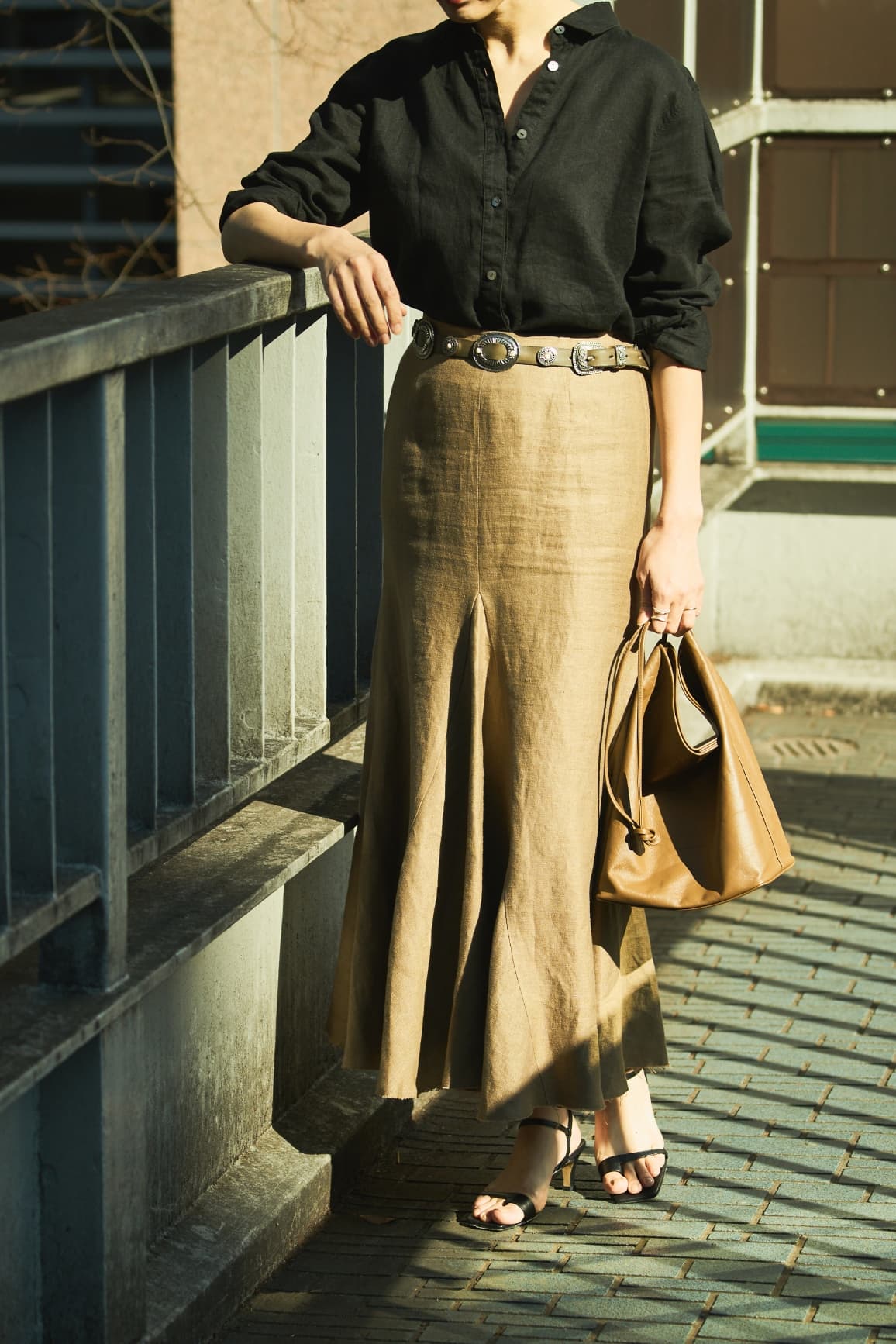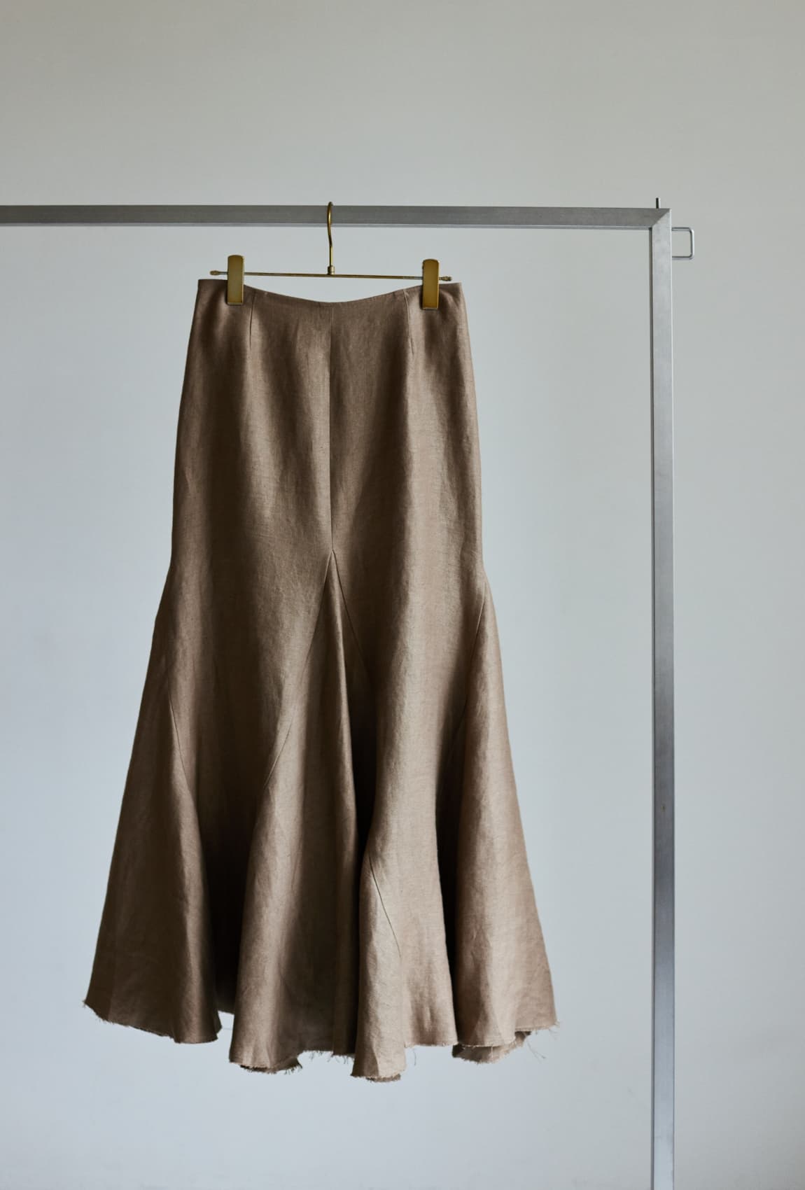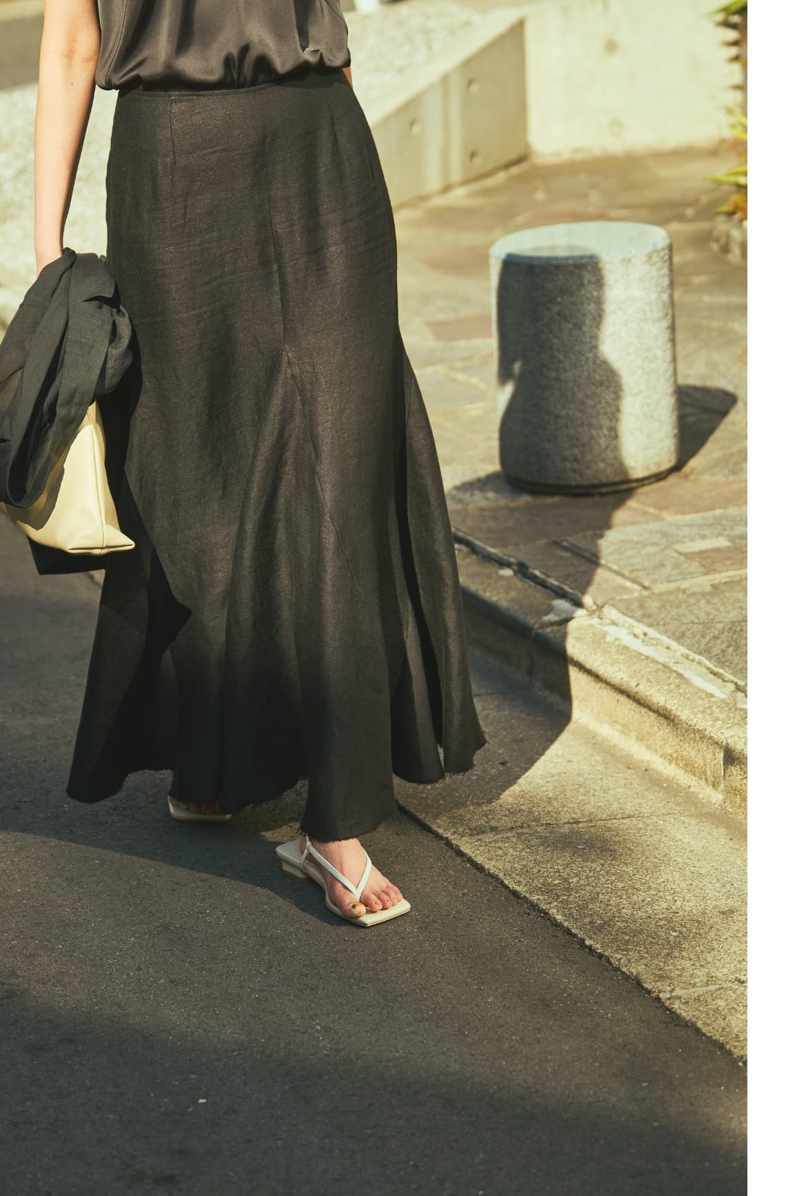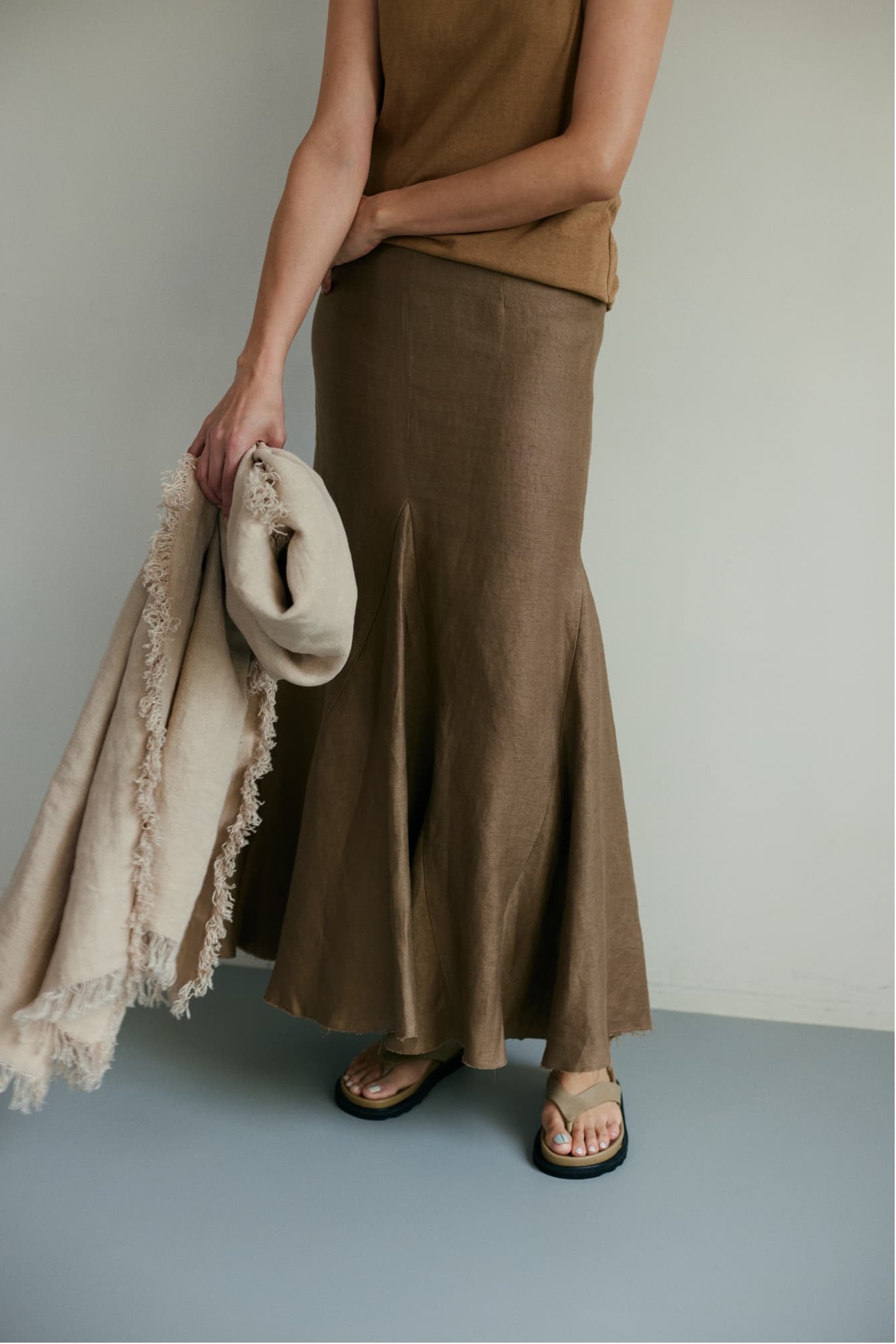 「ヴィンテージのような風合いの上質なベルギーリネンも魅力。腰回りはタイトで、裾にかけて広がるマーメイドシルエット。足元はリラクシーなトングサンダルでハズしてカジュアルダウン」。
