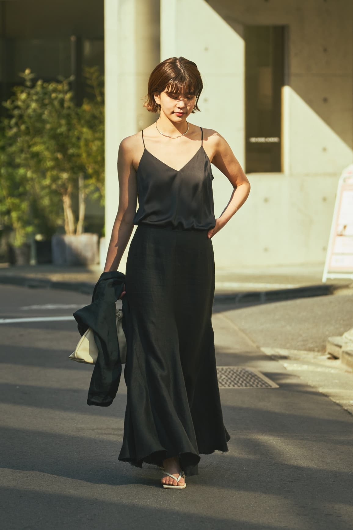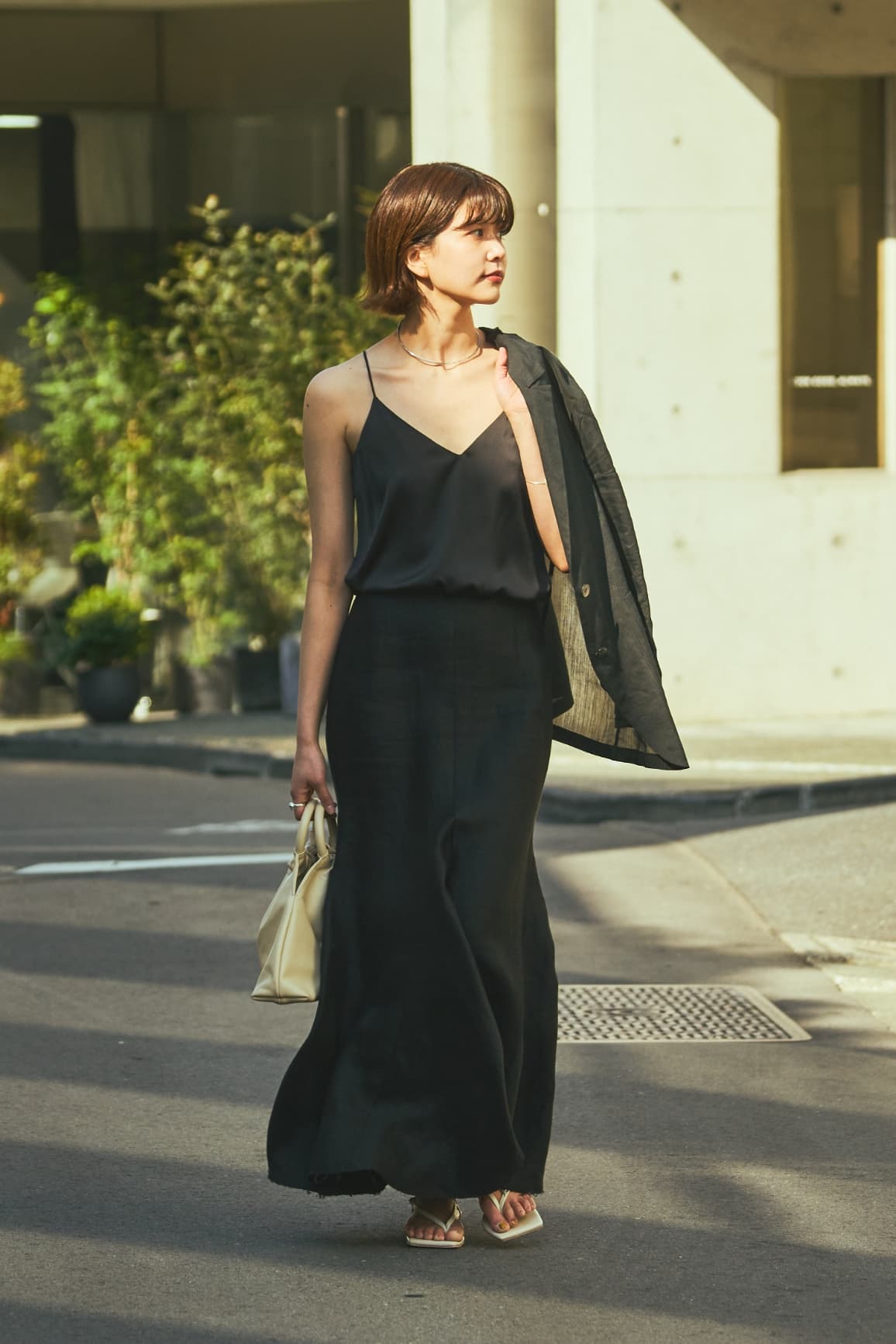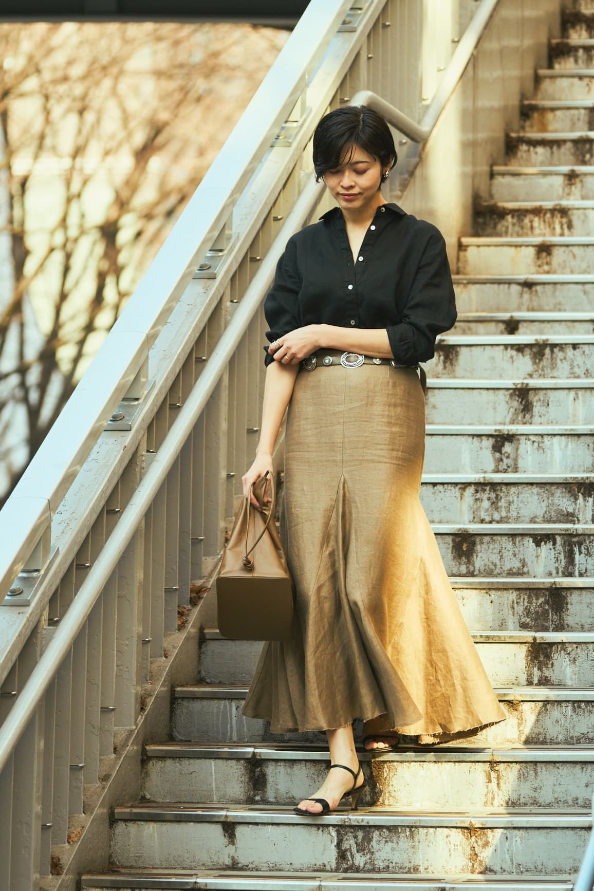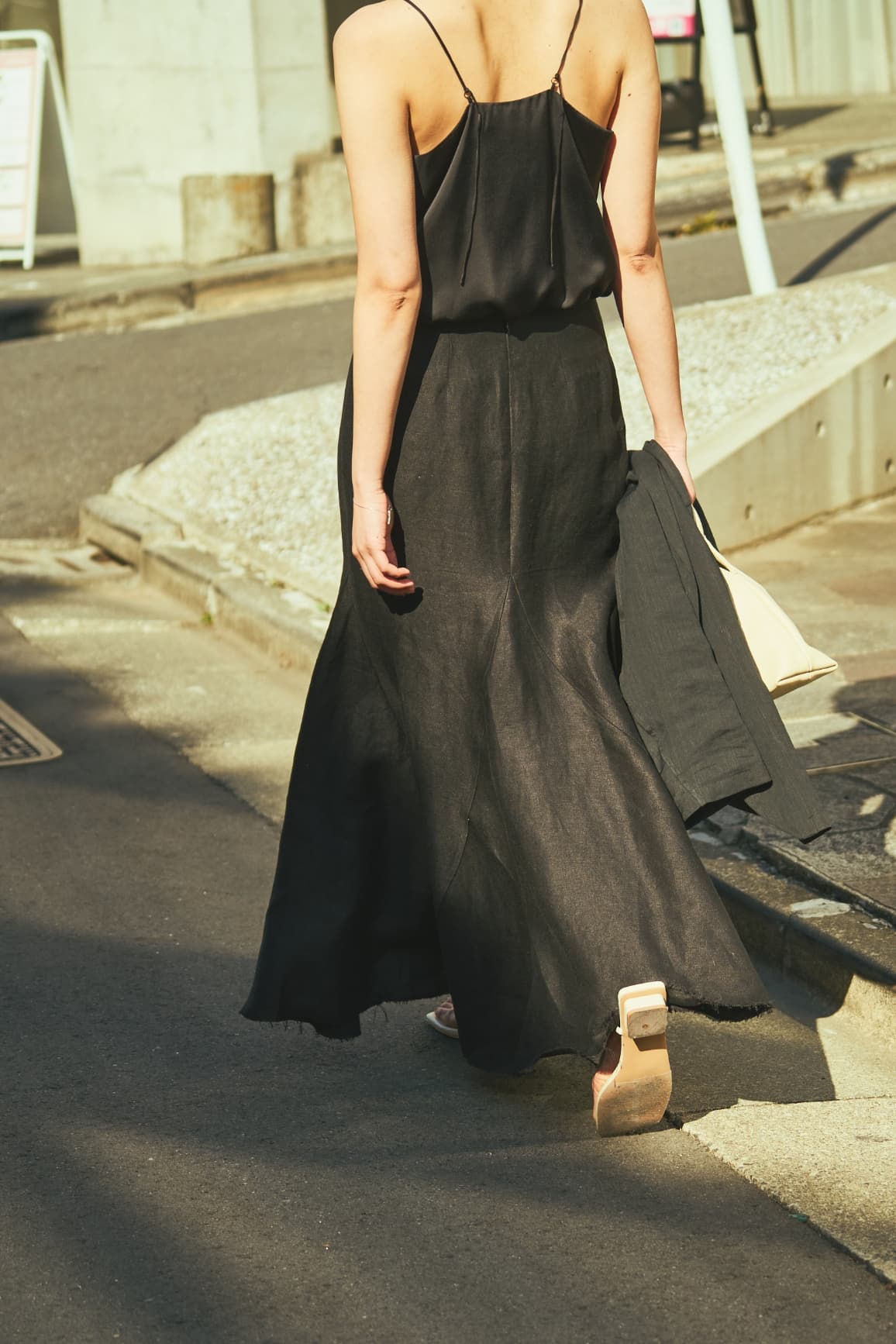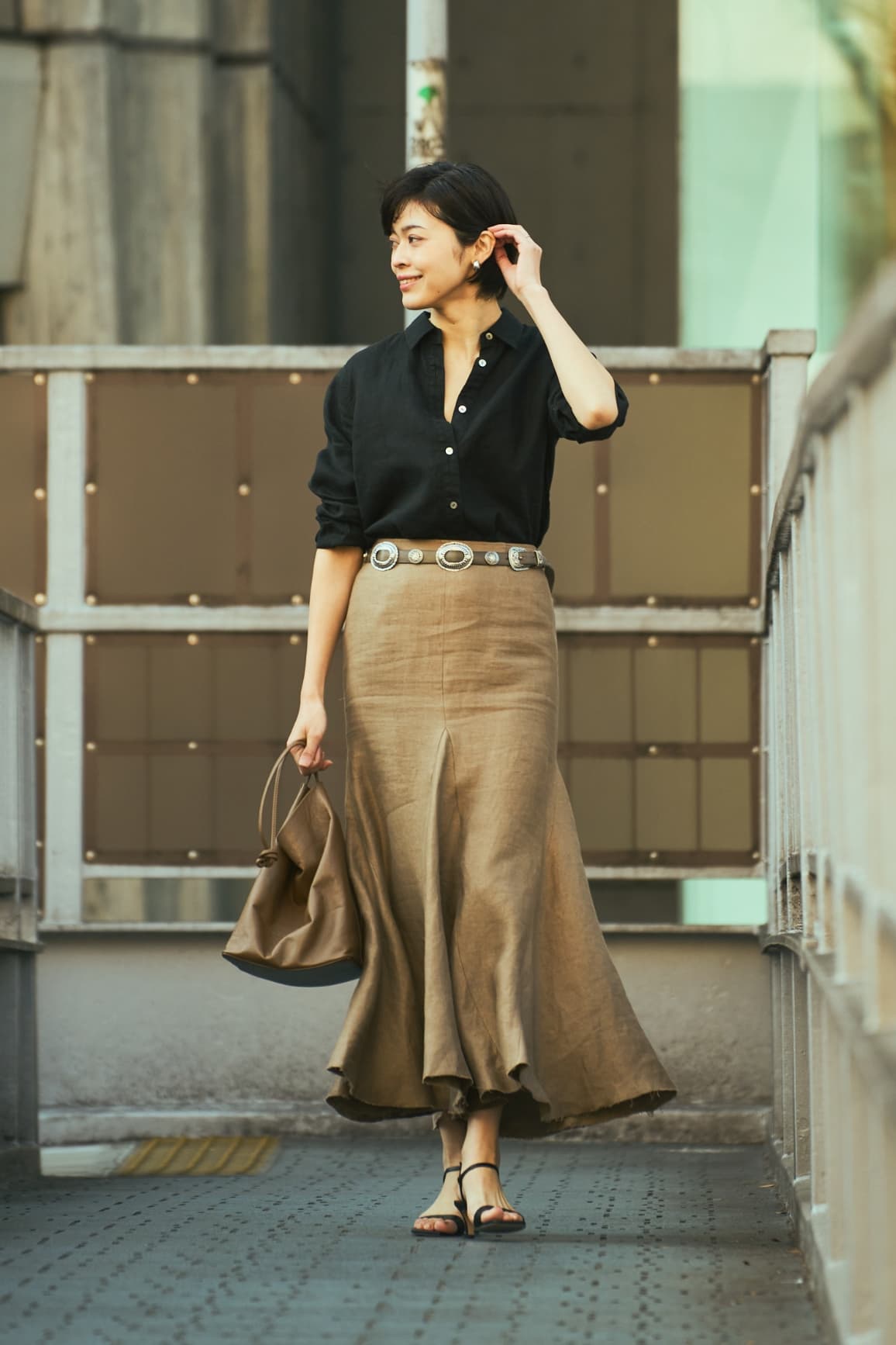 「ヴィンテージのような風合いの上質なベルギーリネンも魅力。腰回りはタイトで、裾にかけて広がるマーメイドシルエット。足元はリラクシーなトングサンダルでハズしてカジュアルダウン」。