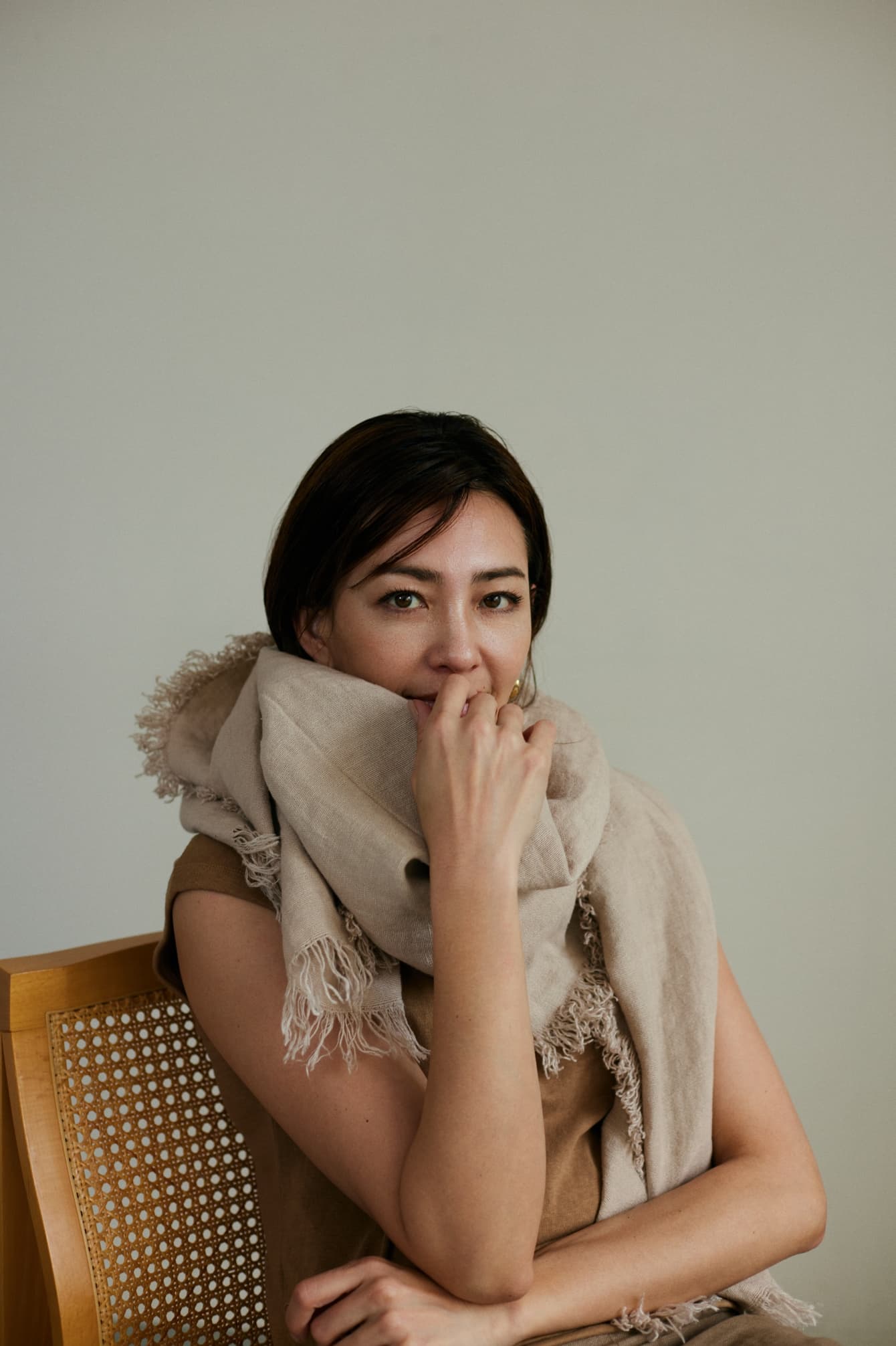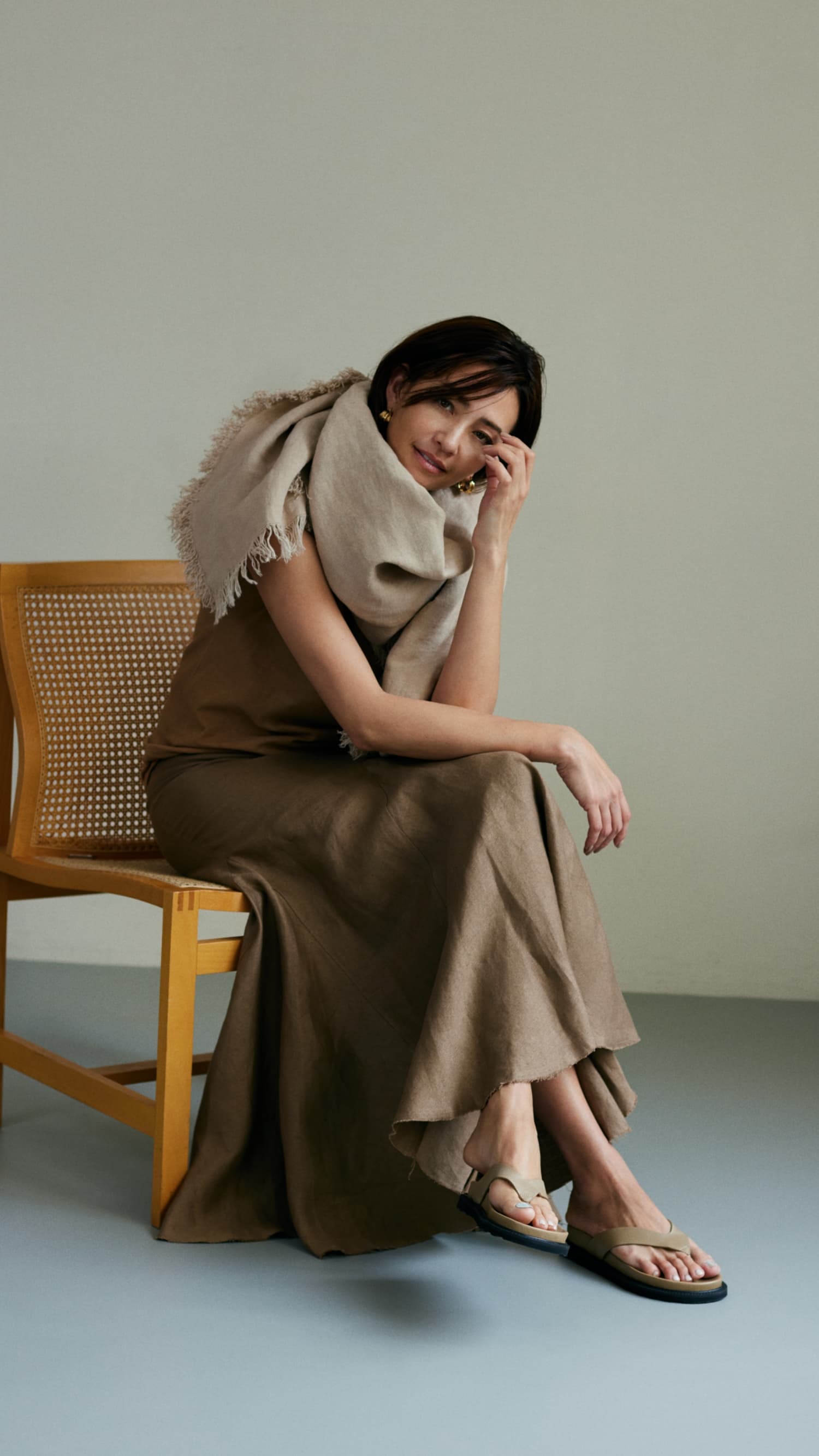 「シンプルなトップスにボリュームのあるリネンストールを巻くひと手間は、私の中で余裕と贅沢を感じるポイント。リッチ感とともに、ベージュがますますニュアンスに満ちるよう。ぜひお試しを」。