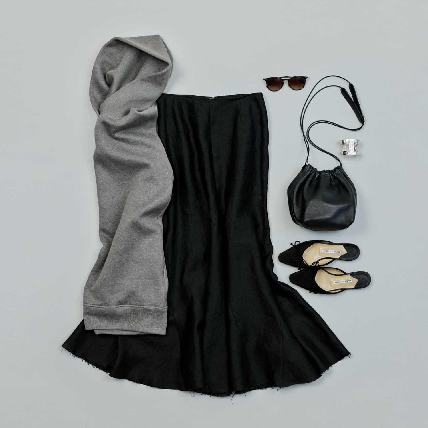 「いわゆる美人スカートは肩の力を抜いたカジュアル仕上げの方が新しい印象に見える気がします。華やかなシルエットに対して、私はついついマイナスしたくなってしまうので、クールなテイストでミニマムに着ます」。(村山佳世子)