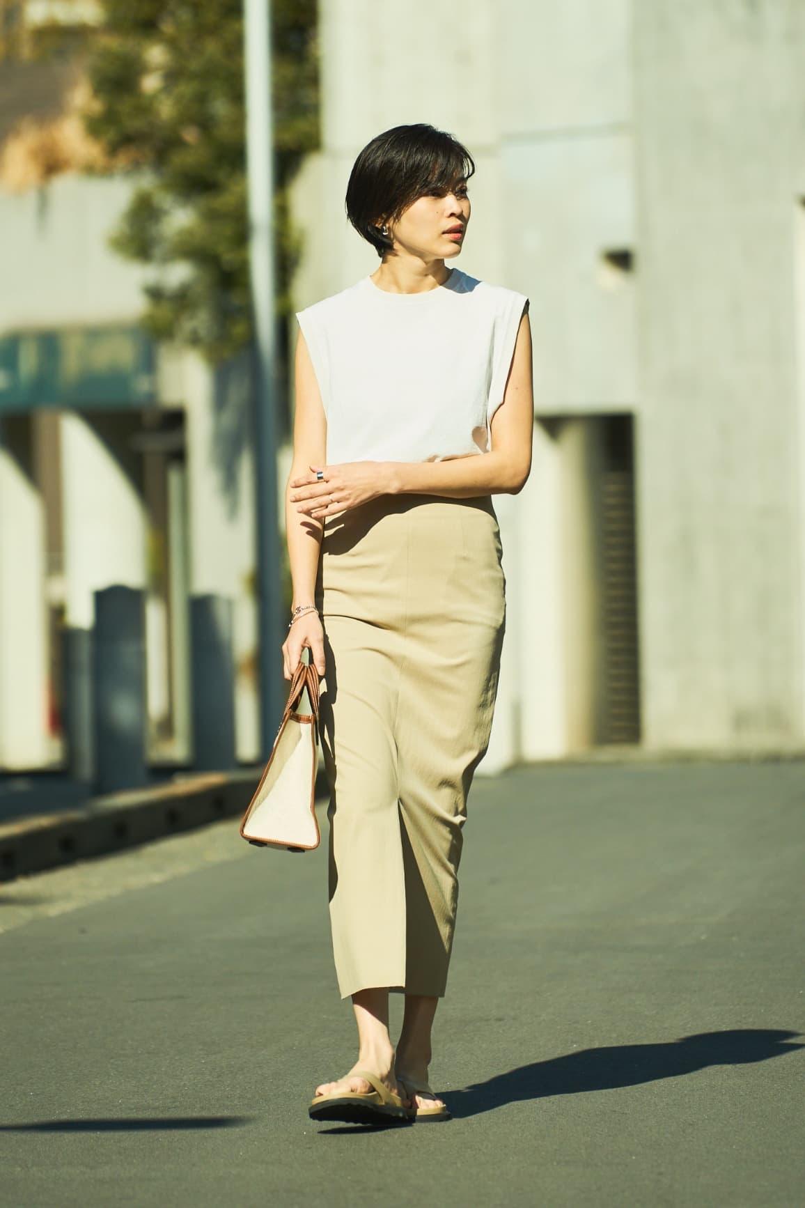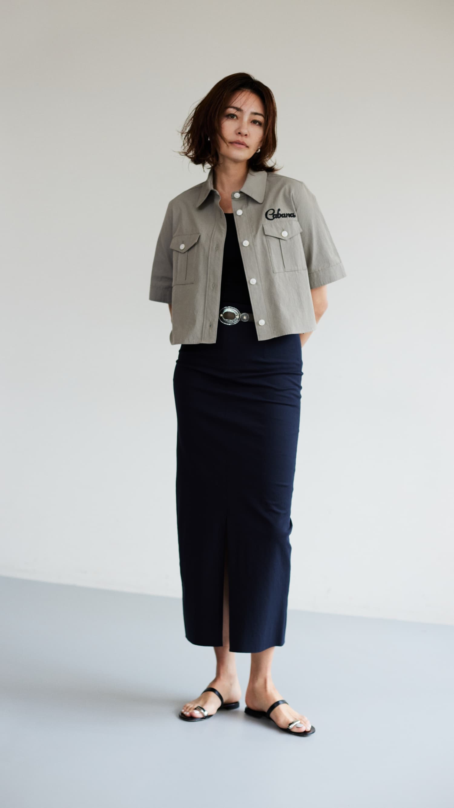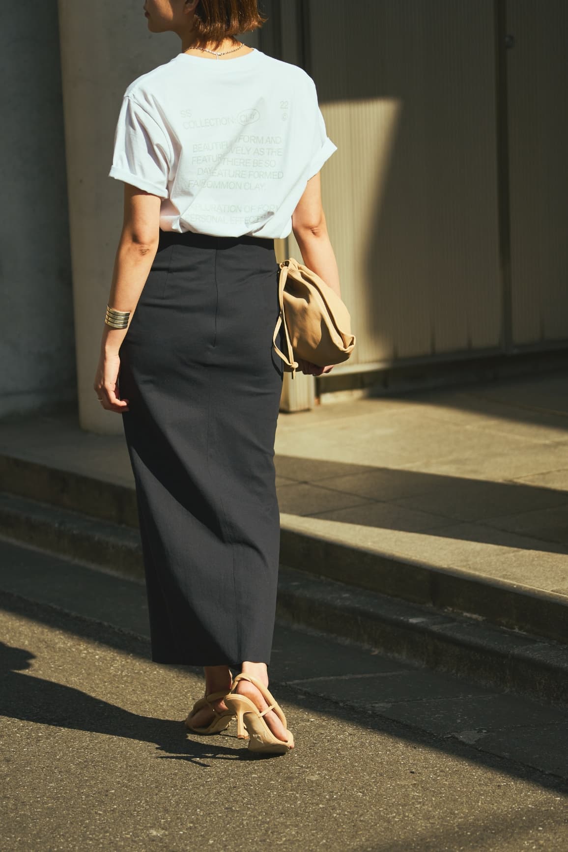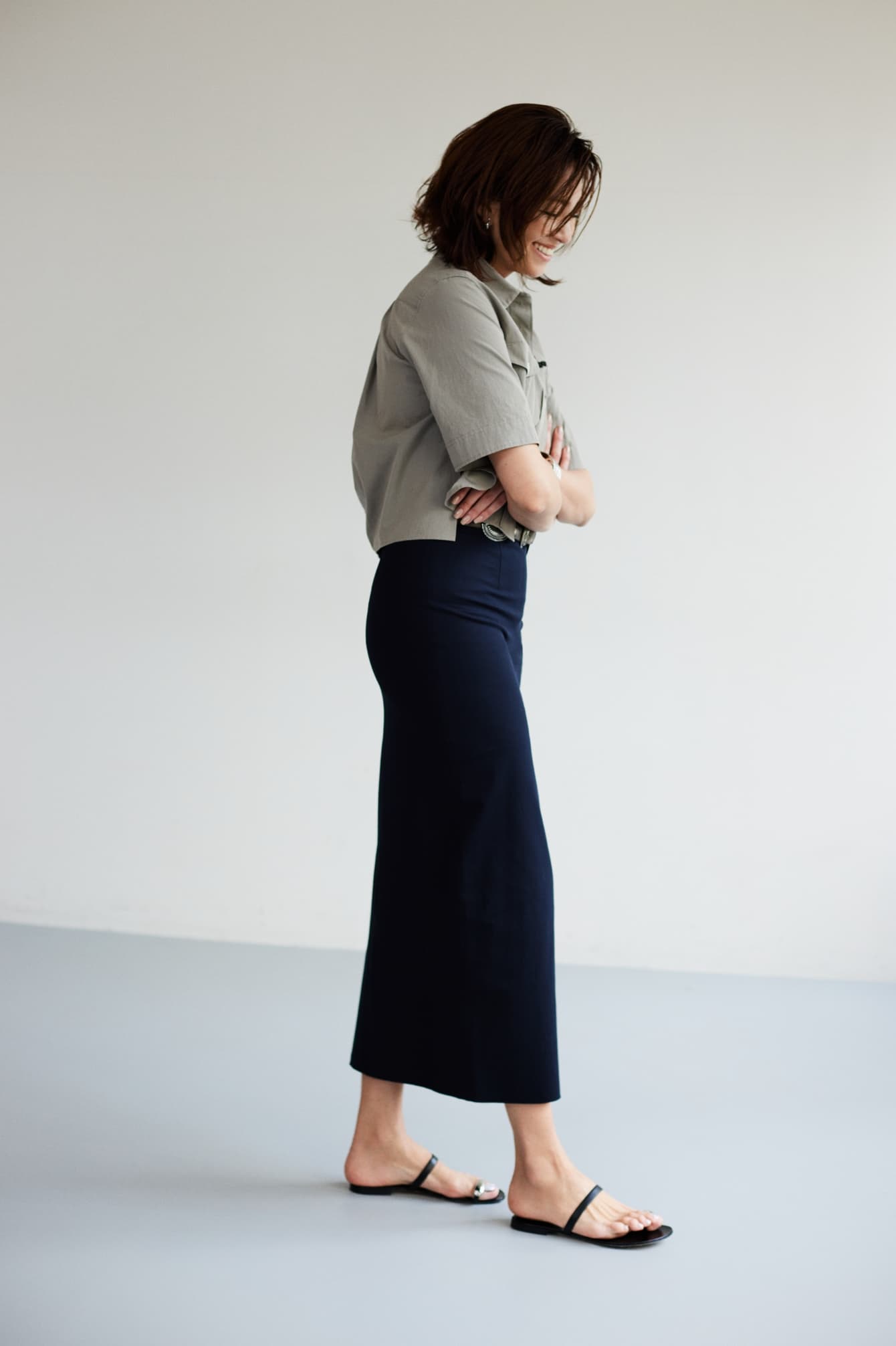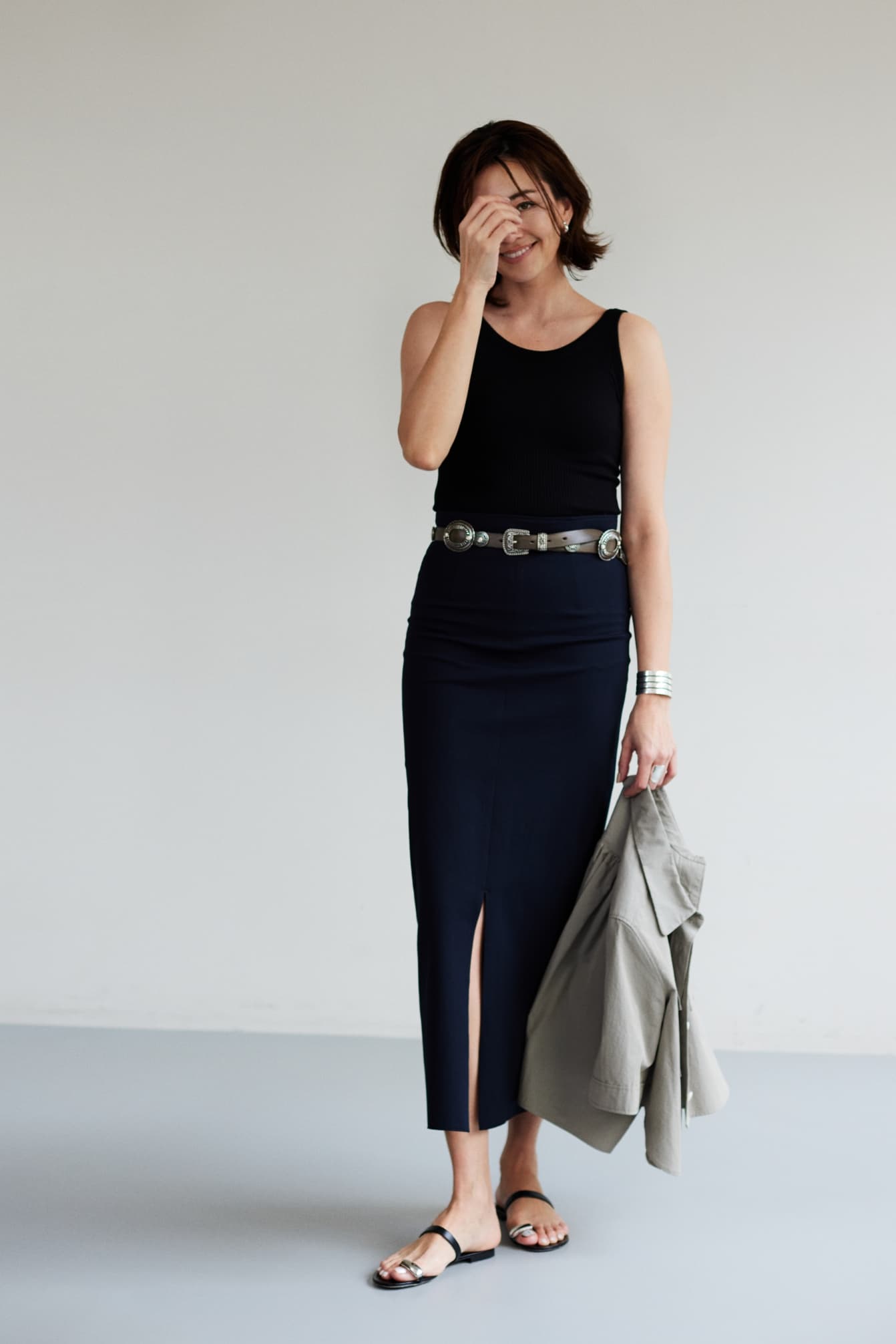 「タイトスカートは体が入ることを前提に、程度なハリ感と伸縮性を持たせて、ぴたぴたし過ぎないよう計算されている一枚。しっかりと丈感があり、前スリットが動きやすさも。近年トップスはオーバーサイズを合わせることが多かったですが、今シーズンはコンパクトなタンクトップとクロップドシャツでボディコンシャスをすっきりと心地よくアップデート」。
