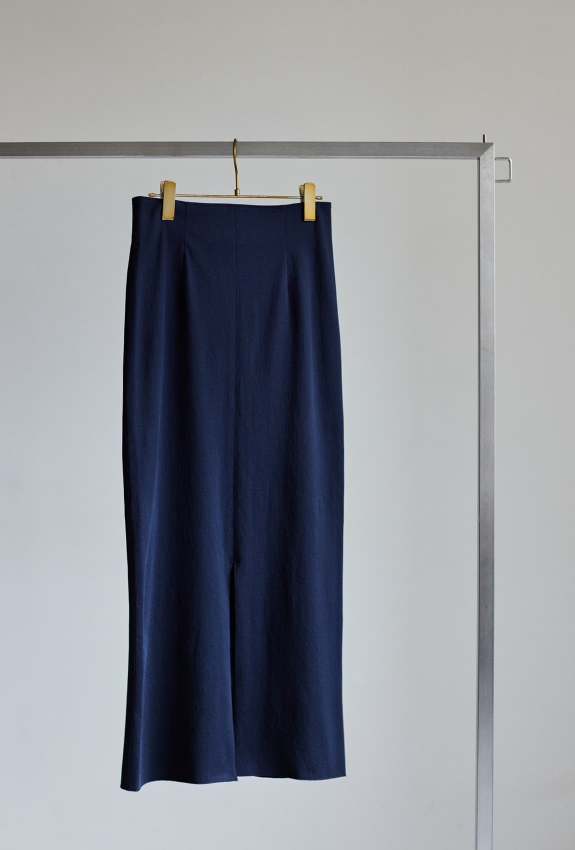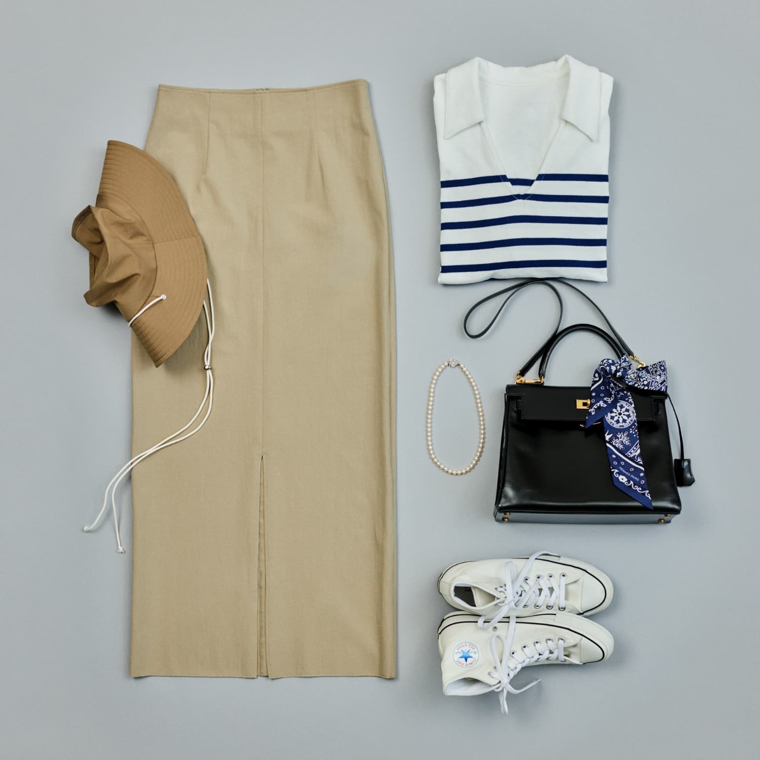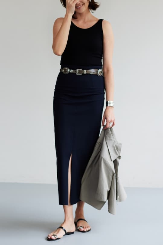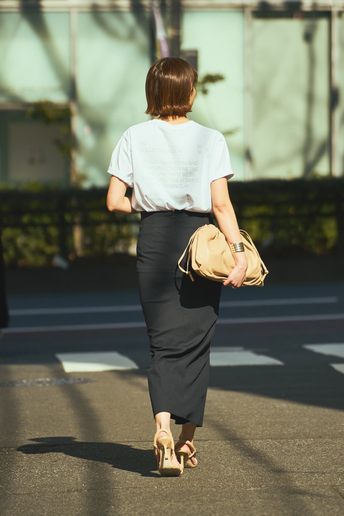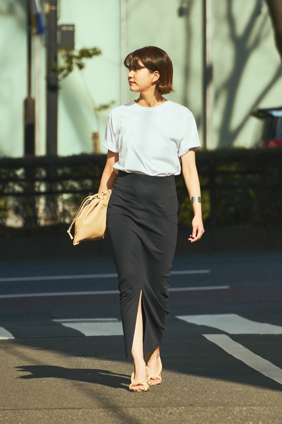 「タイトスカートは体が入ることを前提に、程度なハリ感と伸縮性を持たせて、ぴたぴたし過ぎないよう計算されている一枚。しっかりと丈感があり、前スリットが動きやすさも。近年トップスはオーバーサイズを合わせることが多かったですが、今シーズンはコンパクトなタンクトップとクロップドシャツでボディコンシャスをすっきりと心地よくアップデート」。