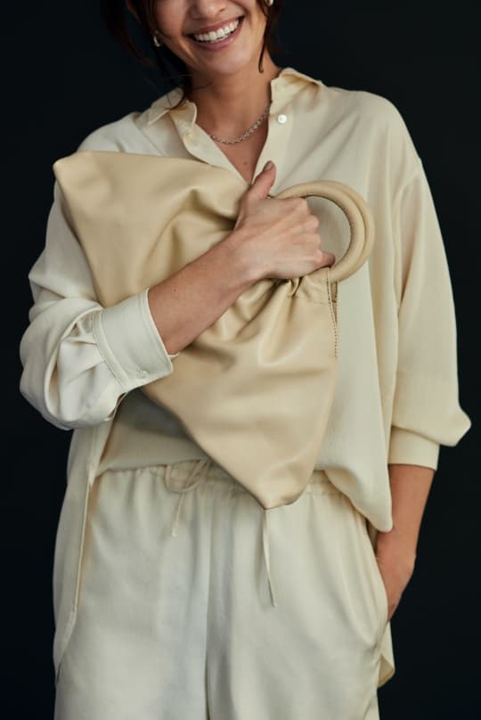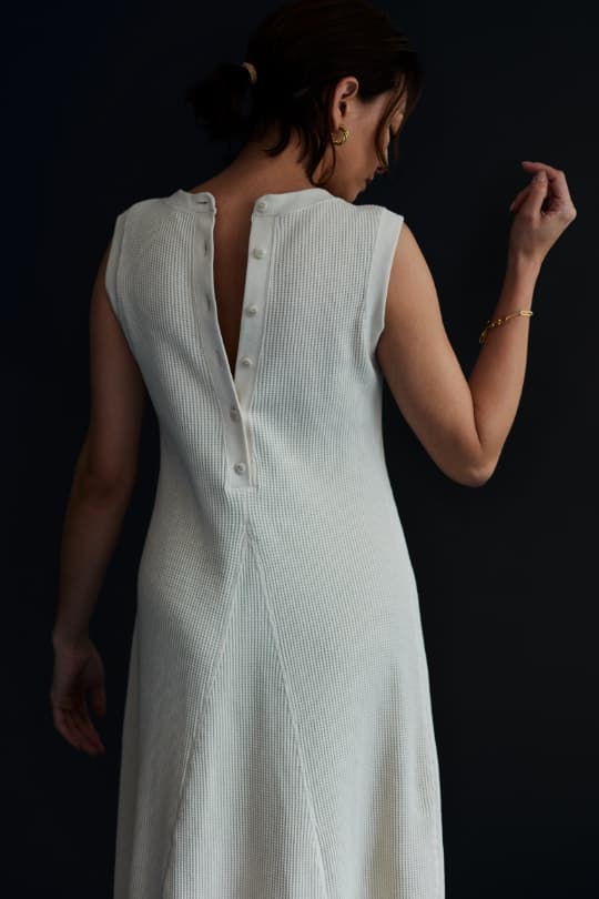 「コットンベースのドライタッチな素材は夏も着やすく、快適。ストレスフリーであることもヘルシー美人の大切な要素。アクティブになれて、心が上向きます」。