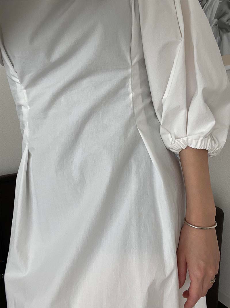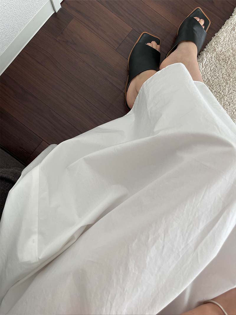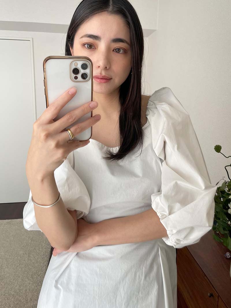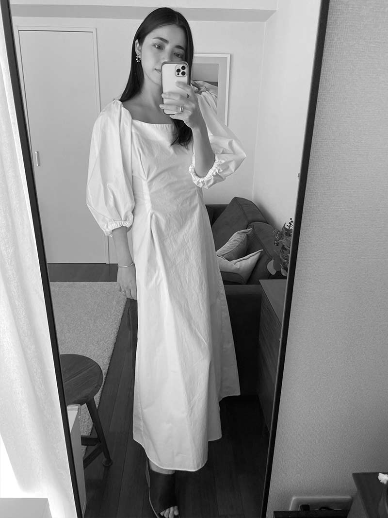 一枚で完成するワンピースには小物もアクセサリーもシンプルに。無駄なものは身に付けず、ワンピースが主役になるようにスタイリング。