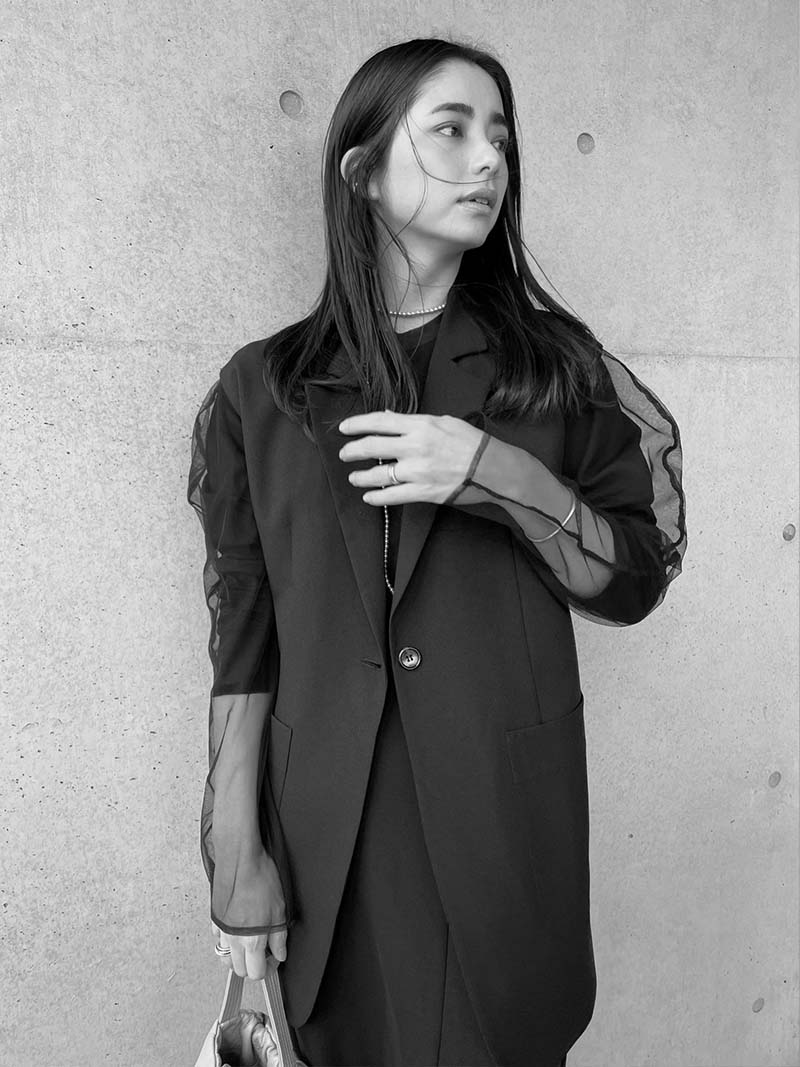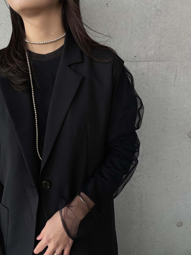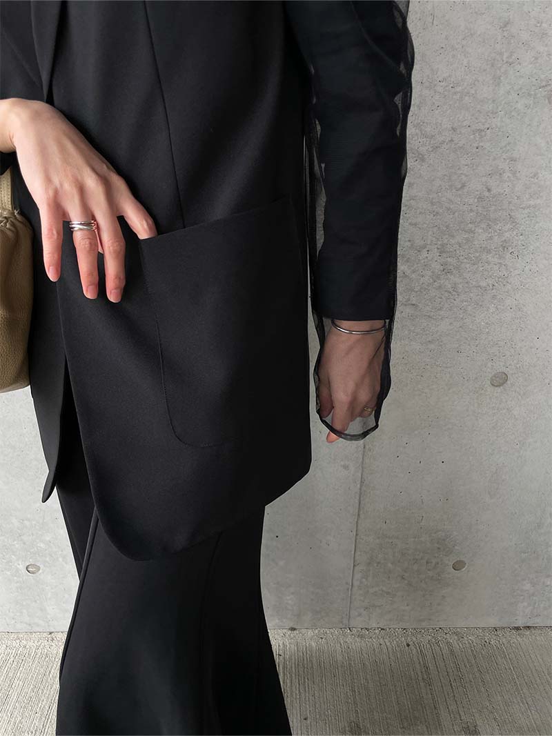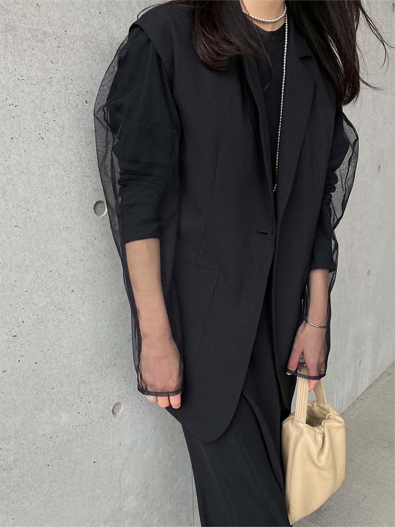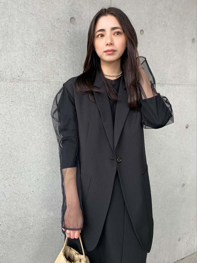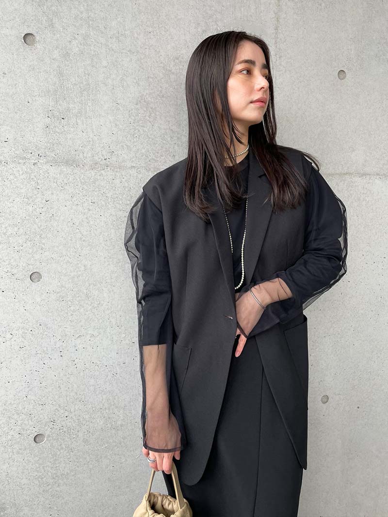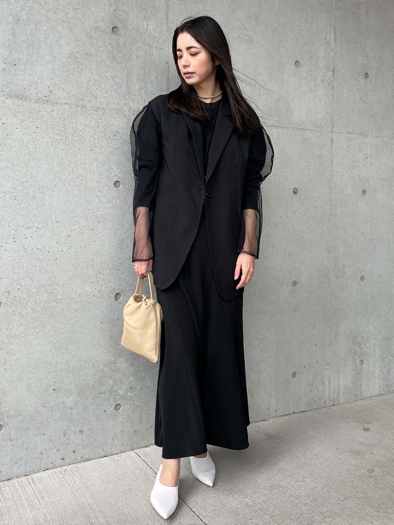 スカートとセットアップ風に。インナートップスの透け感で重たく見えないブラックコーデ。。