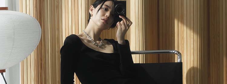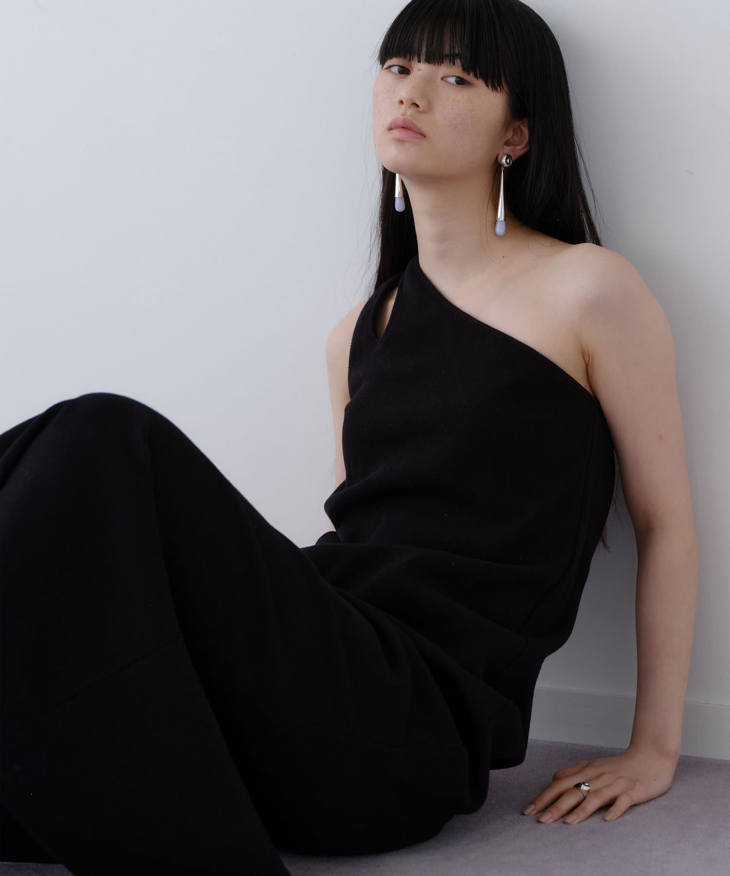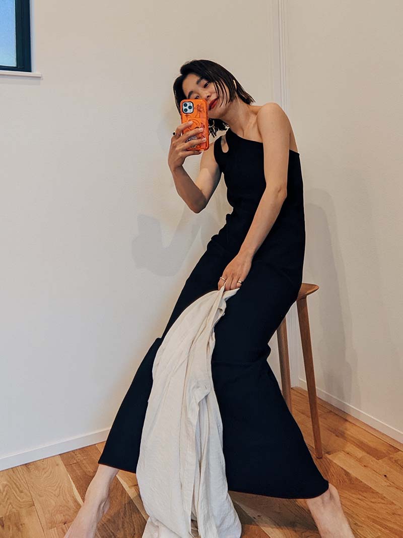 とてもラインが綺麗なワンピースなので合わせるアイテムは派手にせず、