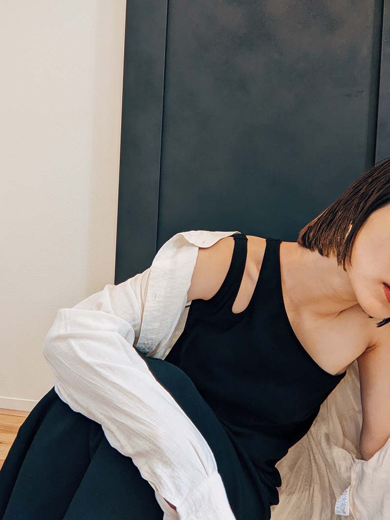 ワンピが引き立つように薄手のカジュアルシャツとコーデしました。