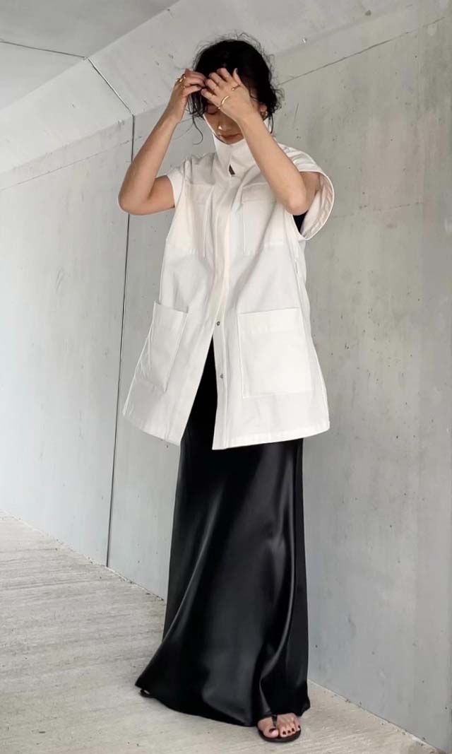 あえて引きずるようなサイズ感のスカートとレイヤードして全体的に緩く。
