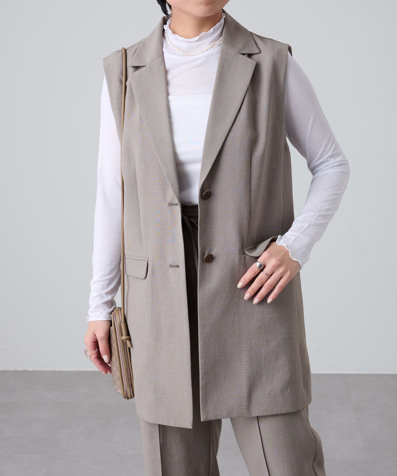 麻見えするテックリネン素材のジレ。1枚羽織るだけでトレンドライクなスタイリングが完成します!シンプルなデザインでどんなアイテムとも合わせやすく様々なレイヤードスタイルにマッチ◎シワがつきにくくおうちで洗濯できるのがテックリネンの魅力です!着回しコーディネートやセットアップ商品もご紹介します。