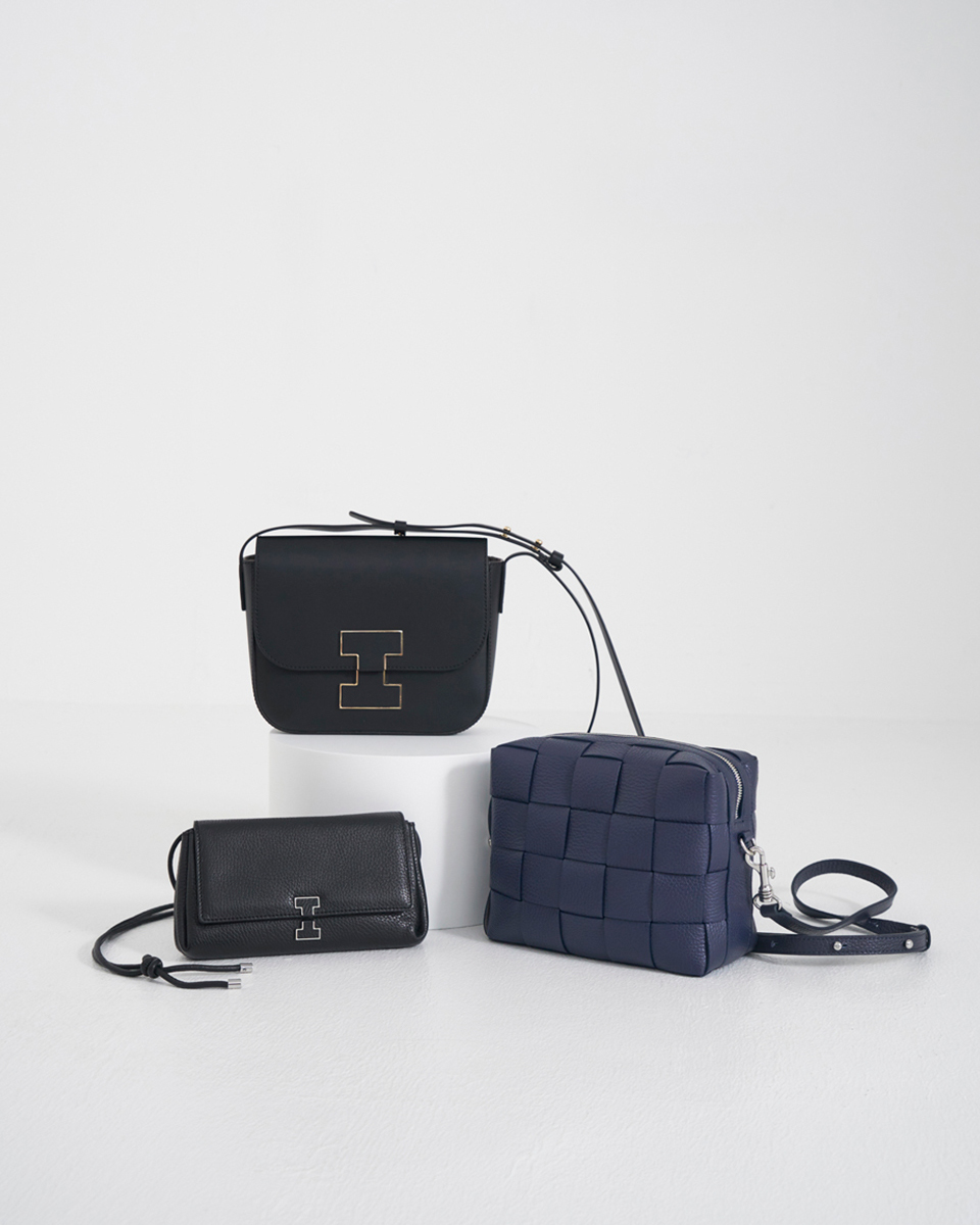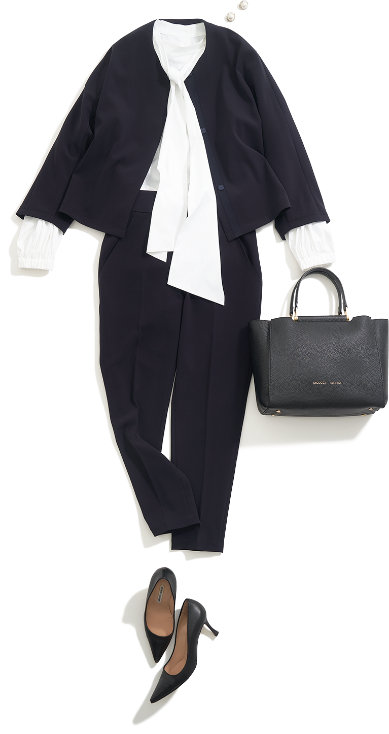 「きちんと感のあるセットアップには、ボウタイやノーカラーデザインで優しさを。同じテンションのバッグで印象は崩さず、セットアップの滑らかな生地と合わせる際に抑揚がつくよう、表面感のあるシボ革で全体を引き締めました。シンプルなフォルムにゴールドのパーツがアクセサリーのような華やかさを与え、シックなセレモニーコーデに彩りを加えてくれます」